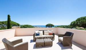In einem gesicherten Bereich und 10 Gehminuten von den Stränden von Sainte-Maxime entfernt bietet dieses Familienhaus einen Meerblick auf den Golf von Saint-Tropez und die Hügel von Grimaud.