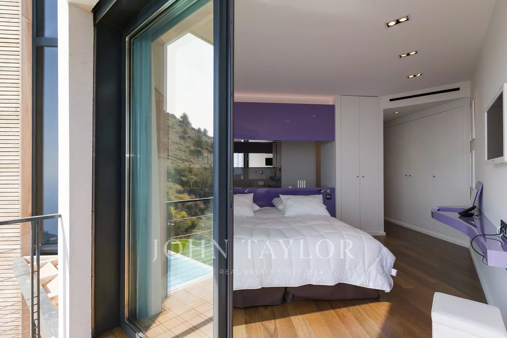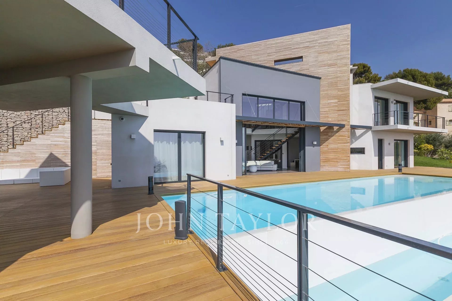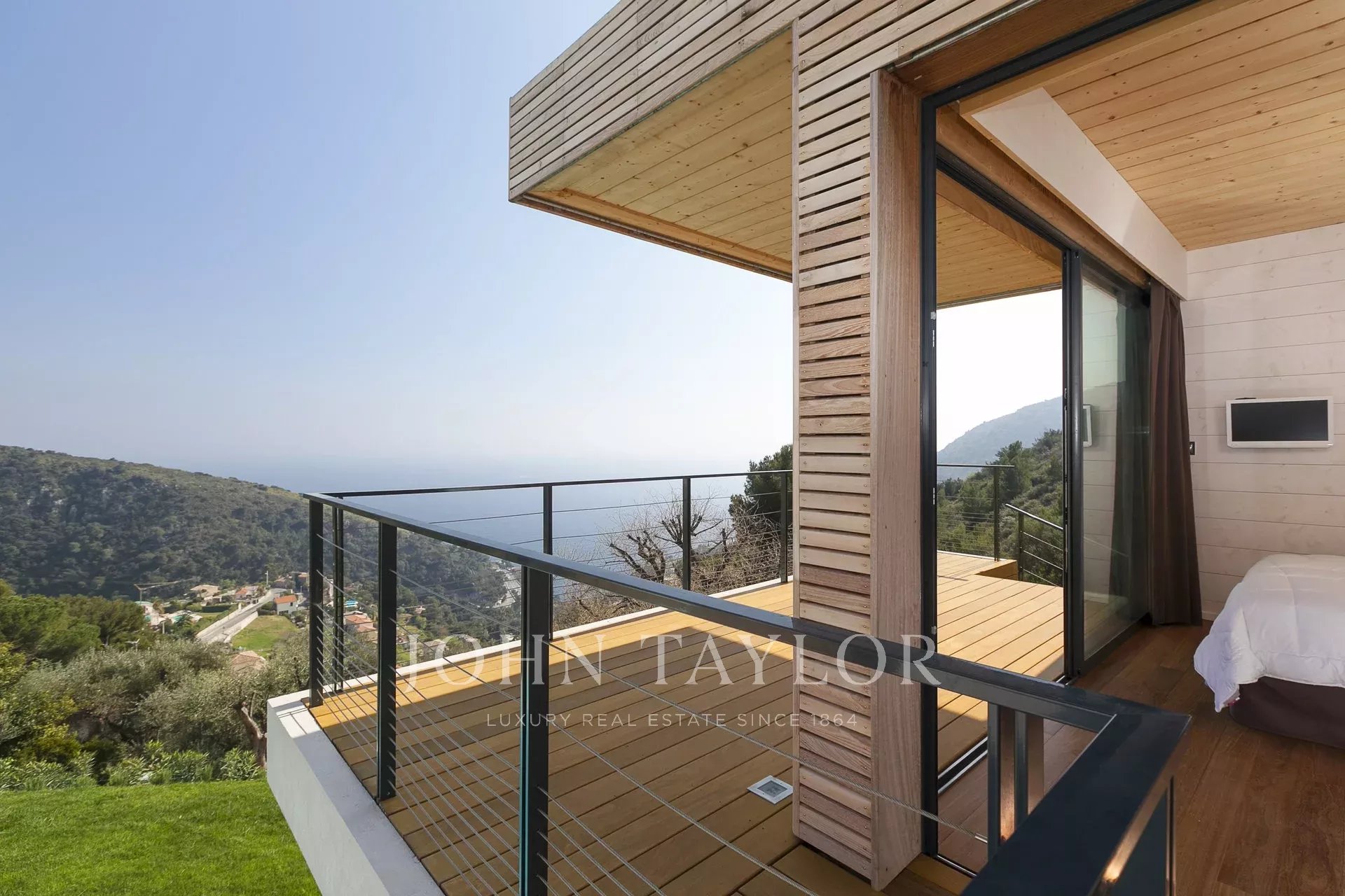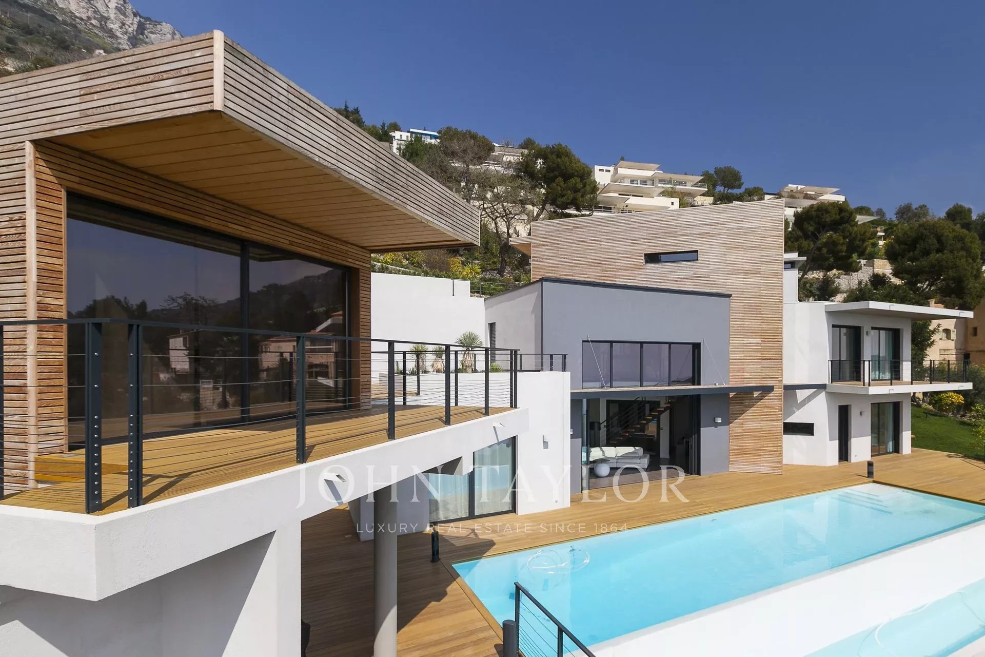 Wunderschöne moderne Villa mit einer Wohnfläche von ca. 350 m² auf einem Grundstück von ca. 2.200 m², auf den Höhen von Eze in einem Wohngebiet gelegen, mit einem herrlichen Blick auf das Meer und die Hügel. Die Villa besteht aus 5 Schlafzimmern, jedes mit eigenem Bad oder Dusche, einem Wohnzimmer mit Zugang zu einer großen Terrasse mit beheiztem Pool, einem Essbereich, einer voll ausgestatteten Küche mit semiprofessionellem Hauswirtschaftsraum. Gästepavillon mit einem Schlafzimmer und eigenem Duschbad.