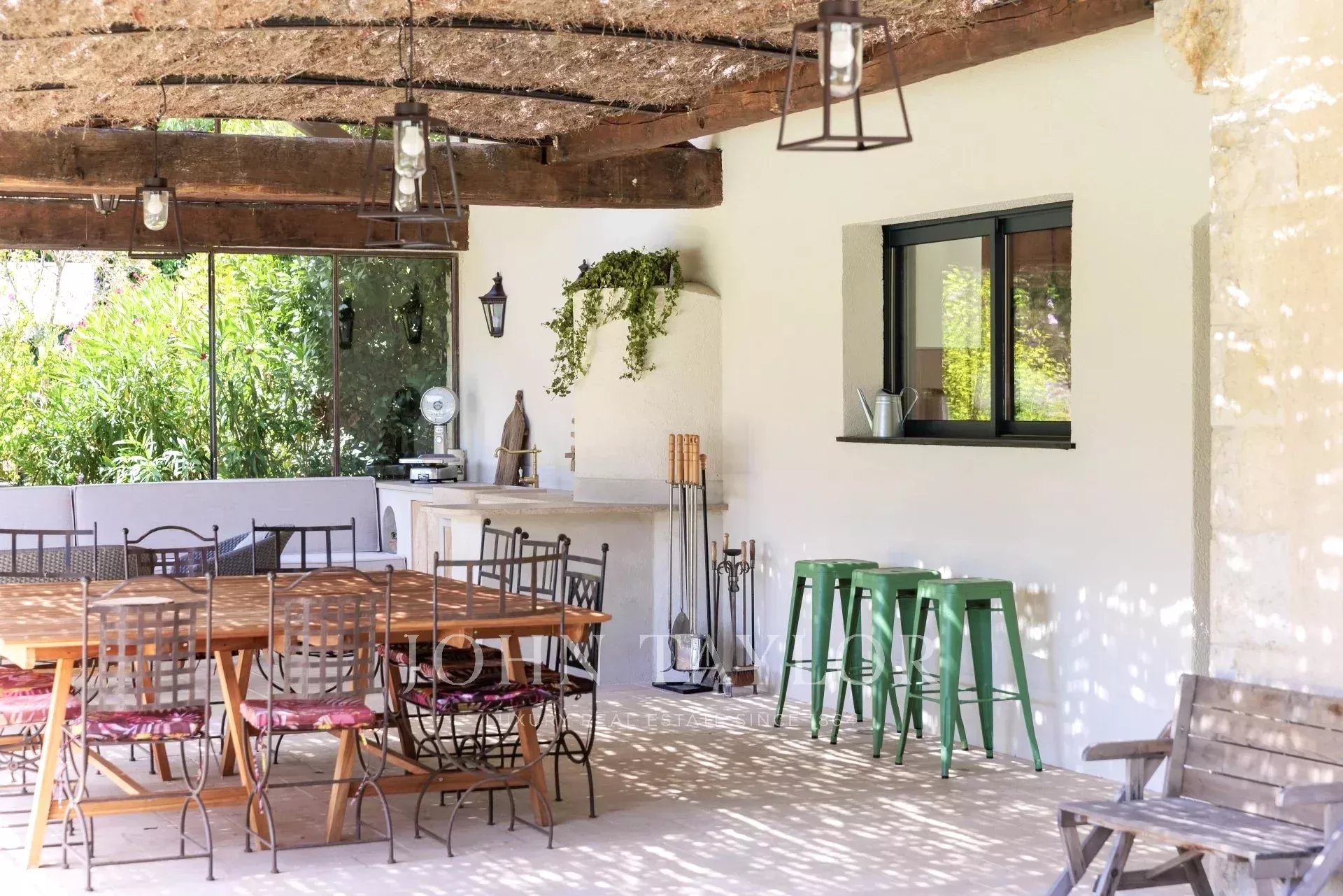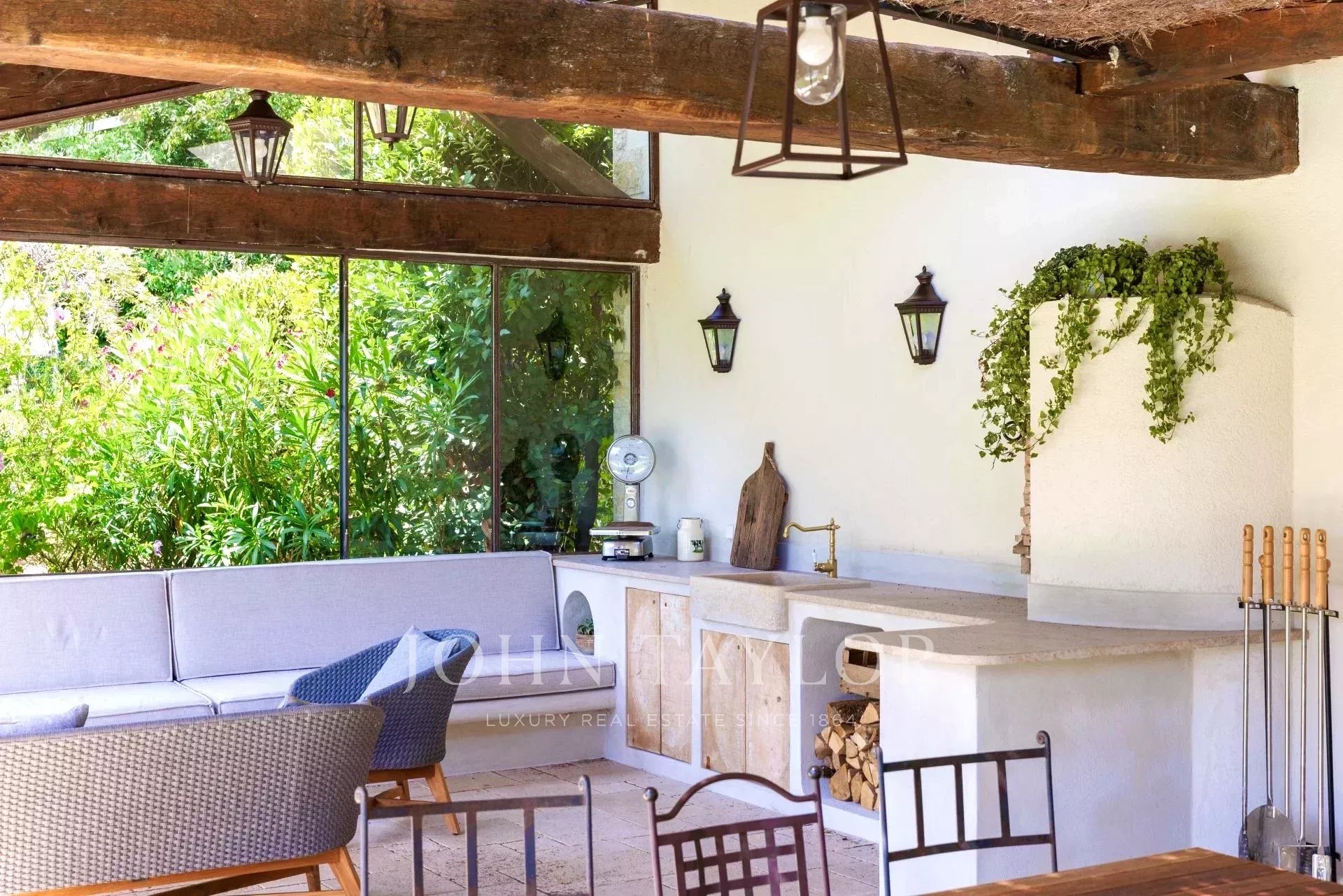 Im Erdgeschoss haben Sie Zugang zu einer großen, möblierten Terrasse mit einer voll ausgestatteten Außenküche. Ein großer Tisch lädt Sie dazu ein, Ihre Mahlzeiten im Schatten der Pergola zu teilen und dabei den beruhigenden Blick auf den Wald zu genießen.