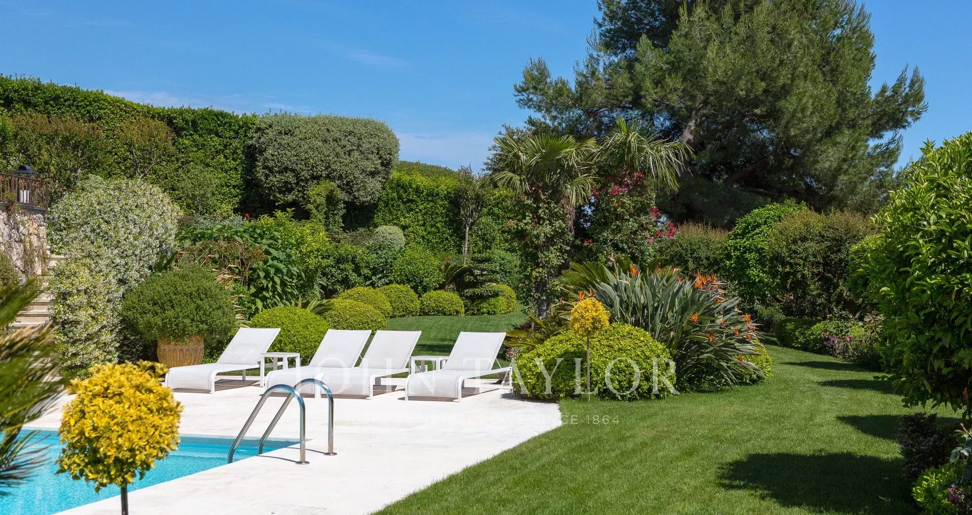 Eingebettet in einen wunderschön gepflegten Landschaftsgarten ist die Villa von mediterranen Baumarten und üppiger Natur umgeben.