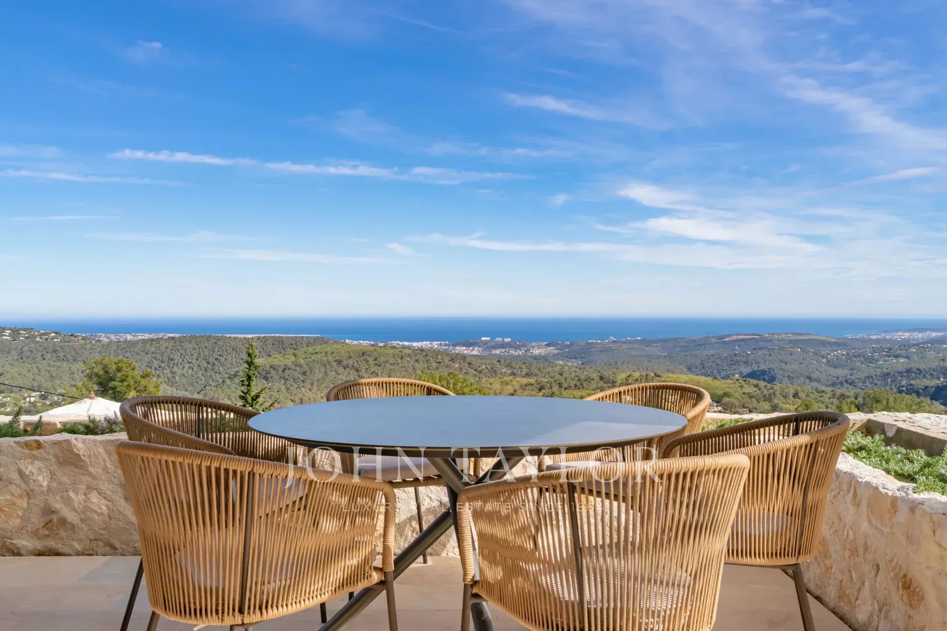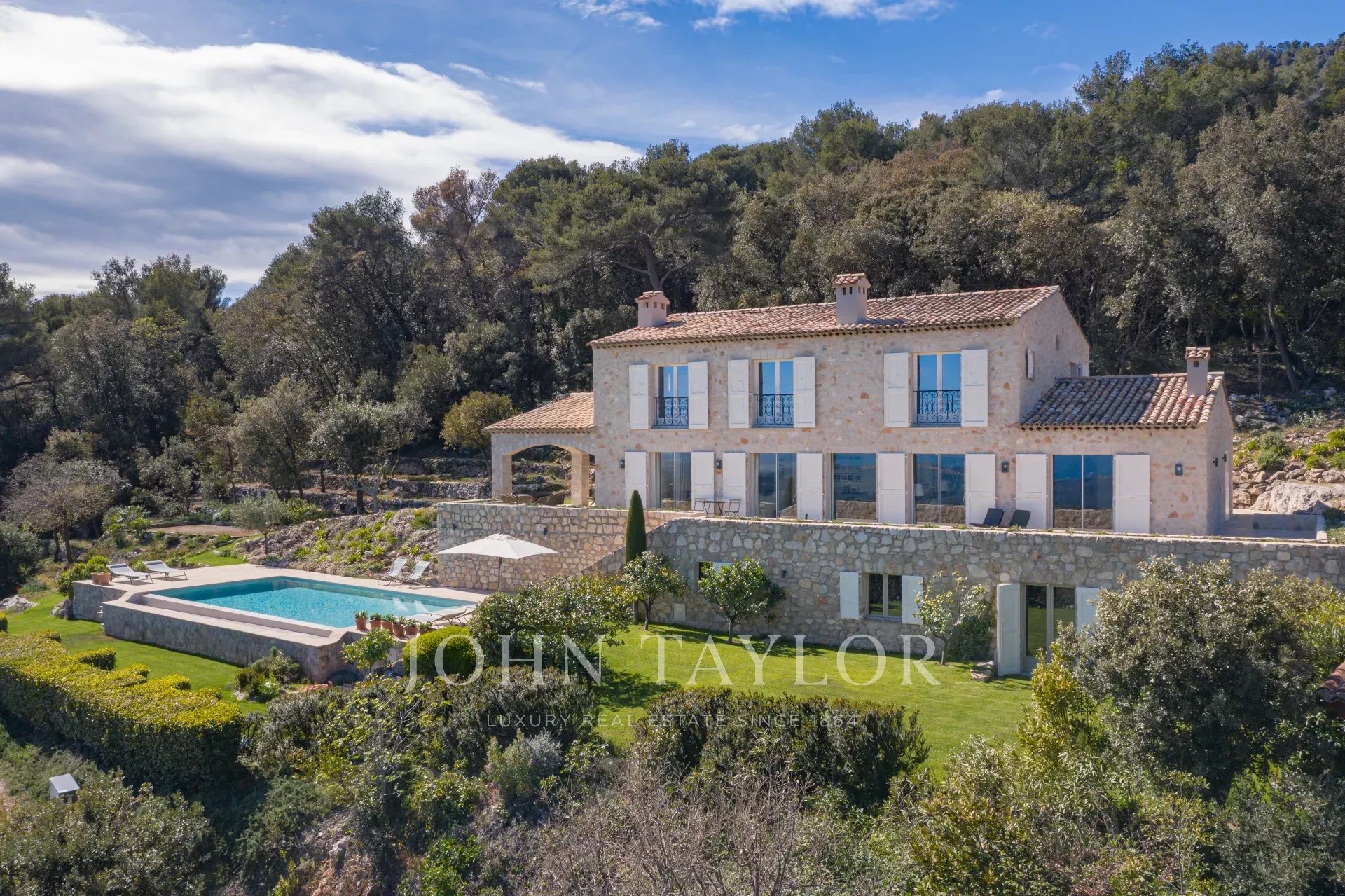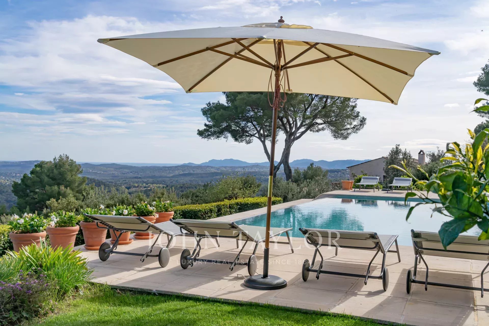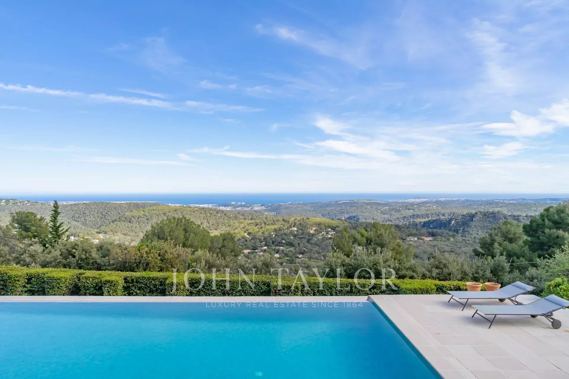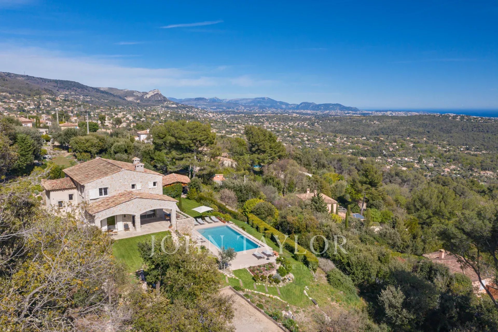 In Tourrettes sur Loup, mit herrlichem Blick auf das Meer und die umliegende Landschaft, befindet sich dieses schöne, neu erbaute Anwesen mit einer Wohnfläche von 320 m² auf einem 4000 m² großen Grundstück mit Infinity-Pool.