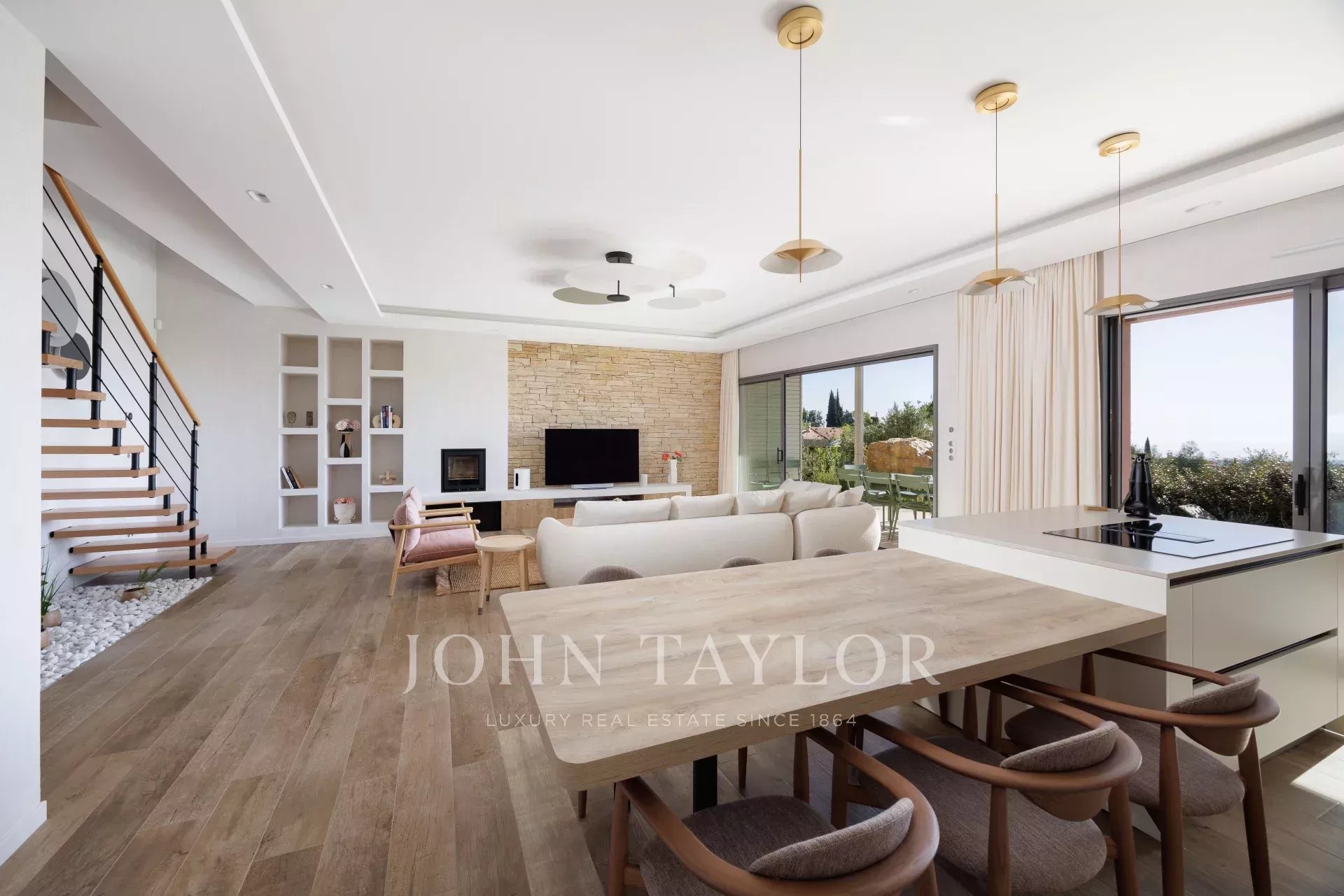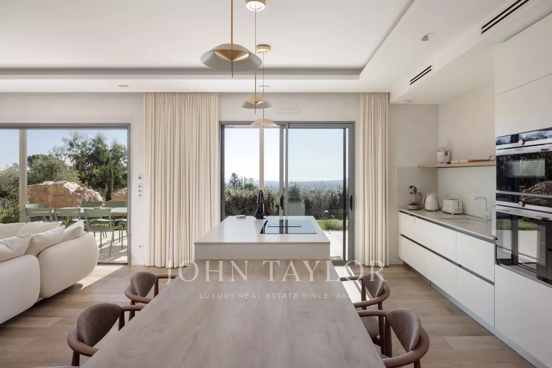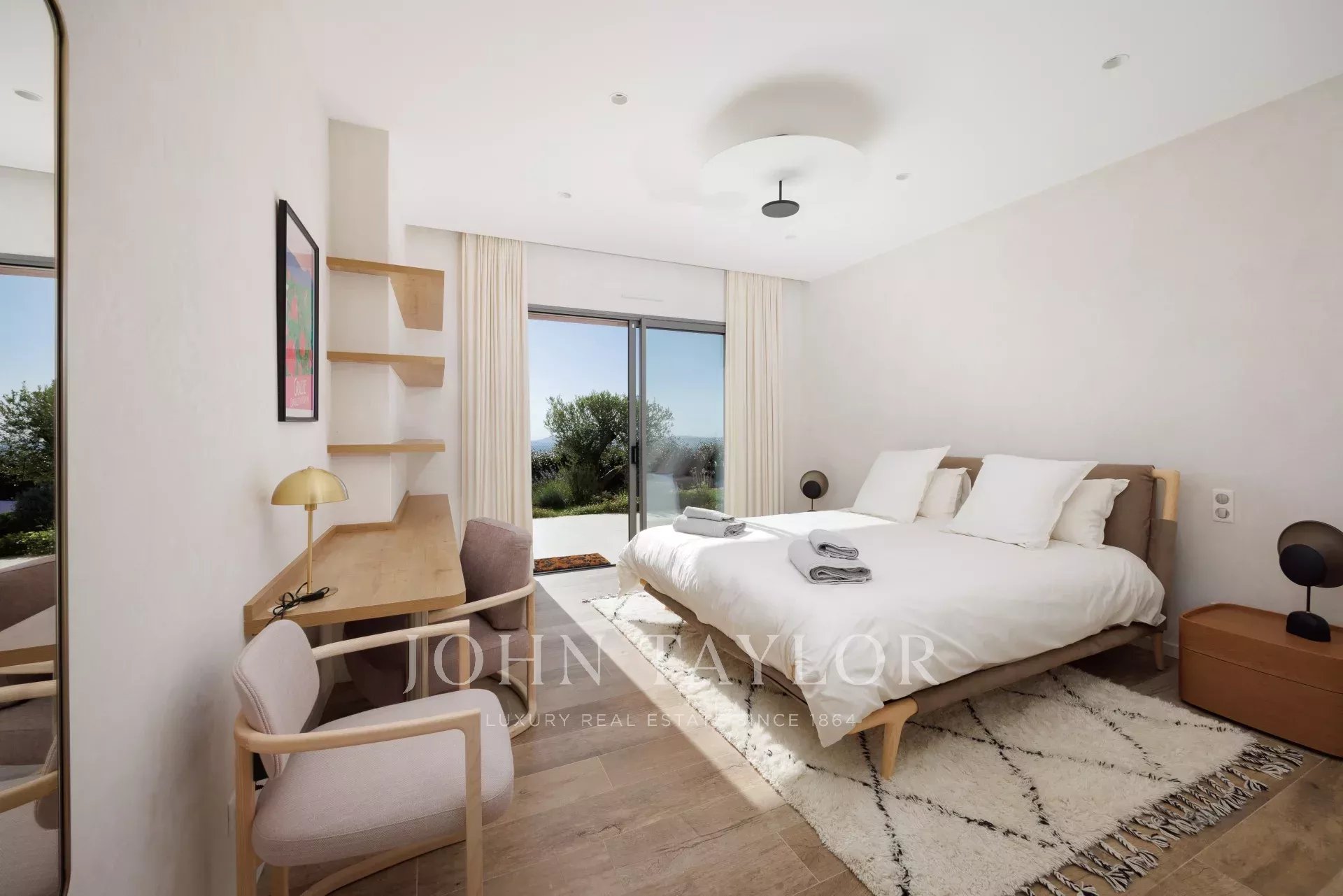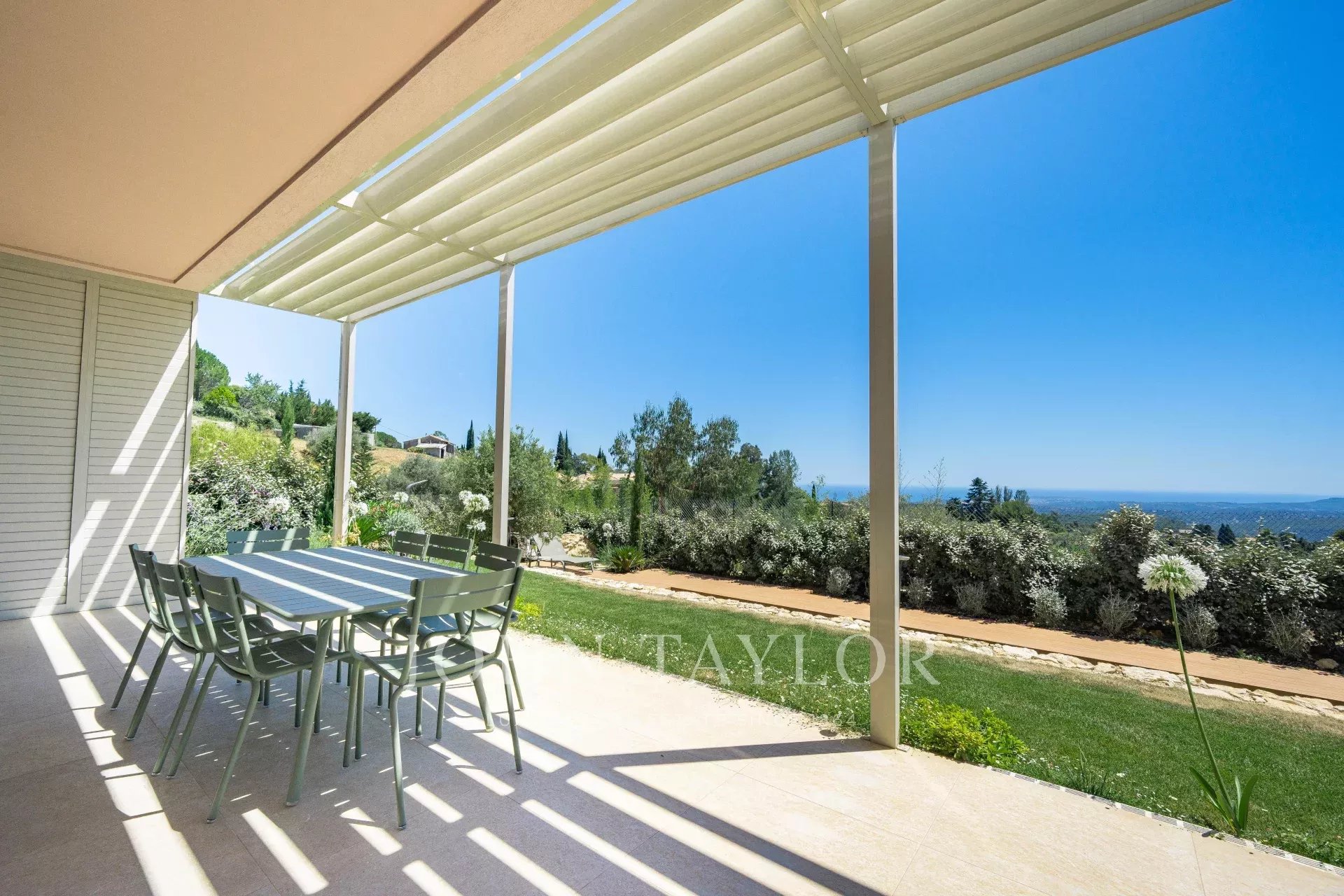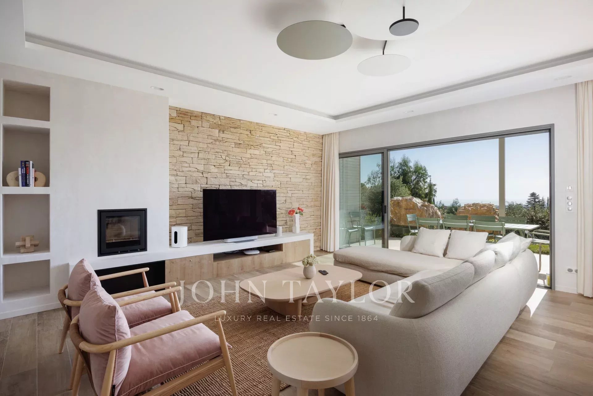 Die kalifornische Villa bietet einen Postkartenblick auf das Meer und befindet sich in der Nähe des charmanten Dorfes Tourrettes-sur-Loup in einer ruhigen Wohngegend.