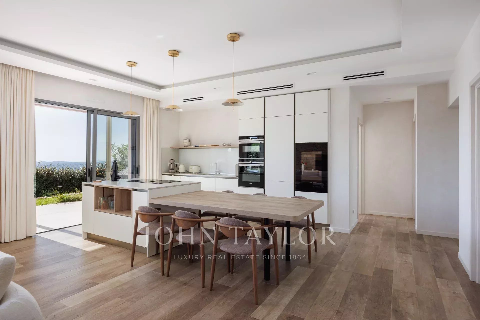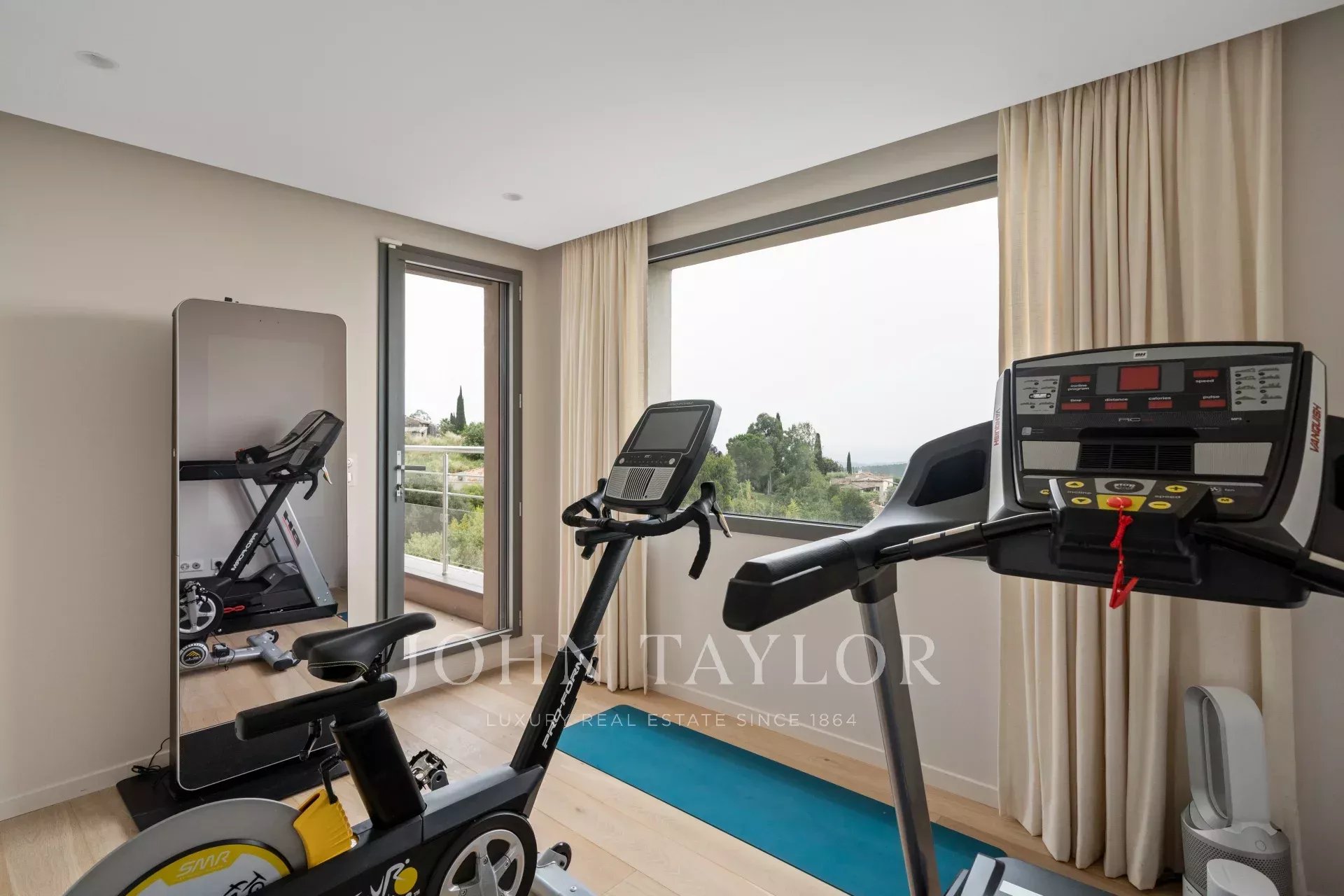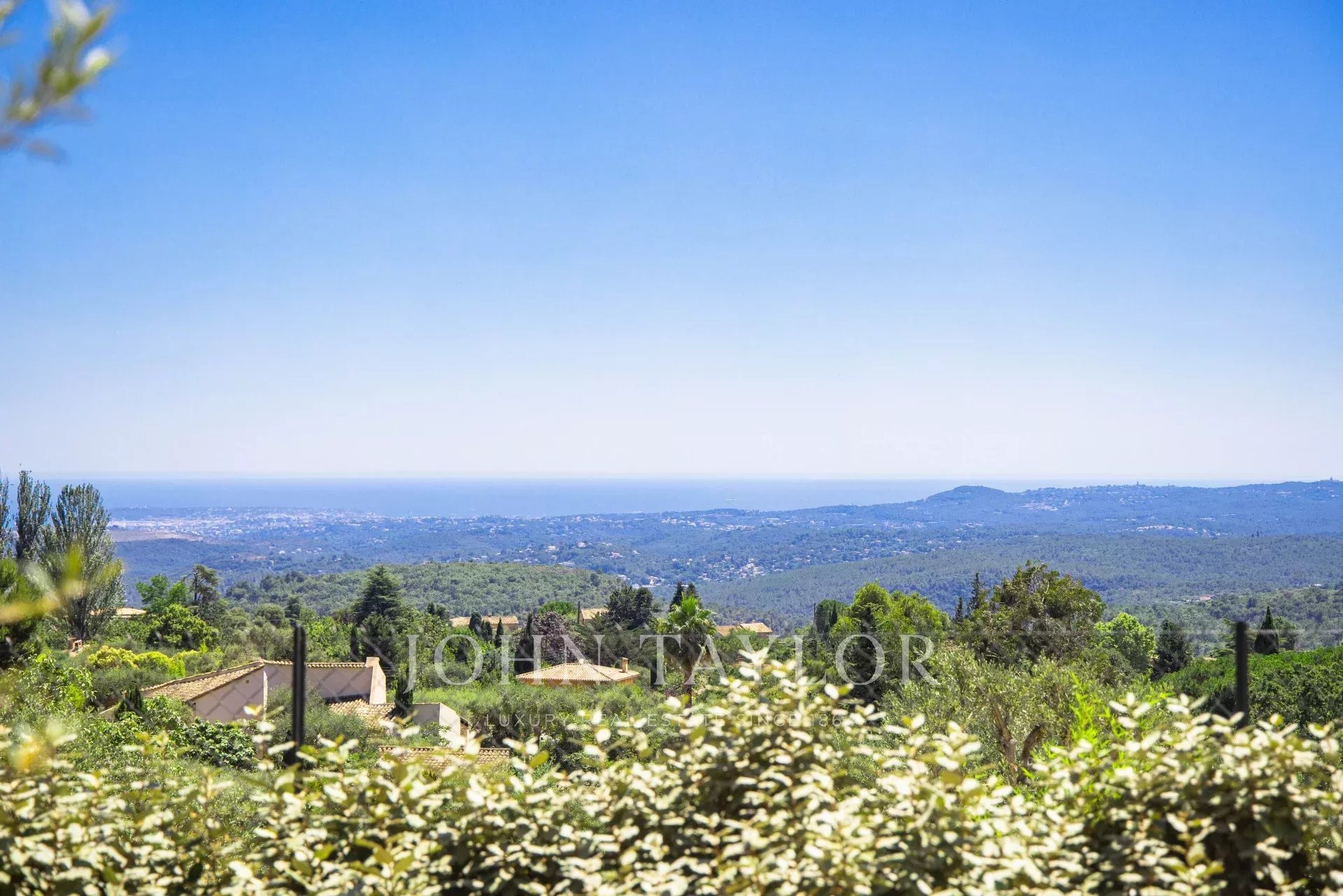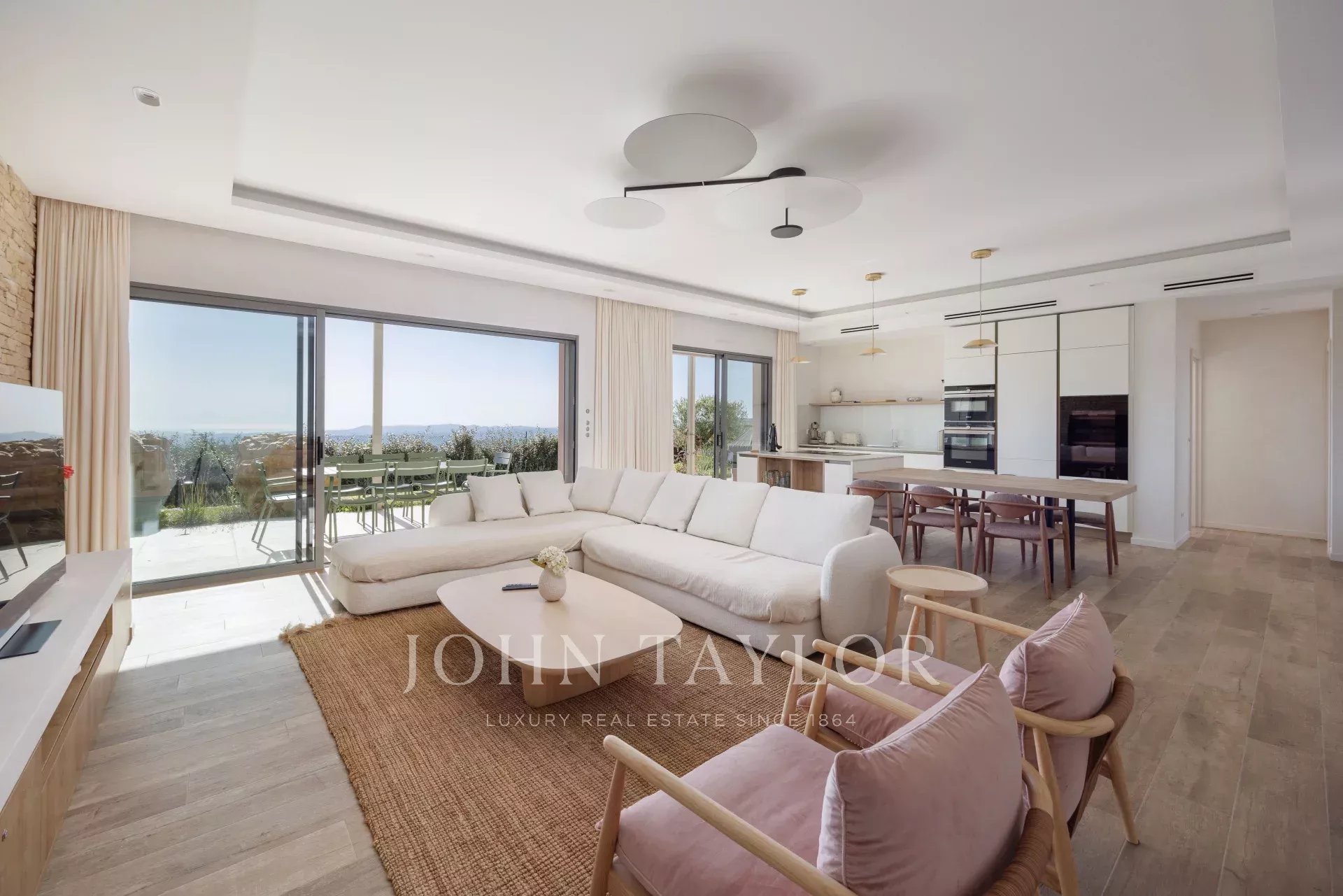 Die kalifornische Villa bietet einen Postkartenblick auf das Meer und befindet sich in der Nähe des charmanten Dorfes Tourrettes-sur-Loup in einer ruhigen Wohngegend.