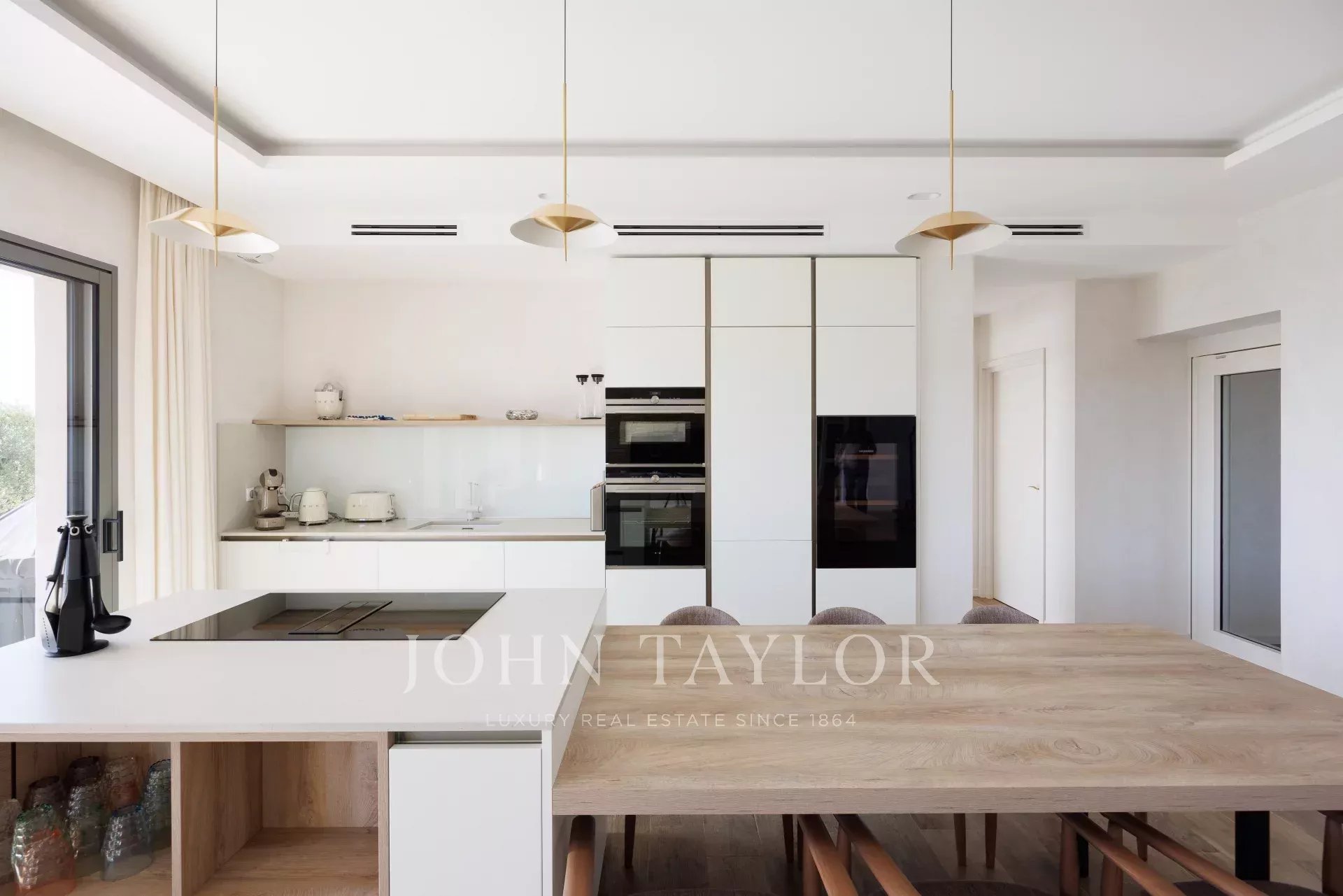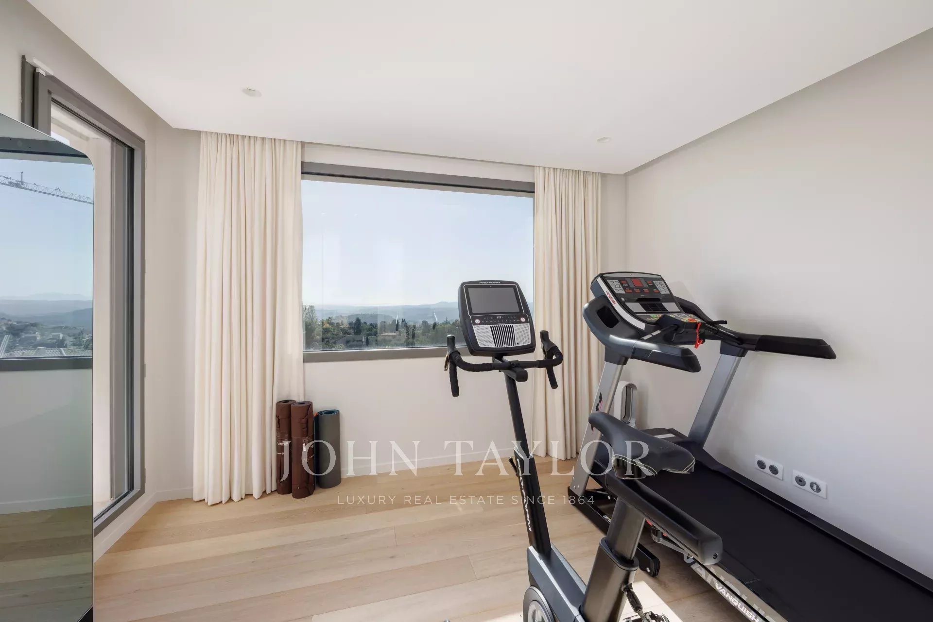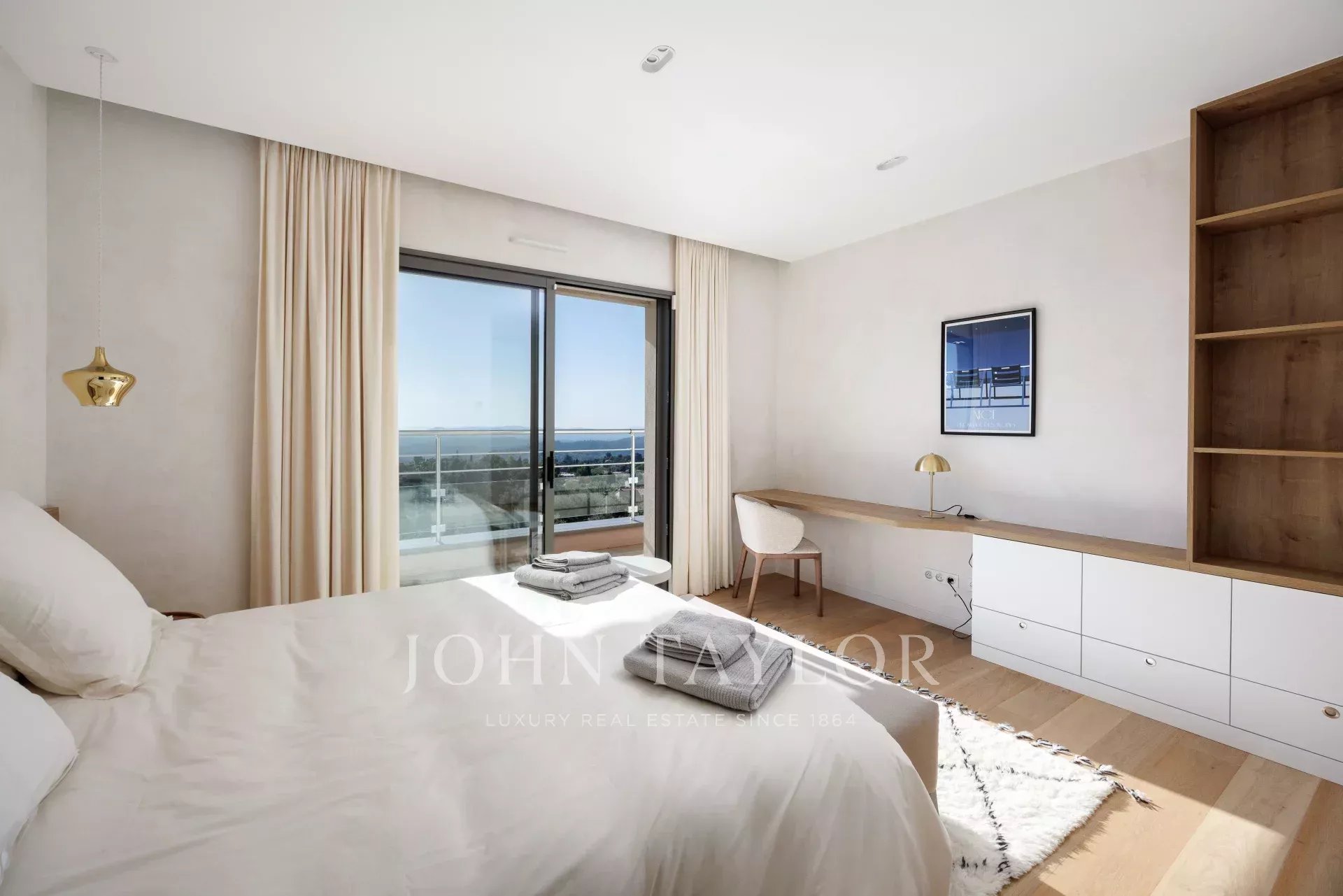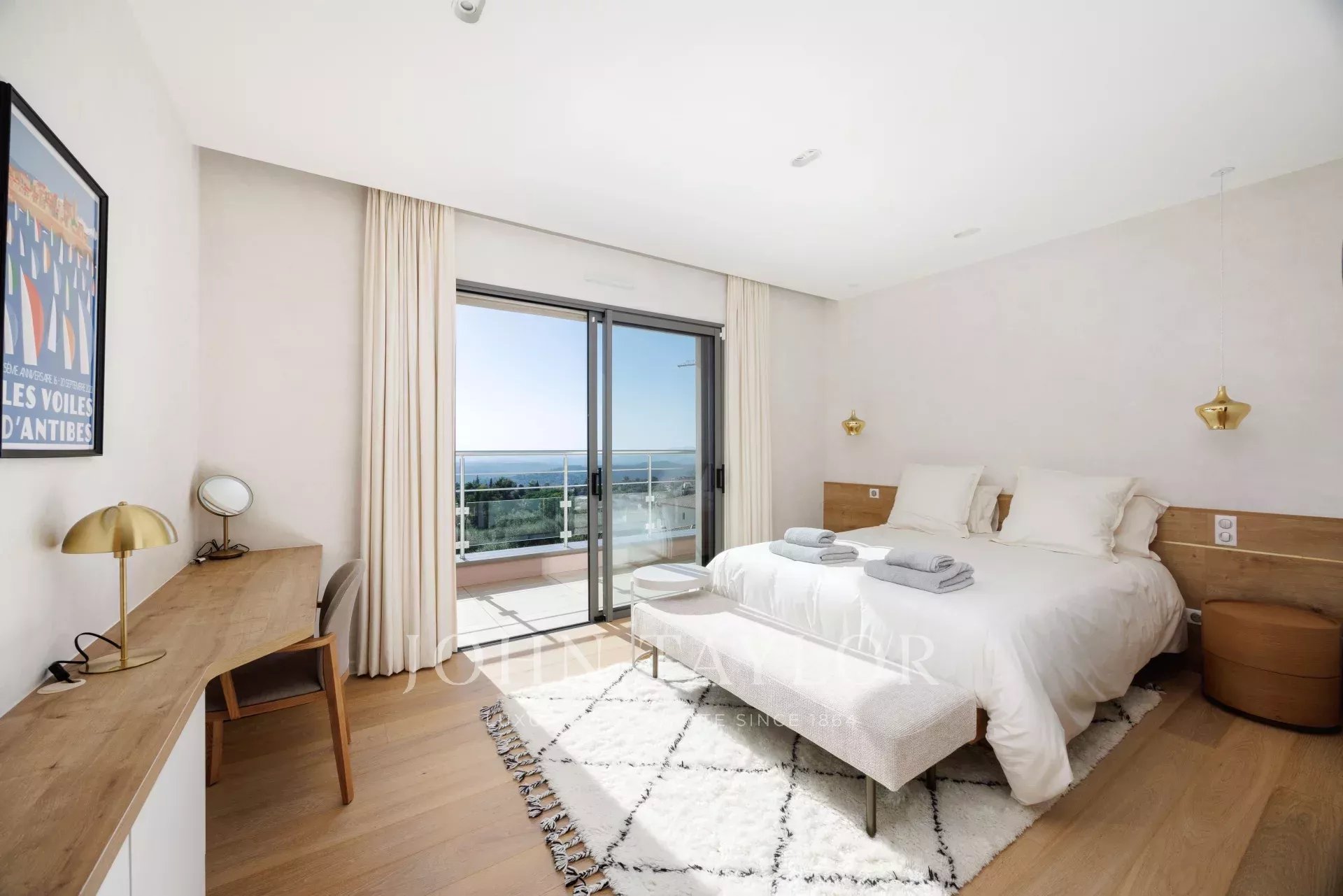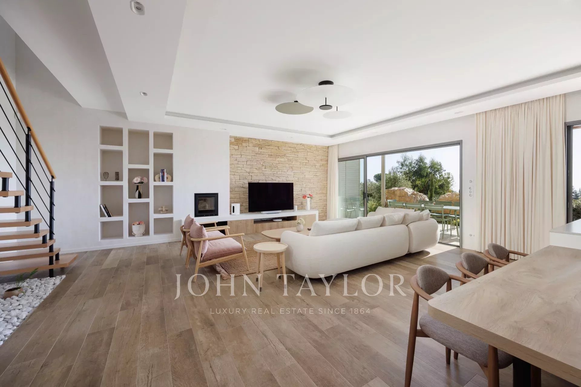Die kalifornische Villa bietet einen Postkartenblick auf das Meer und befindet sich in der Nähe des charmanten Dorfes Tourrettes-sur-Loup in einer ruhigen Wohngegend.