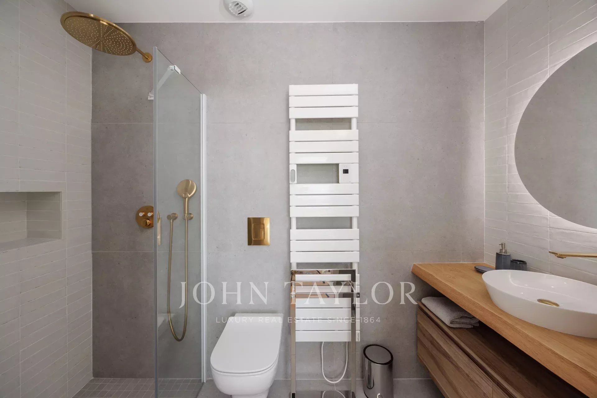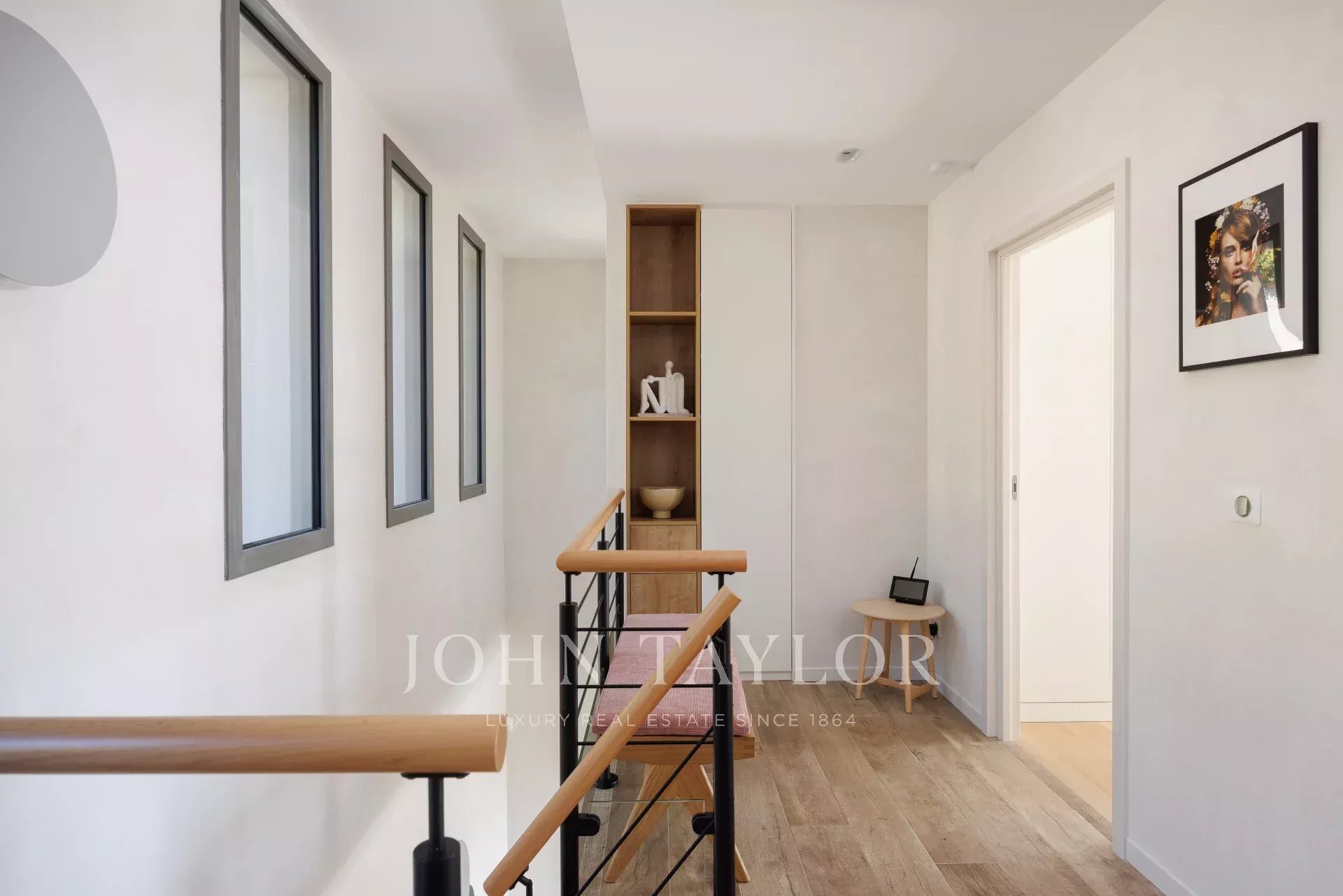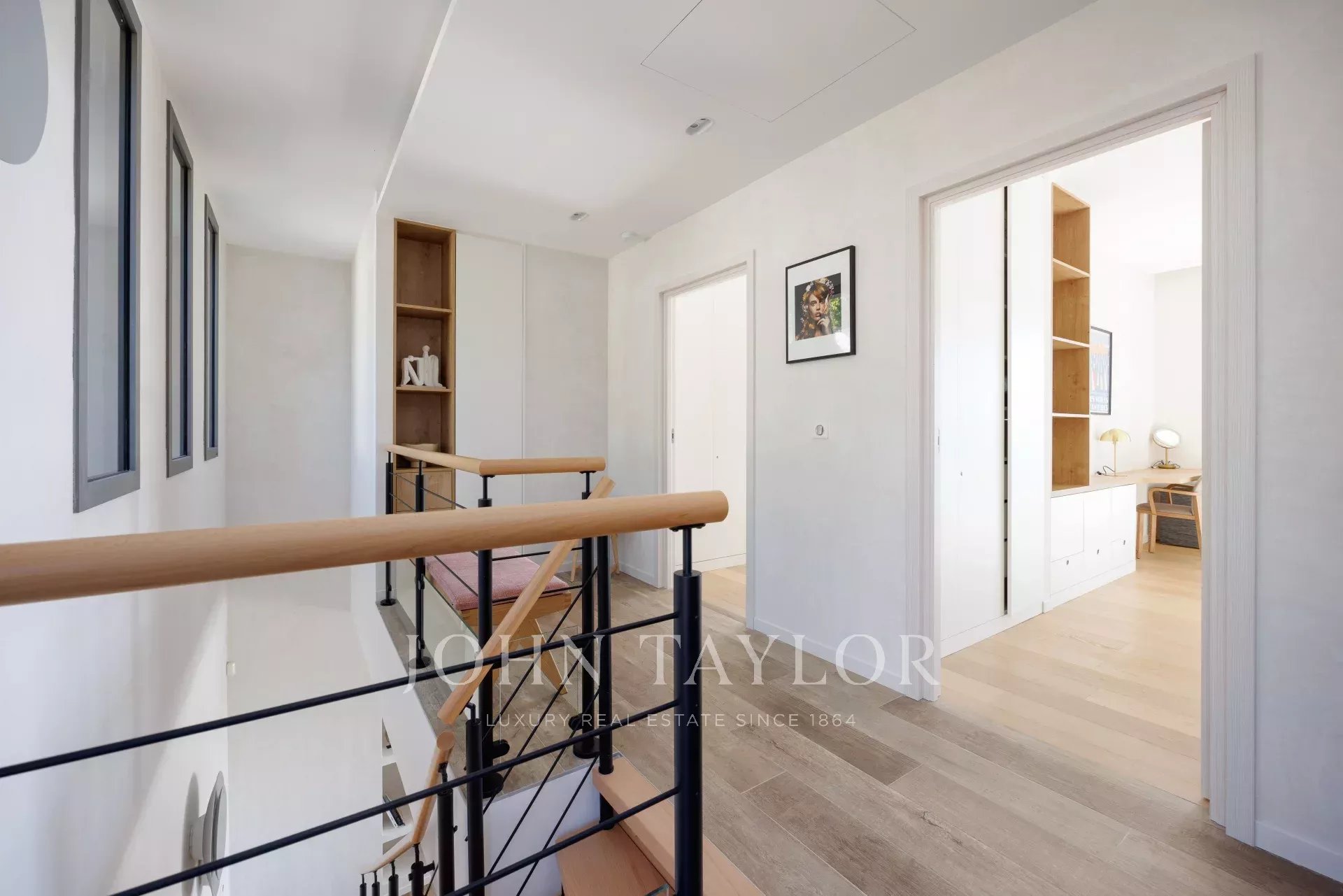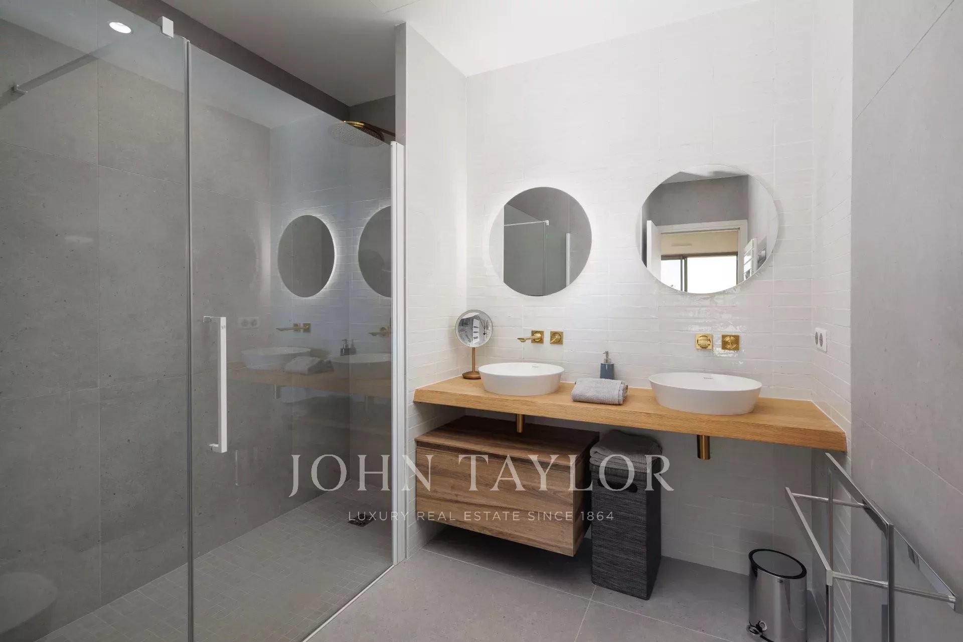 Mit einer Wohnfläche von 152 m² ist diese moderne und helle Villa ideal für einen Aufenthalt mit der Familie oder Freunden im Hinterland von Nizza. Im Gartengeschoss befindet sich eine große, voll ausgestattete Küche, die sich zu einem großen, geselligen Wohnzimmer öffnet, das direkten Zugang zu einer möblierten Terrasse bietet. Es verfügt über drei klimatisierte Schlafzimmer, jedes mit eigenem begehbarem Duschbad und Ankleidezimmer: ein Schlafzimmer im Gartengeschoss mit Zugang zur Terrasse und zwei Schlafzimmer im Obergeschoss.