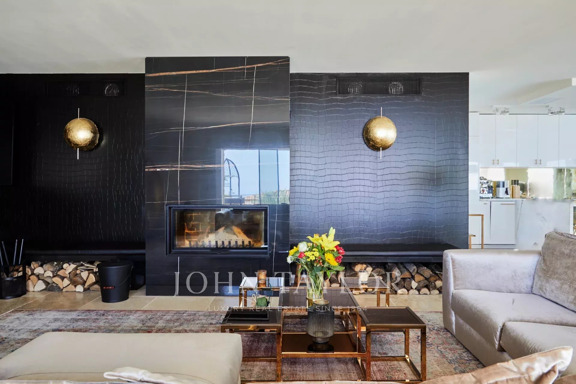 Das Wohnzimmer ist mit einer wunderschönen Glasecke lichtdurchflutet und befindet sich in der Verlängerung der voll ausgestatteten Küche mit zentraler Insel.
