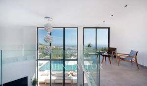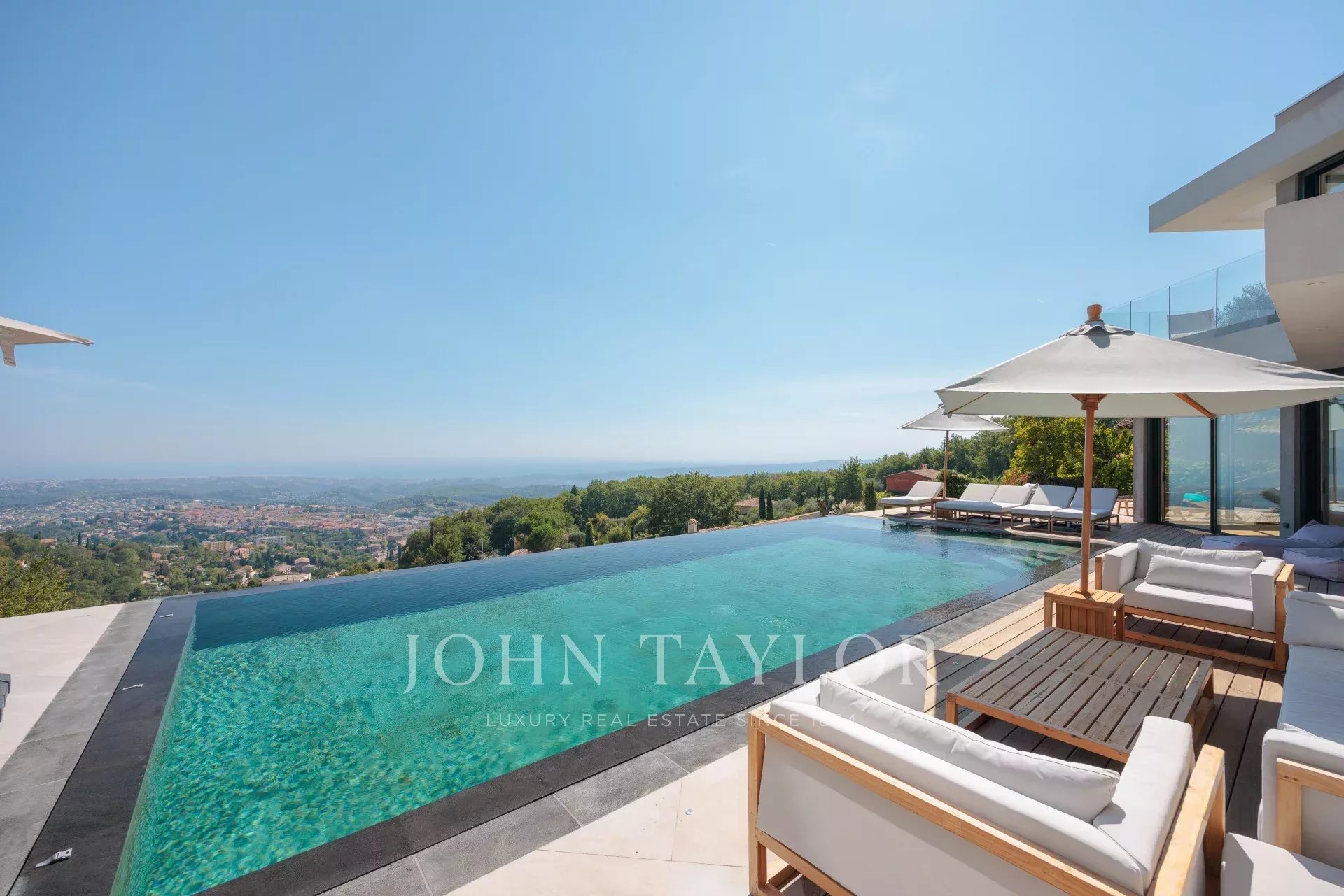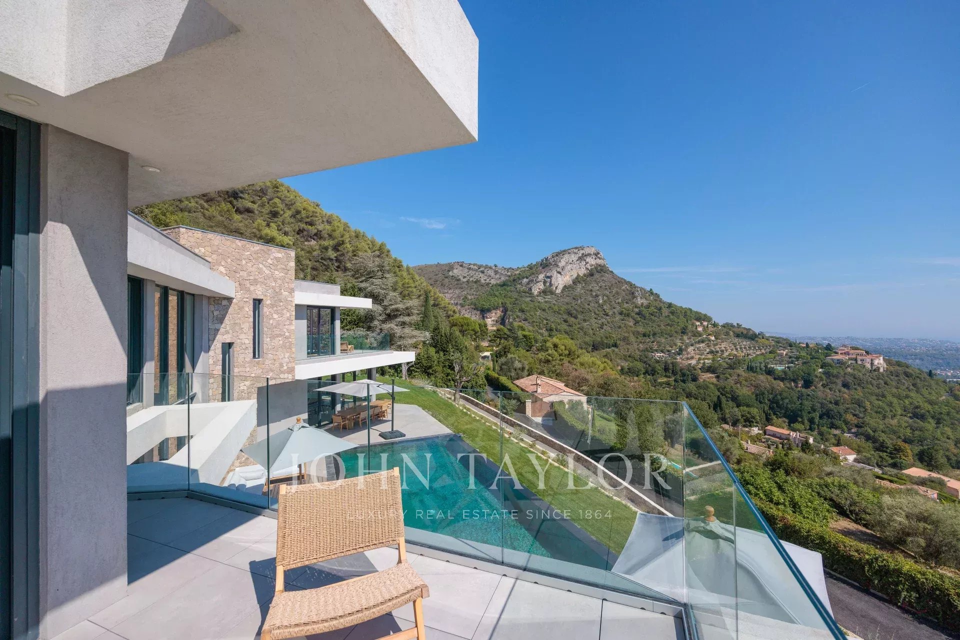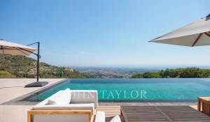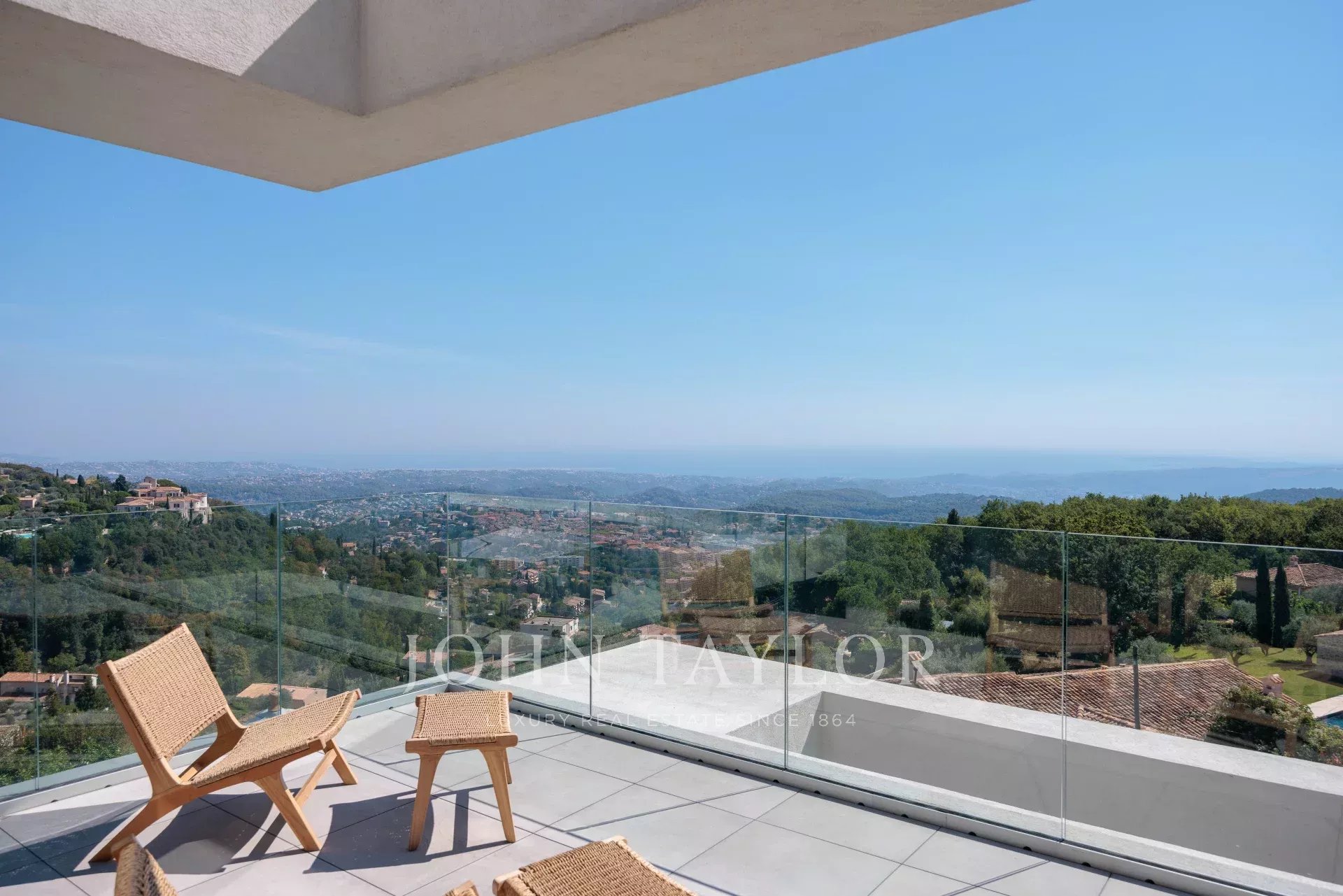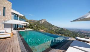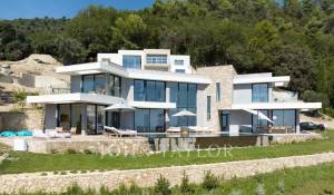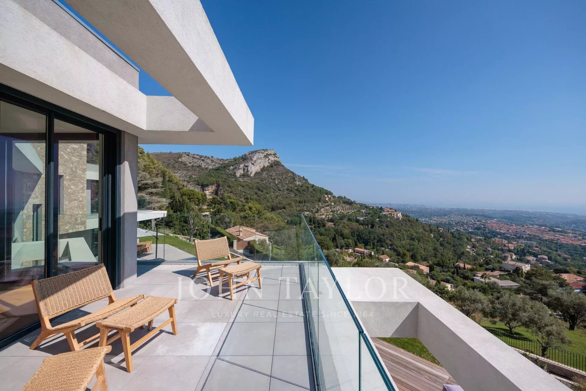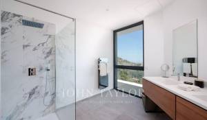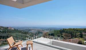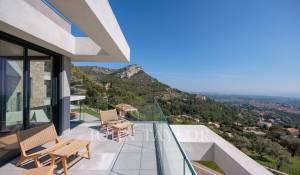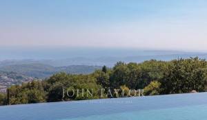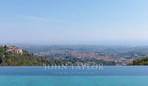 Diese herrliche 400m2 große Villa wurde vor kurzem auf einem 4000m2 großen Grundstück erbaut und liegt ideal auf den Anhöhen von Vence. Jedes Zimmer des Hauses und die große Terrasse bieten einen Blick auf das Meer (Cap d'Antibes, Baie des Anges, Cap Ferrat) und die umliegenden Berge (Baous, Esterel).