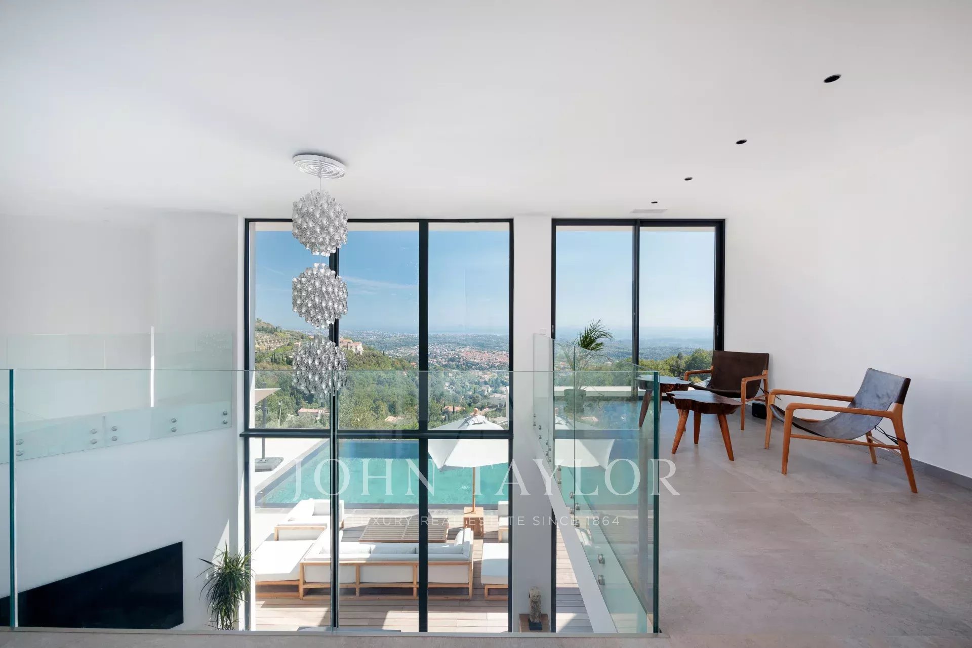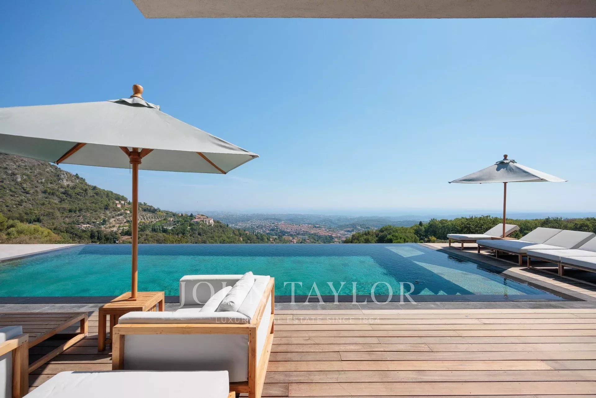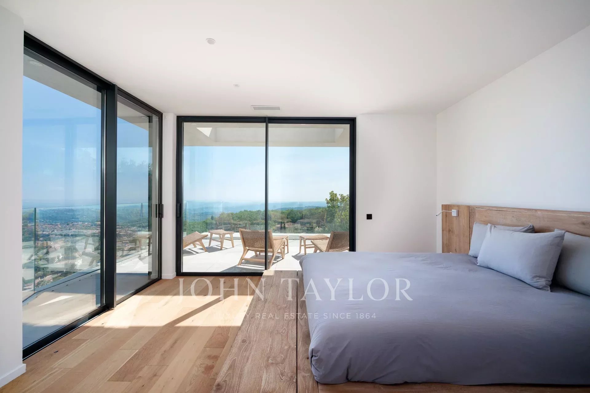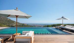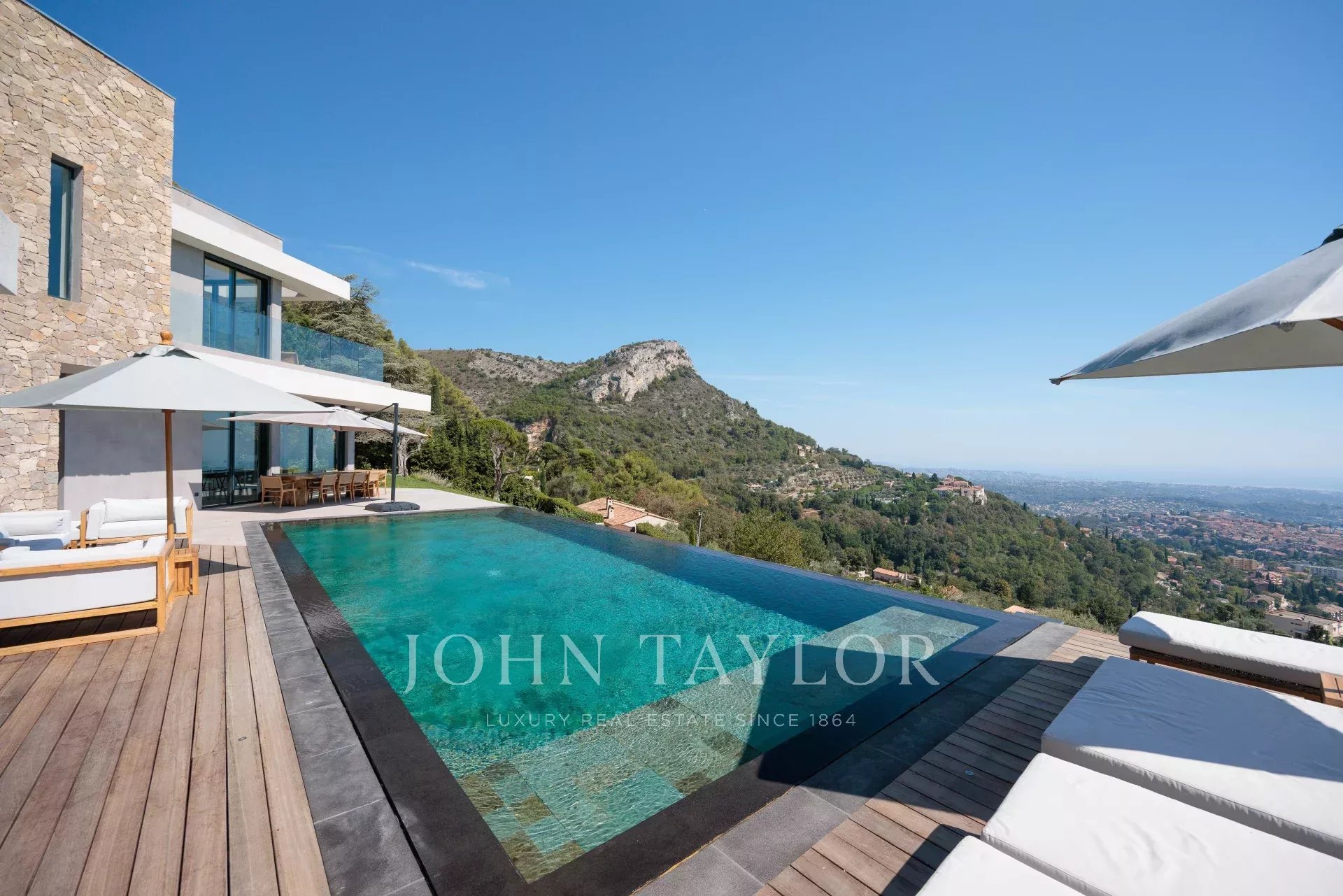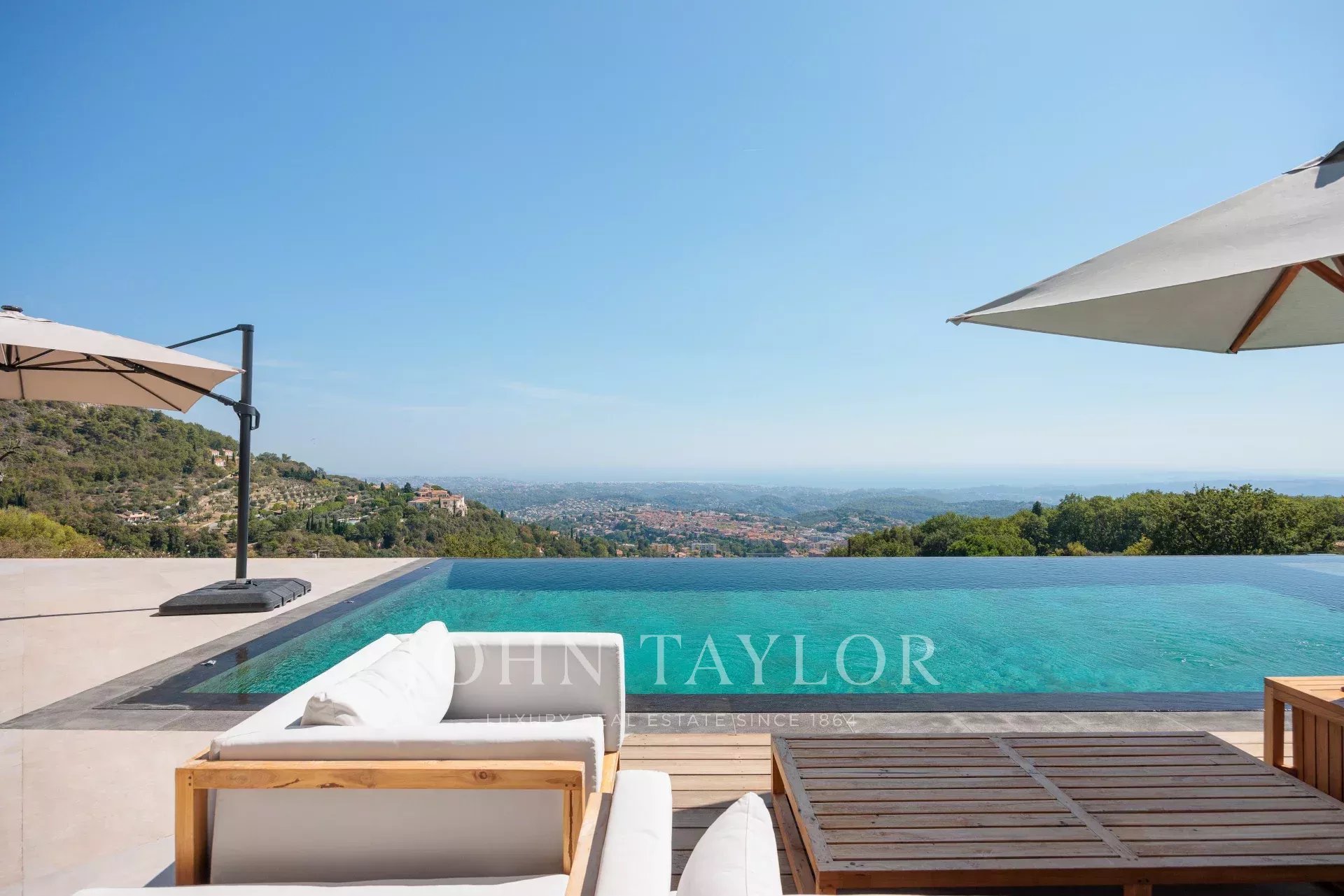 Diese herrliche 400m2 große Villa wurde vor kurzem auf einem 4000m2 großen Grundstück erbaut und liegt ideal auf den Anhöhen von Vence. Jedes Zimmer des Hauses und die große Terrasse bieten einen Blick auf das Meer (Cap d'Antibes, Baie des Anges, Cap Ferrat) und die umliegenden Berge (Baous, Esterel).