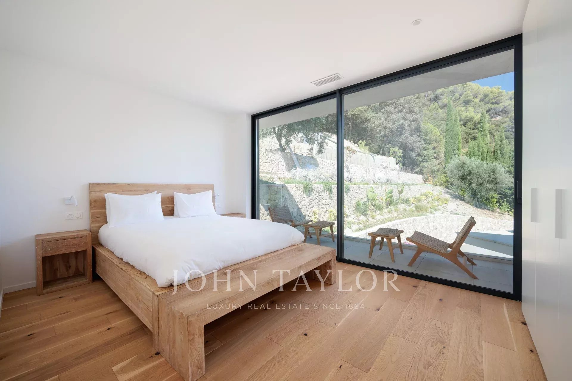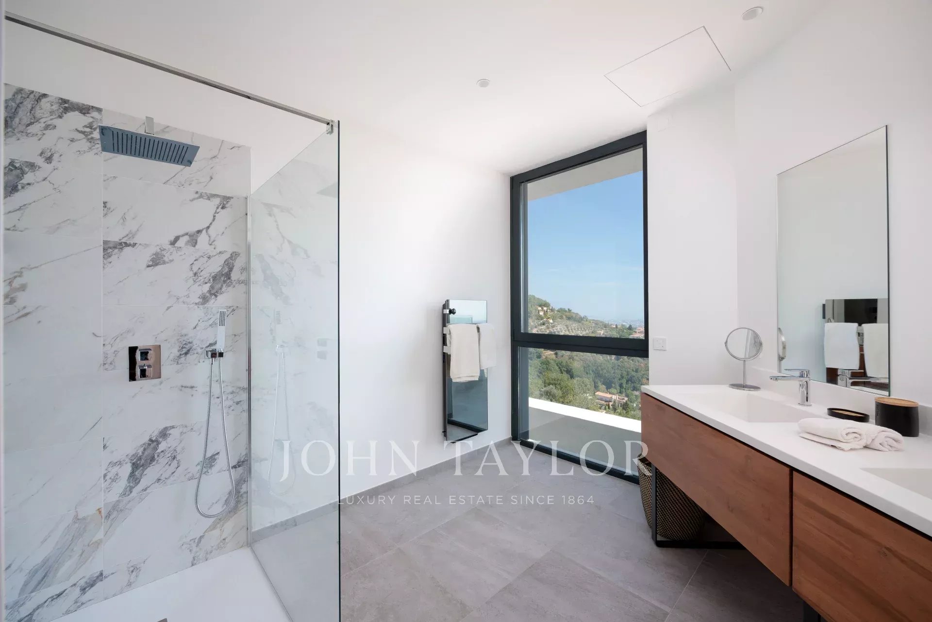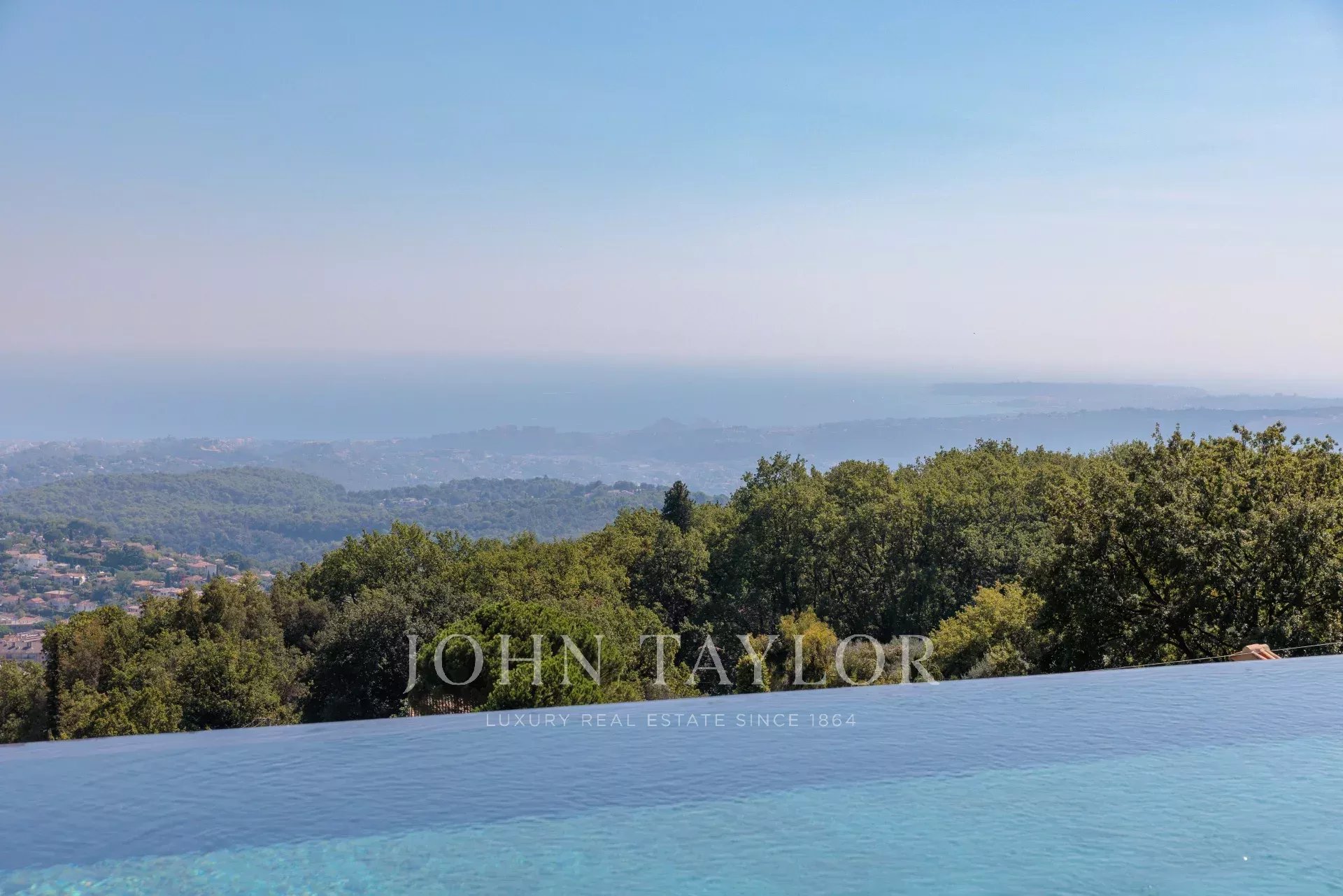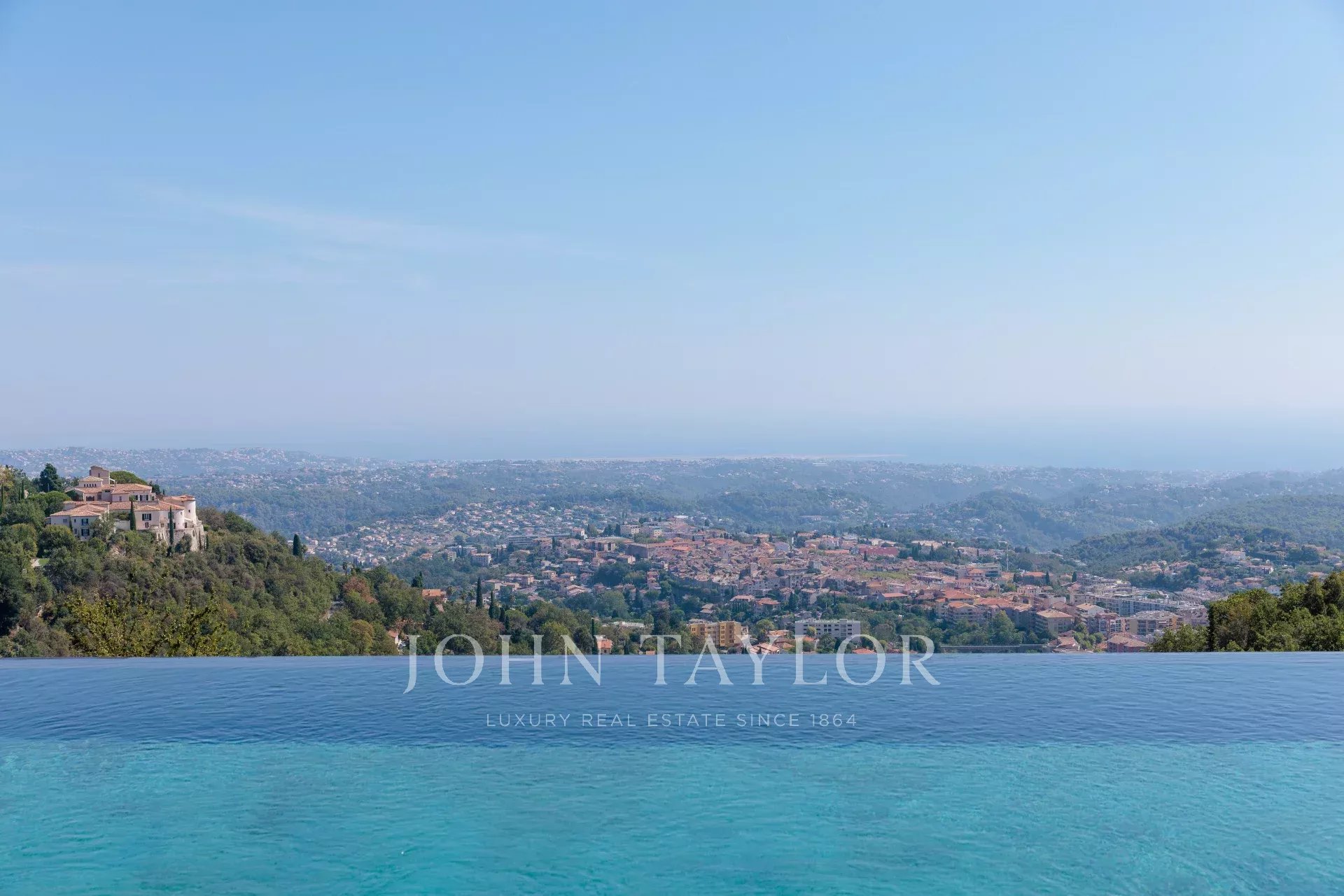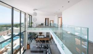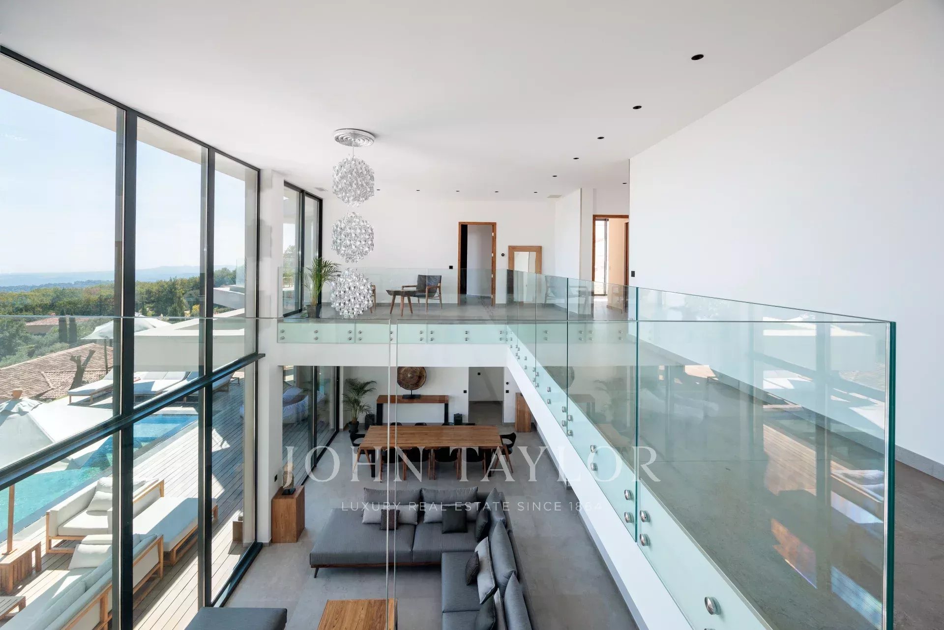 Diese herrliche 400m2 große Villa wurde vor kurzem auf einem 4000m2 großen Grundstück erbaut und liegt ideal auf den Anhöhen von Vence. Jedes Zimmer des Hauses und die große Terrasse bieten einen Blick auf das Meer (Cap d'Antibes, Baie des Anges, Cap Ferrat) und die umliegenden Berge (Baous, Esterel).