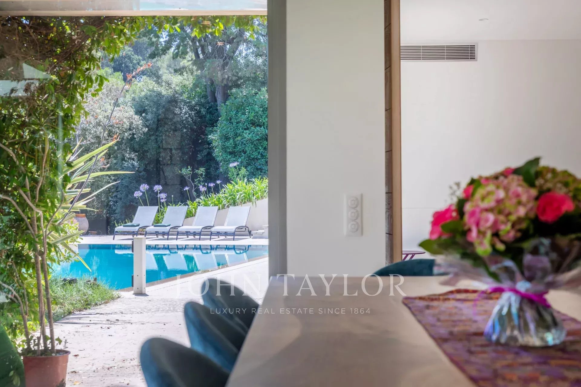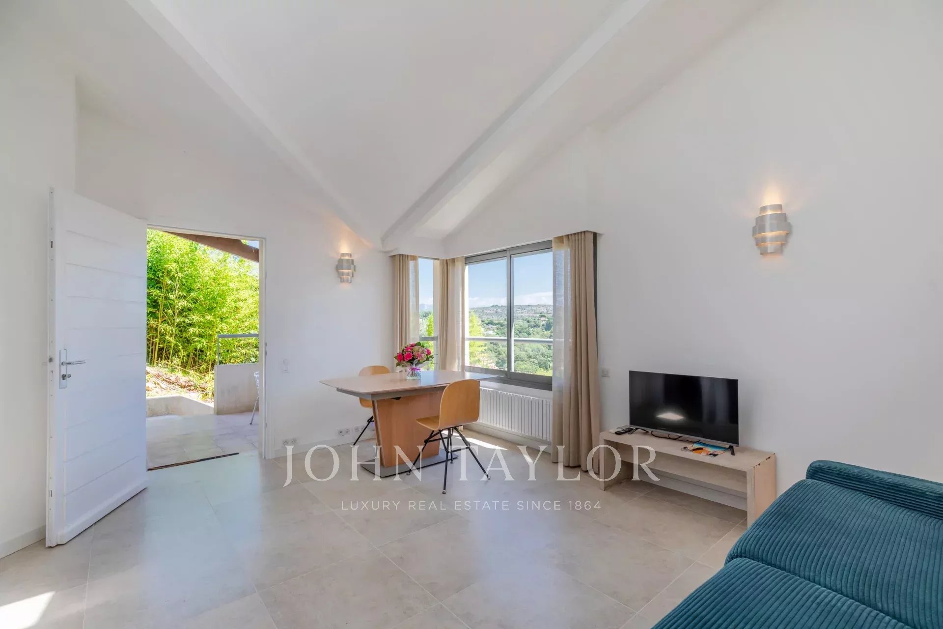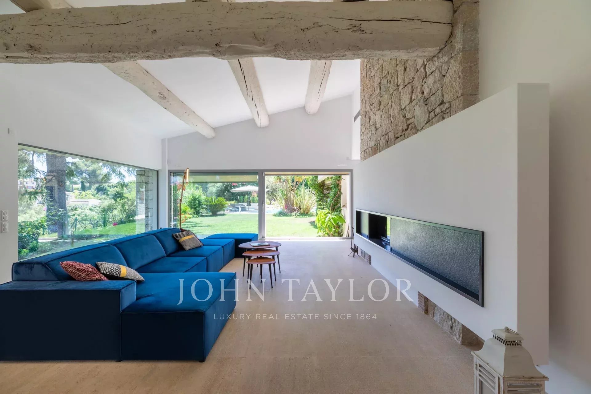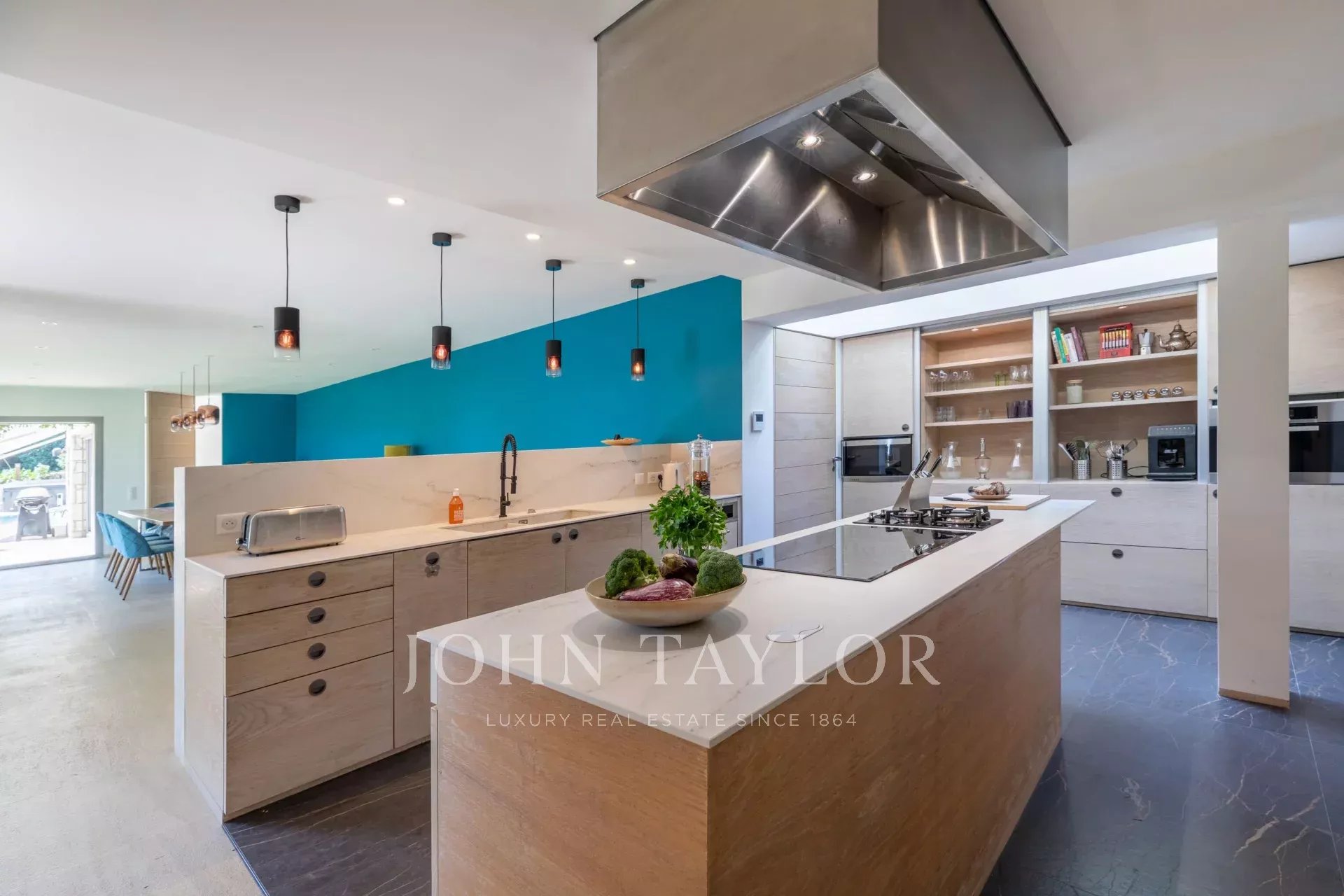 In einem prestigeträchtigen, geschlossenen Wohngebiet mit Panoramablick auf das Dorf Biot und das Meer im Hintergrund liegt dieses wunderschöne, zeitgenössische Anwesen, das vollständig und raffiniert renoviert wurde. Es bietet eine Wohnfläche von ca. 360 m² inmitten eines 2586 m² großen Landschaftsparks mit Pool.