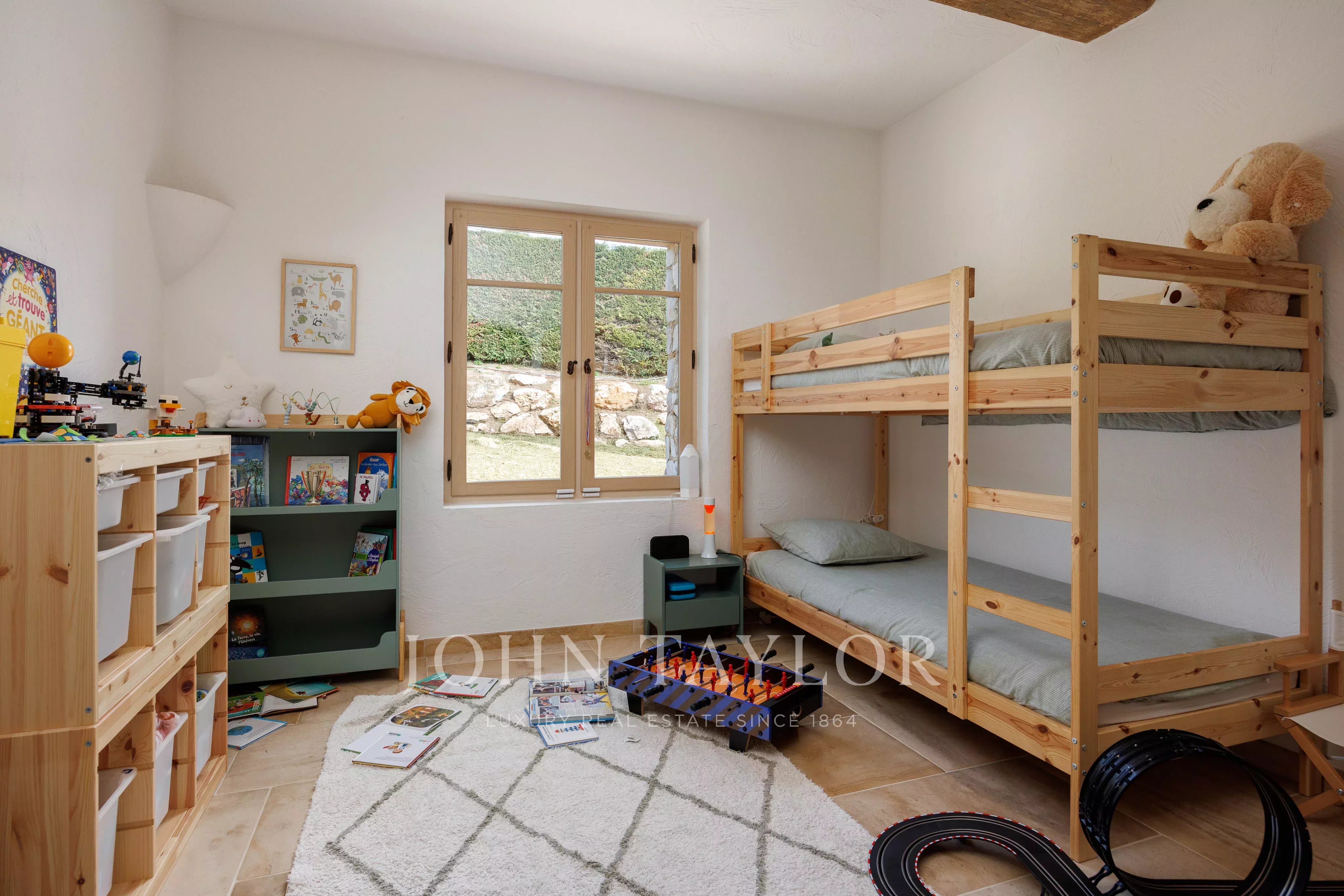 Ein Kinderzimmer, das auch als Büro dienen kann, sowie eine voll ausgestattete Küche, die sich zur Terrasse hin öffnet, vervollständigen diese Ebene.
