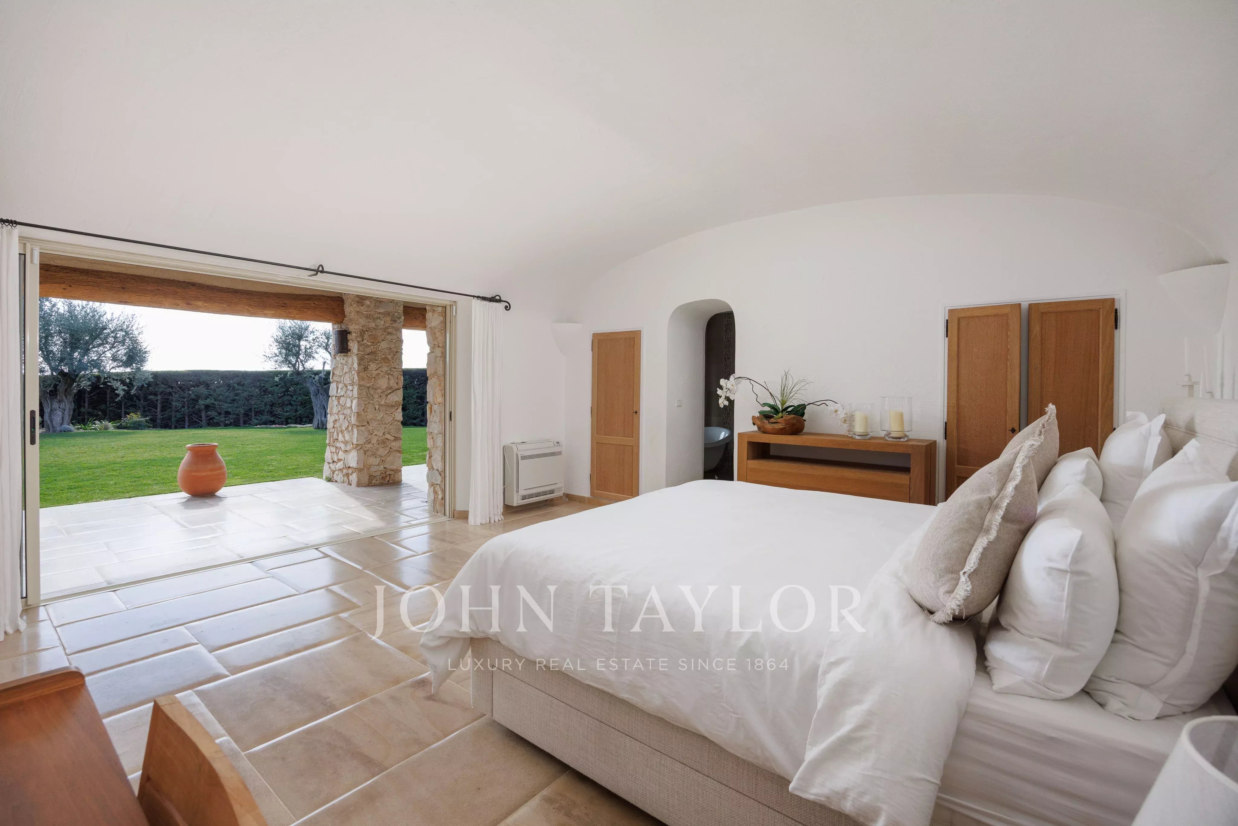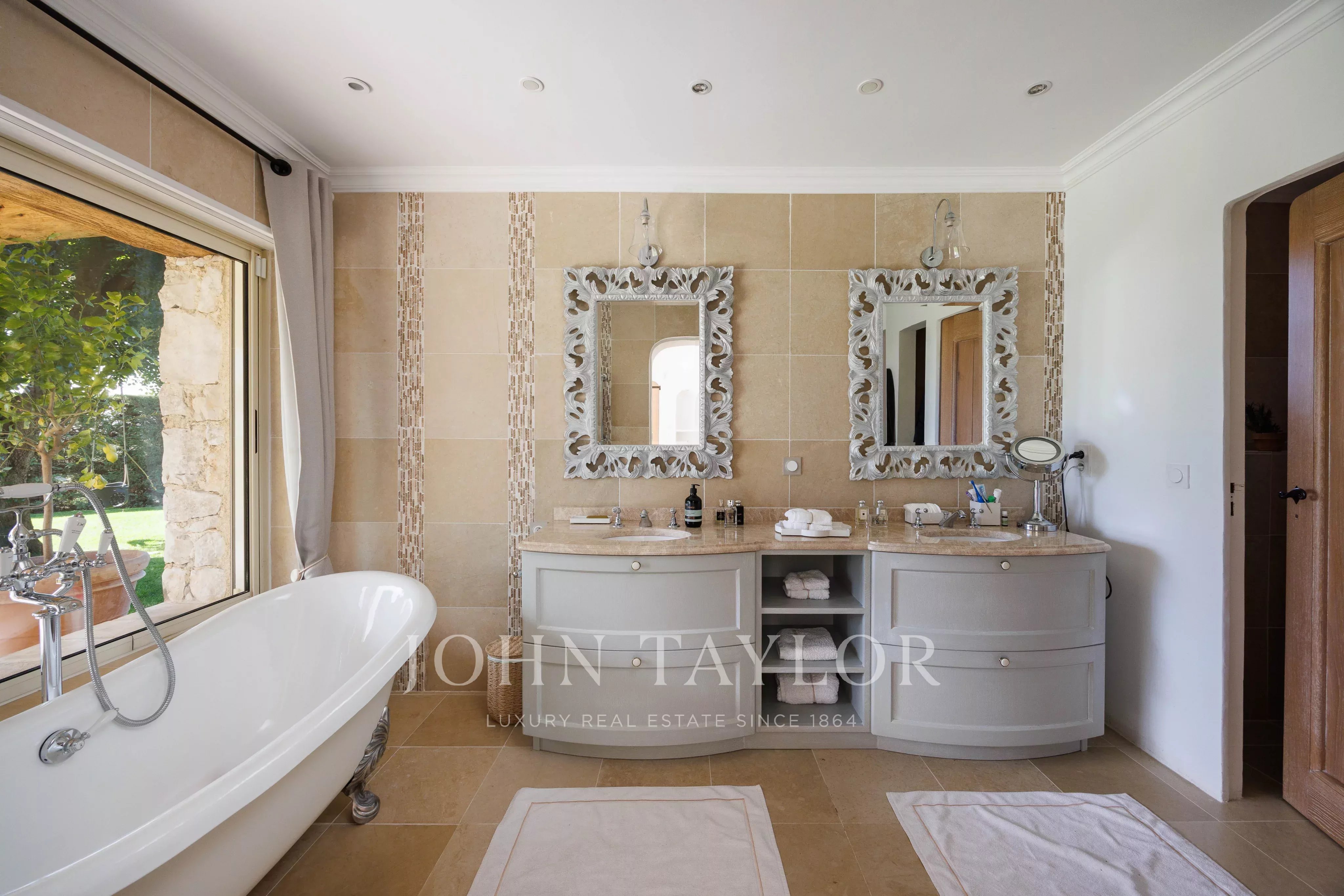Die Mastersuite, die sich im linken Flügel auf derselben Ebene befindet, bietet mit ihrem Ankleidezimmer, ihrem kompletten Badezimmer und ihrem direkten Zugang zum Garten eine schöne Privatsphäre. Ein Kinderzimmer, das auch als Büro dienen kann, sowie eine voll ausgestattete Küche, die sich zur Terrasse hin öffnet, vervollständigen diese Ebene.