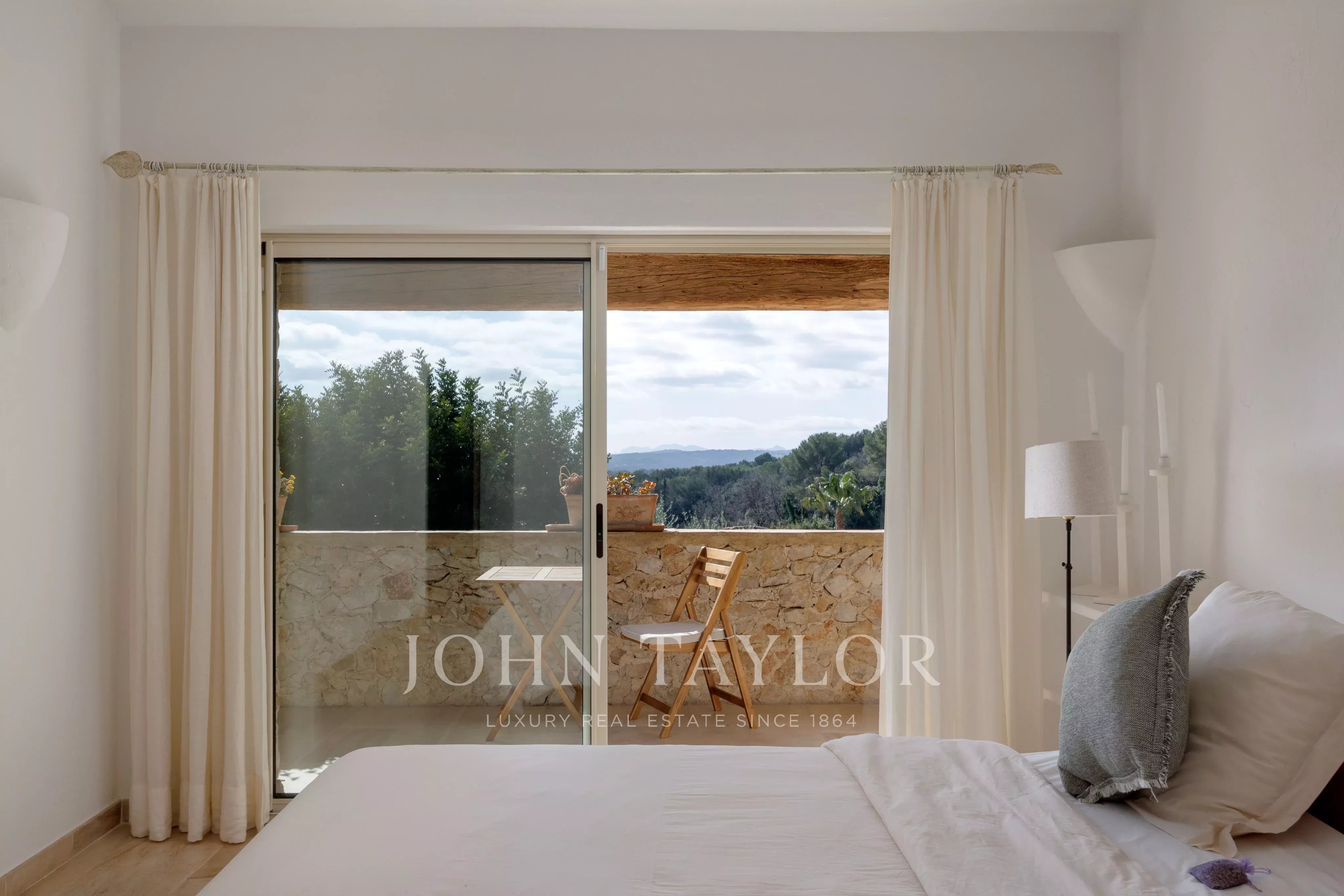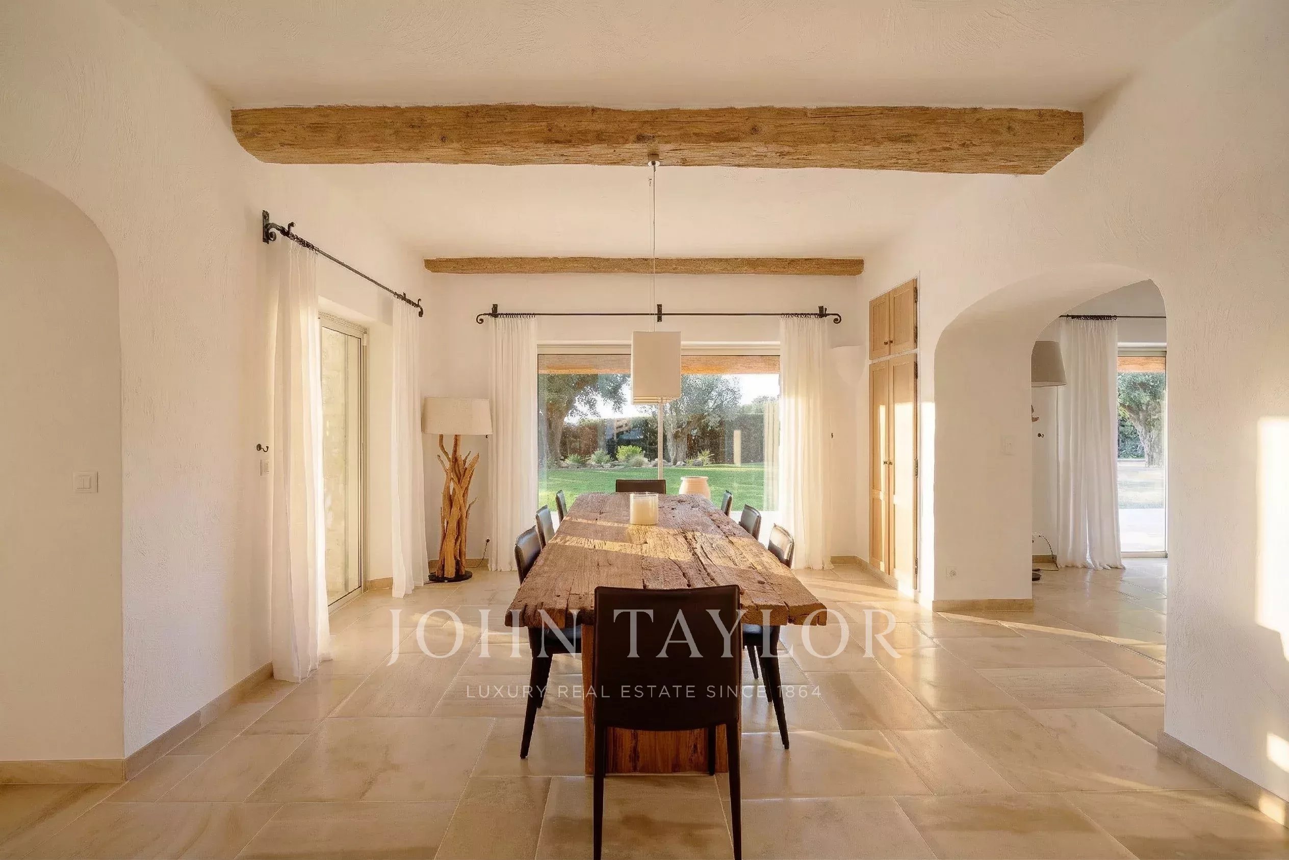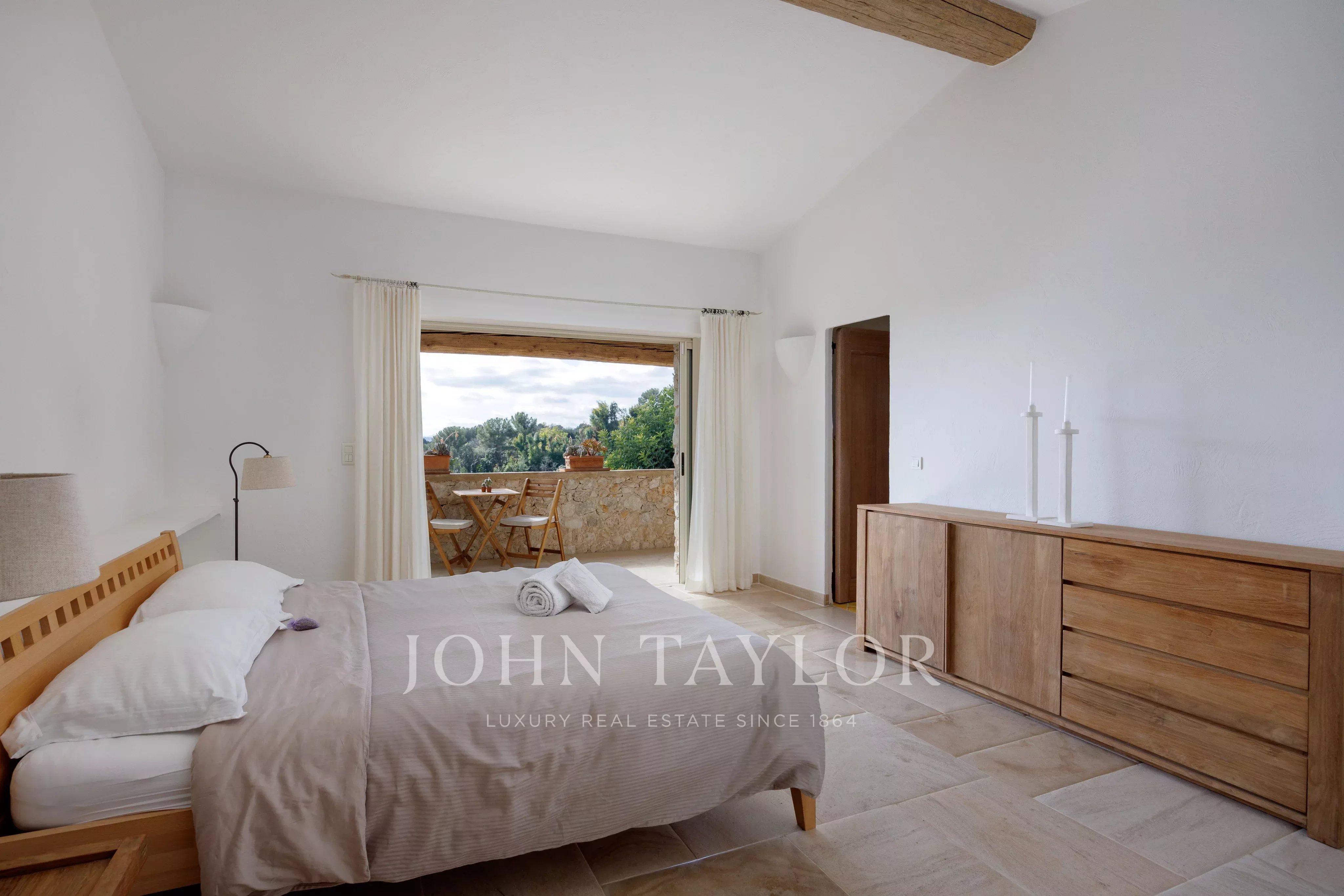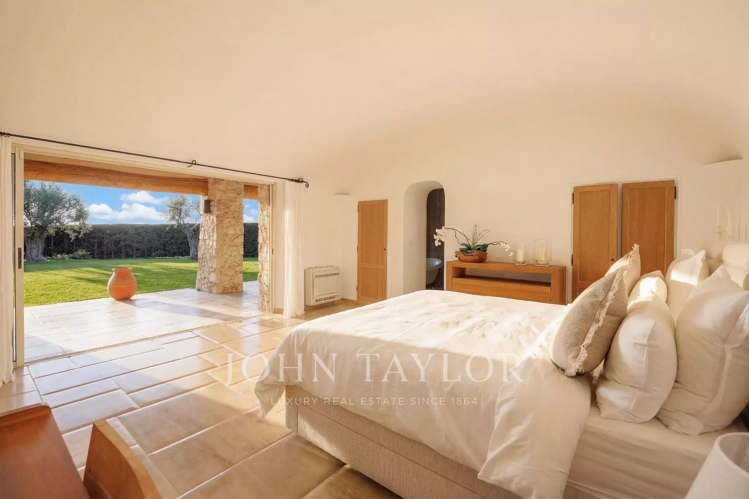 Die Mastersuite, die sich im linken Flügel auf derselben Ebene befindet, bietet mit ihrem Ankleidezimmer, ihrem kompletten Badezimmer und ihrem direkten Zugang zum Garten eine schöne Privatsphäre.