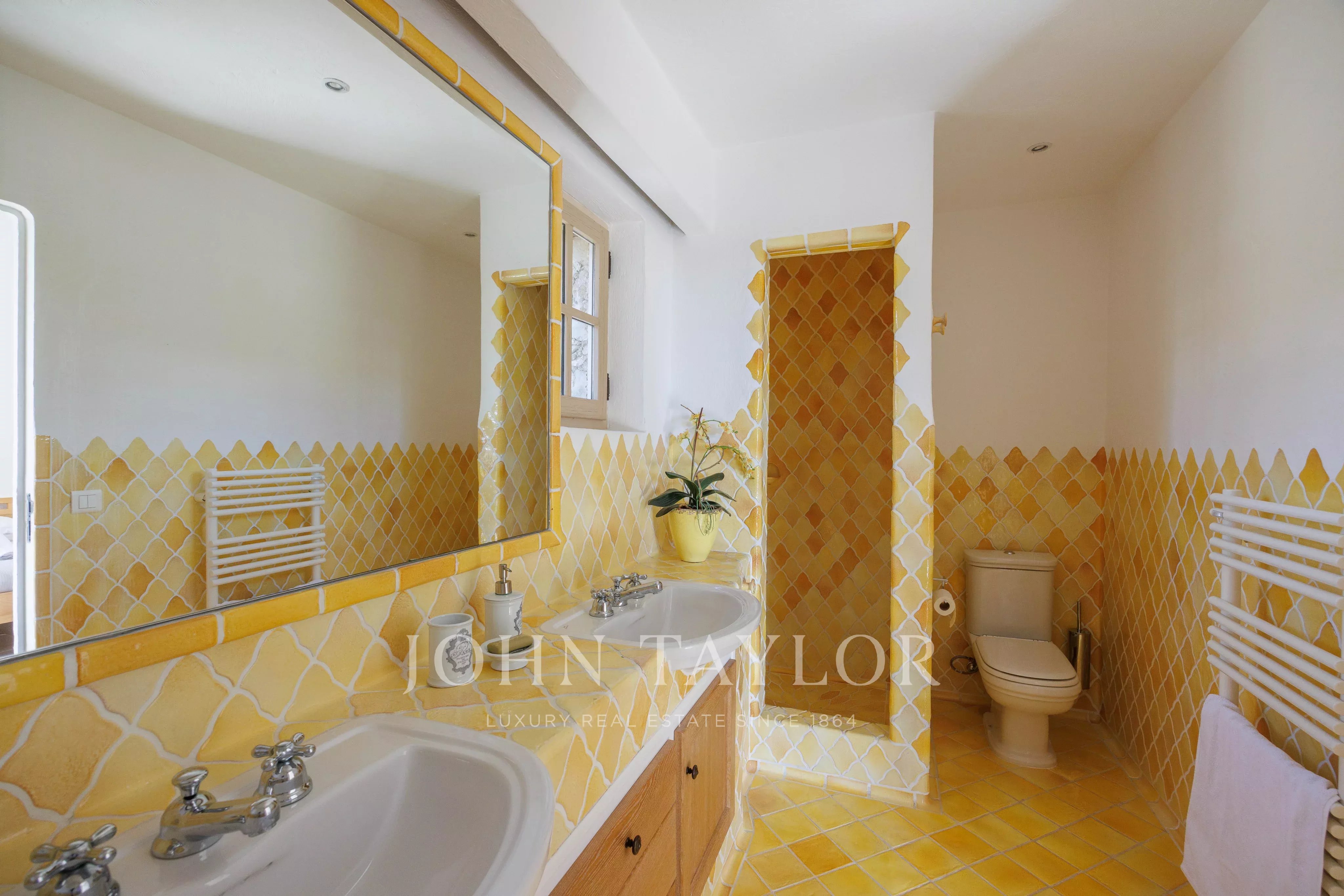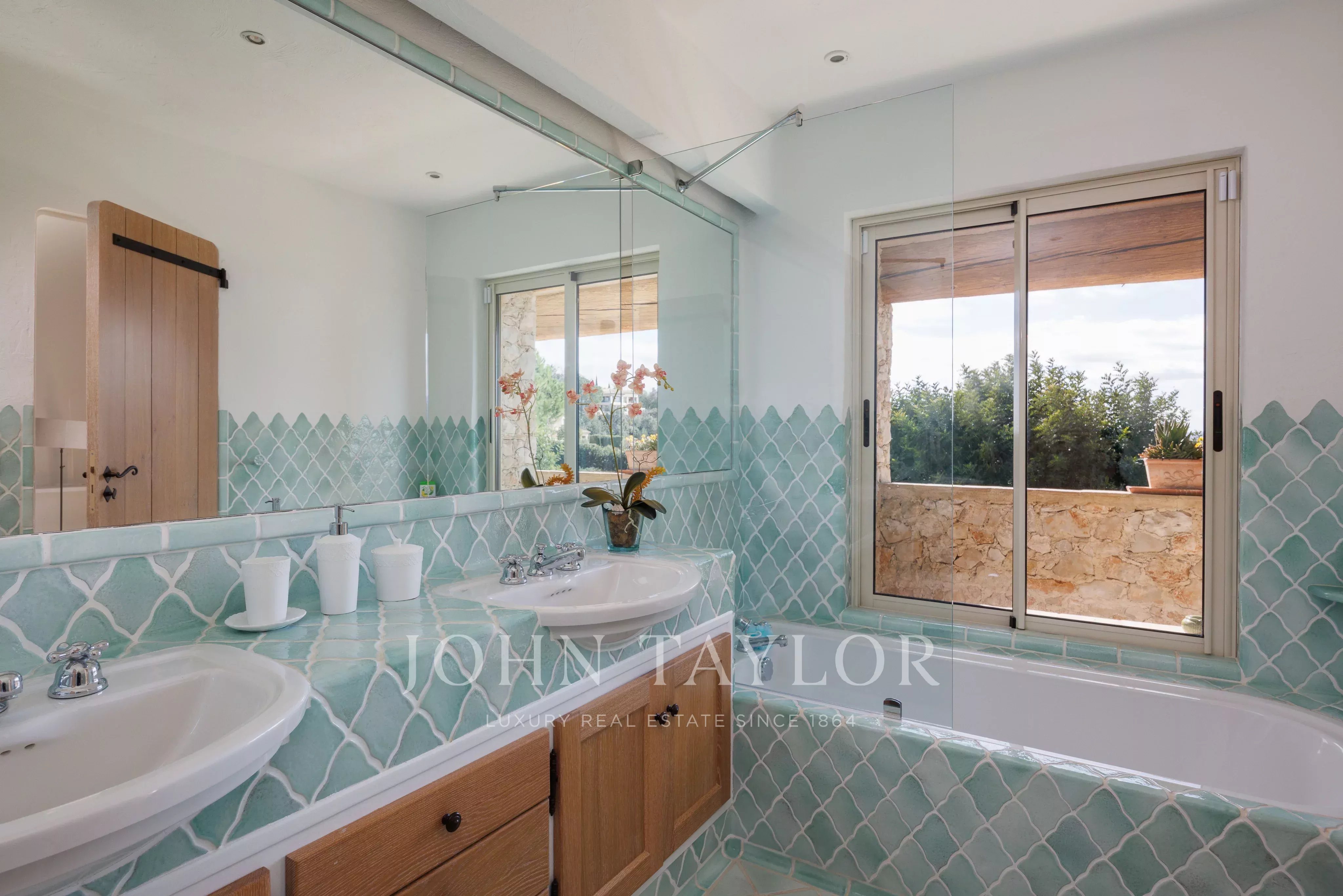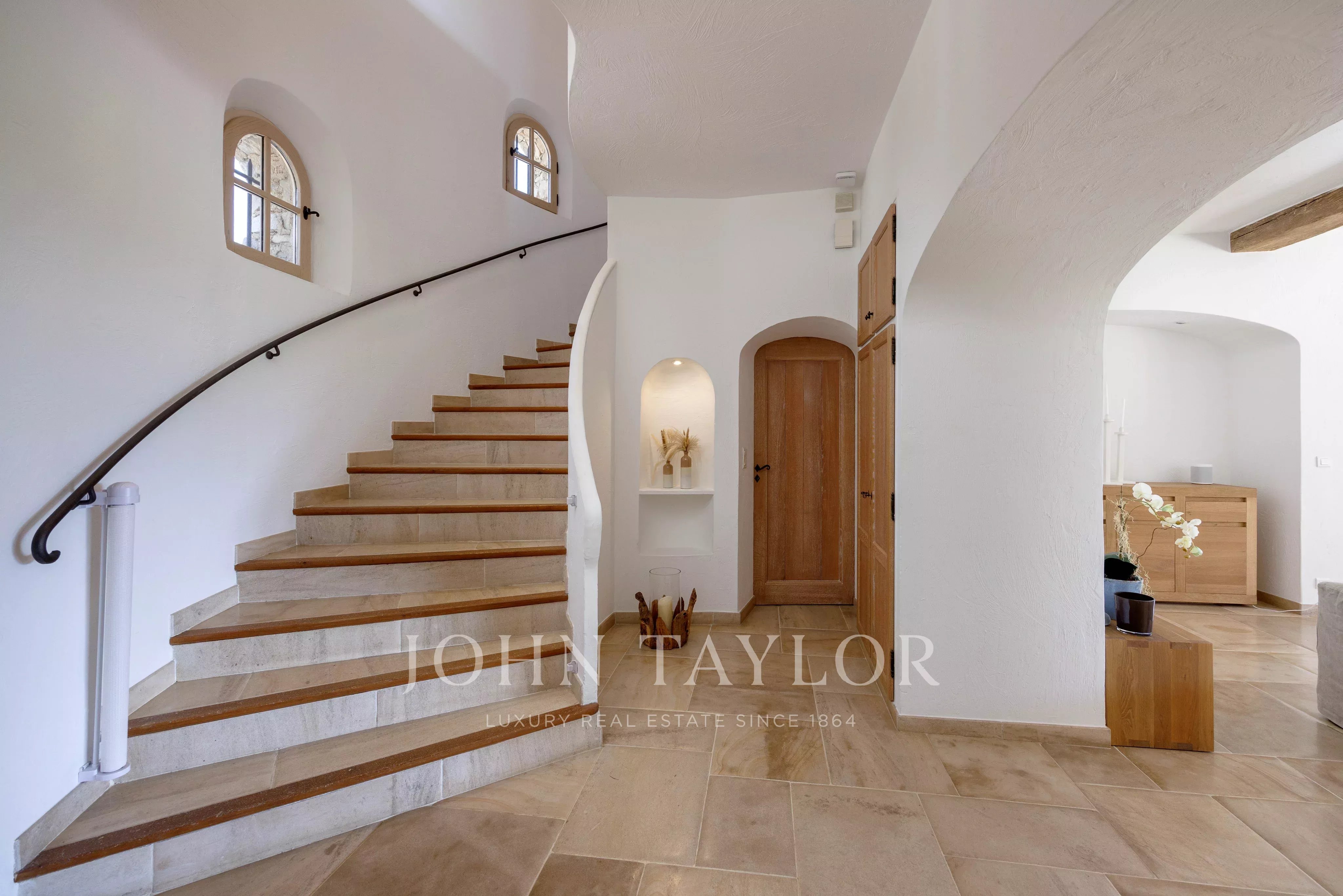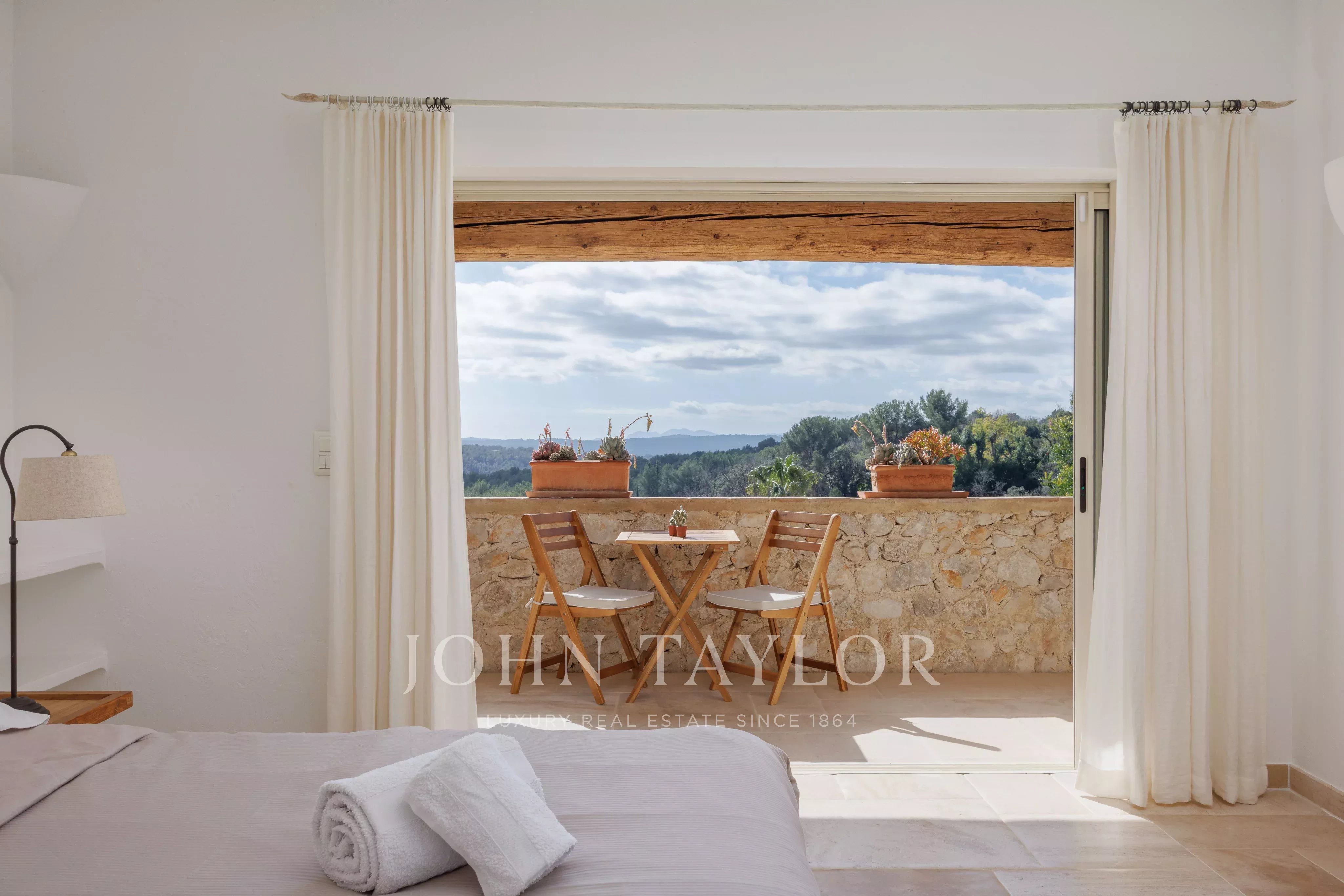 Die Mastersuite, die sich im linken Flügel auf derselben Ebene befindet, bietet mit ihrem Ankleidezimmer, ihrem kompletten Badezimmer und ihrem direkten Zugang zum Garten eine schöne Privatsphäre.