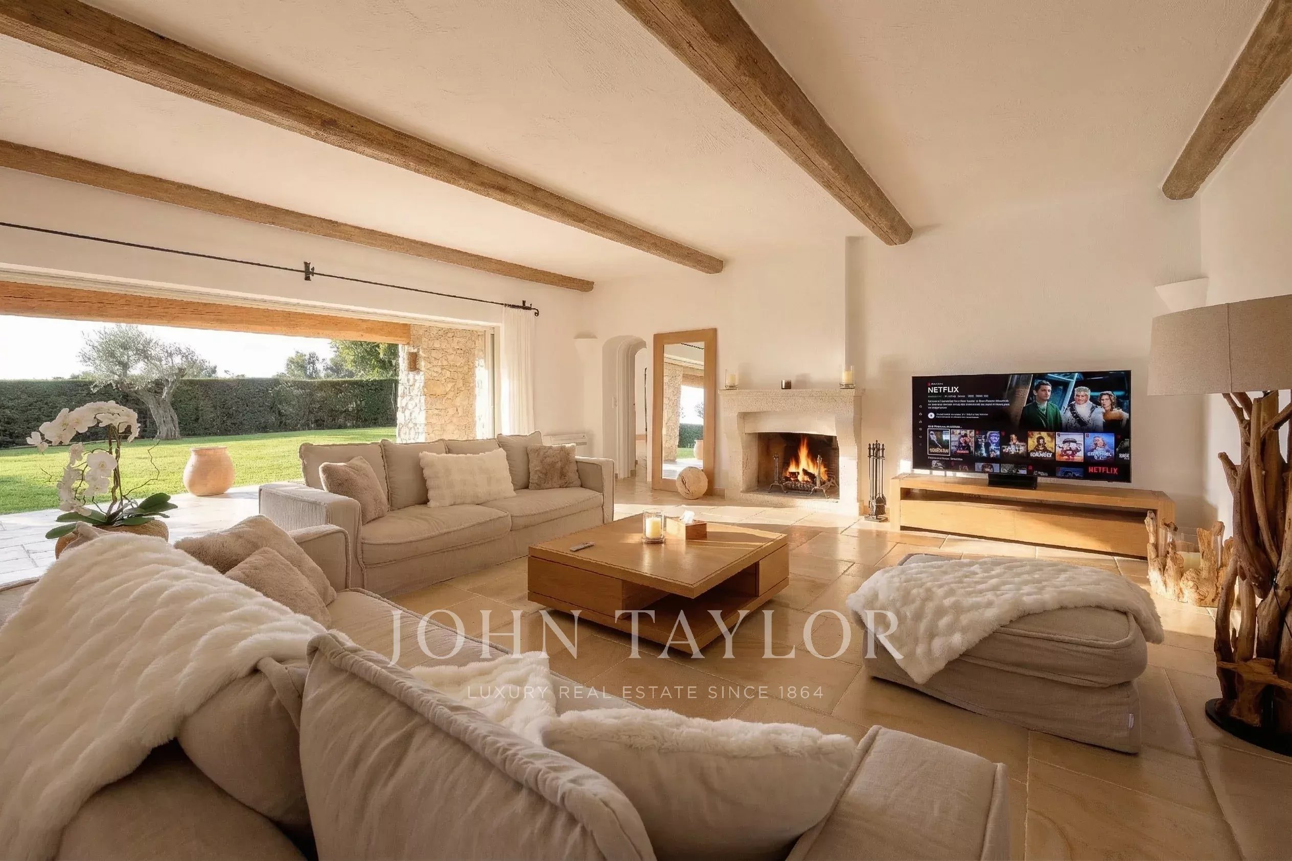 Im Erdgeschoss befindet sich ein großer, lichtdurchfluteter Empfangsbereich, in dem sich das Wohnzimmer mit Kamin und das Esszimmer durch große Panoramafenster zum Garten hin erstrecken und so eine perfekte Kontinuität zwischen Innen und Außen schaffen.