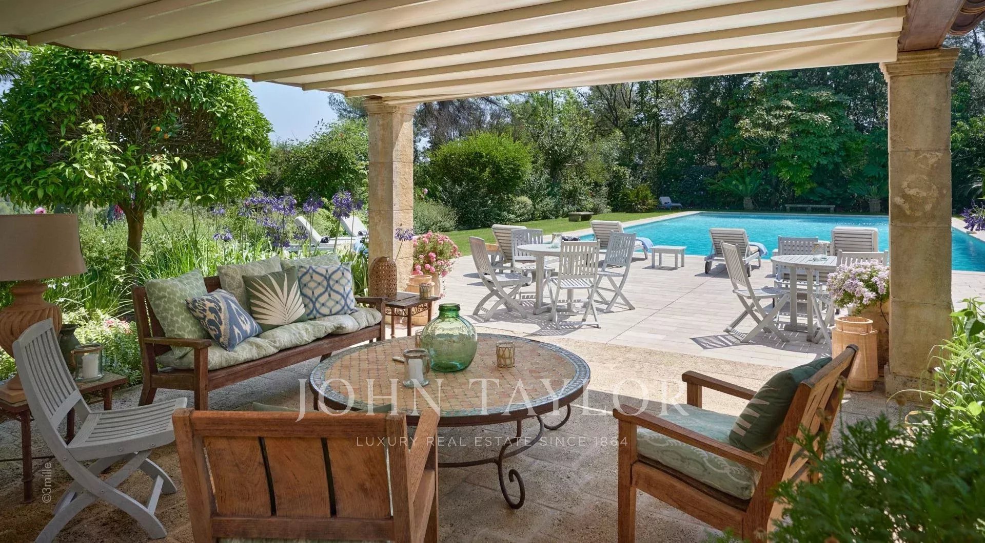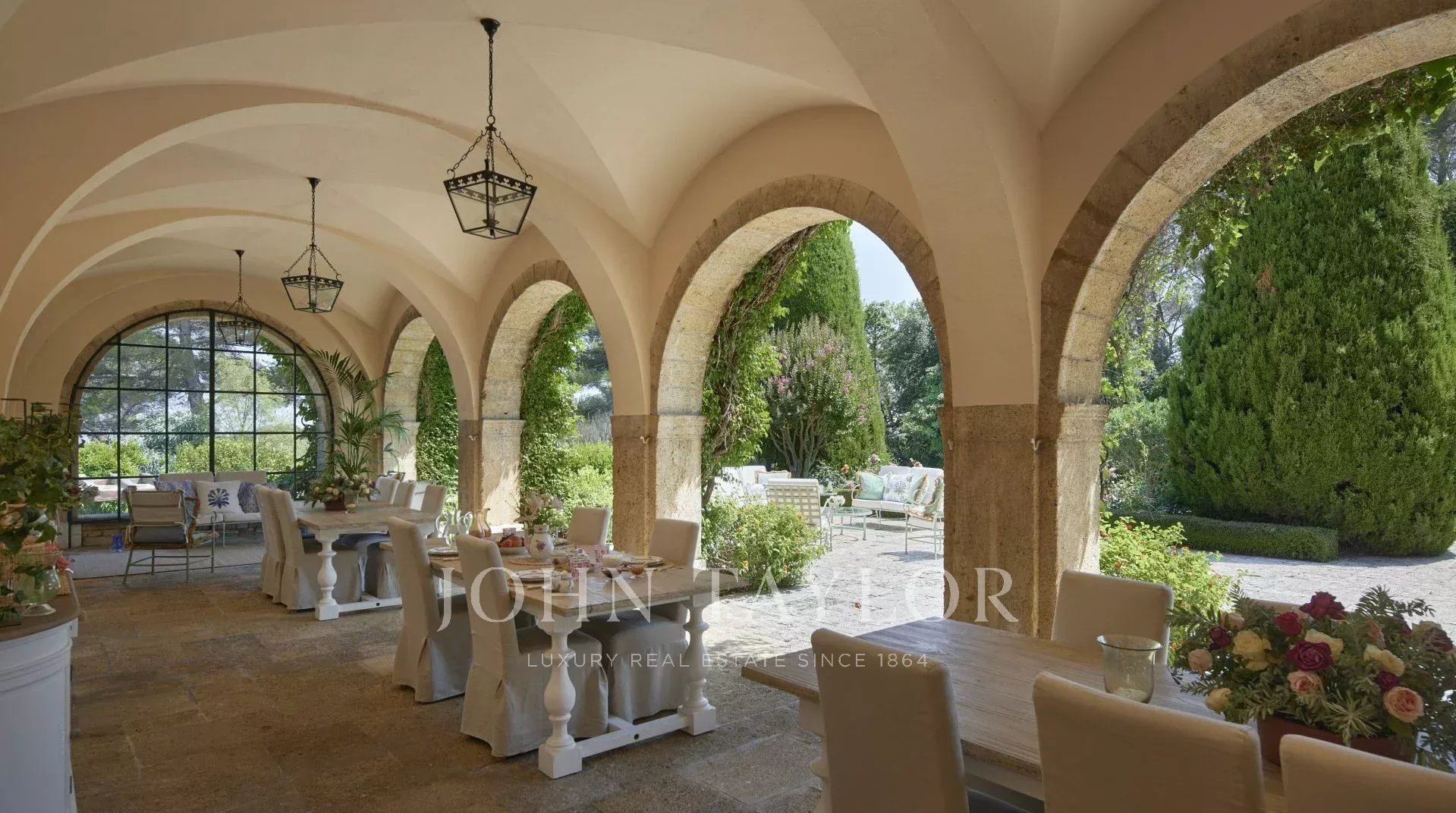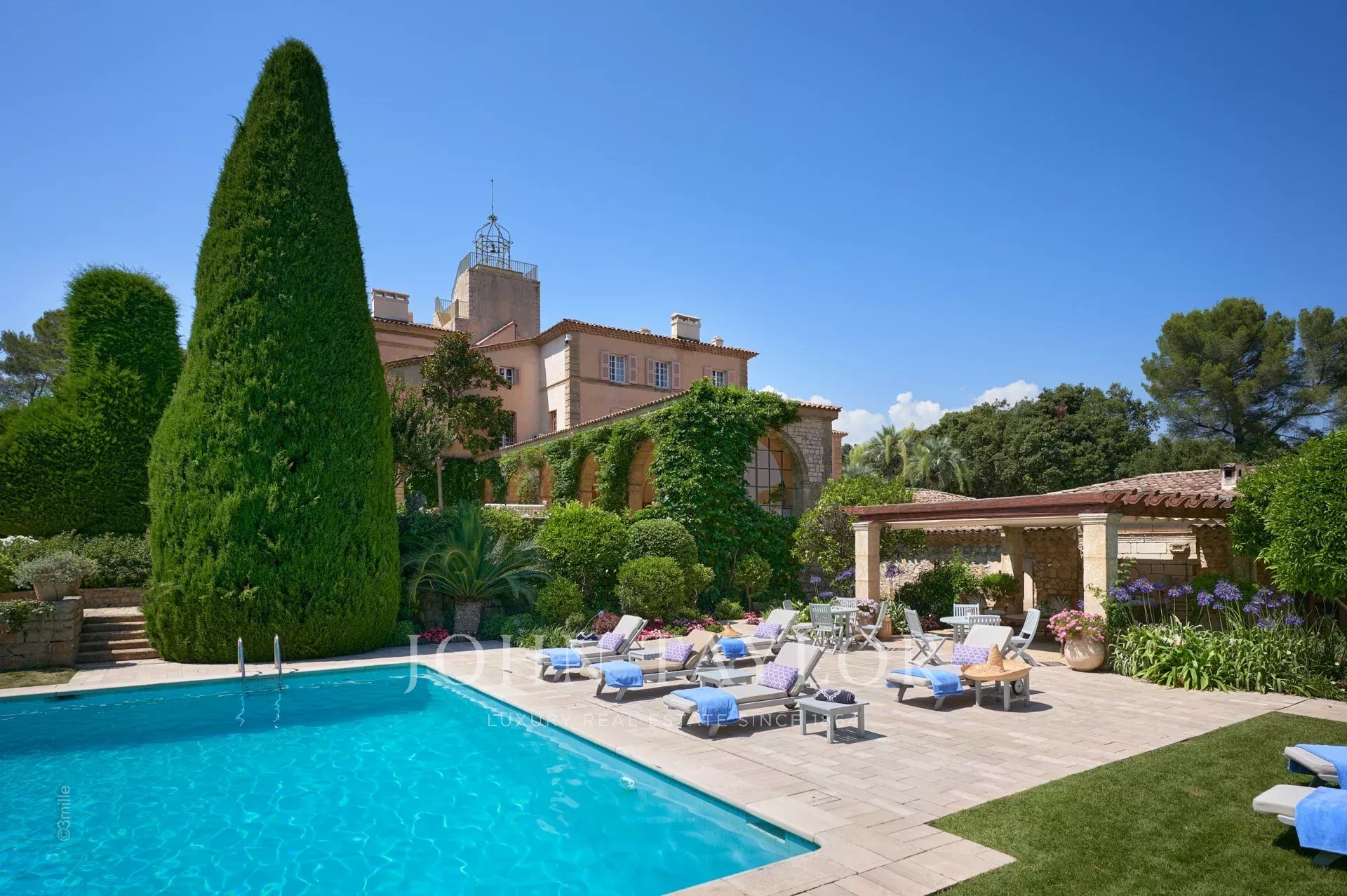 Auf einem privaten Hügel mit freiem Blick auf das Meer liegt dieses prächtige, 1920 aus Quadersteinen erbaute Schloss, in dem JFK als Kind seine Sommerferien verbrachte, als sein Vater Joseph Kennedy zwischen 1938 und 1940 als britischer Botschafter in London amtierte. Ideal gelegen zwischen den Dörfern Valbonne und Mougins, 20 Minuten von Cannes und seinen Stränden entfernt. Das Anwesen profitiert von einem etwa achtzehn Hektar großen Park.