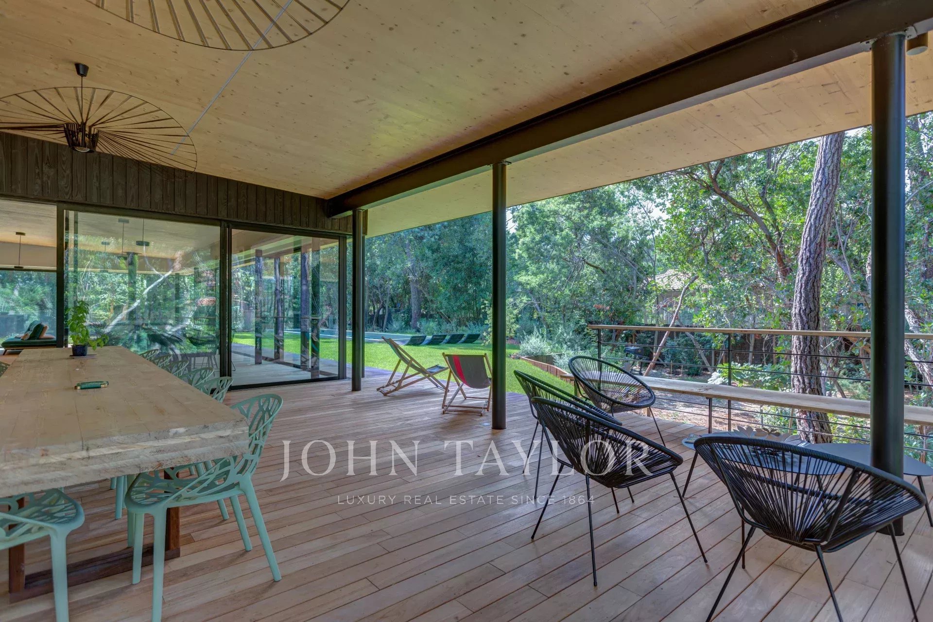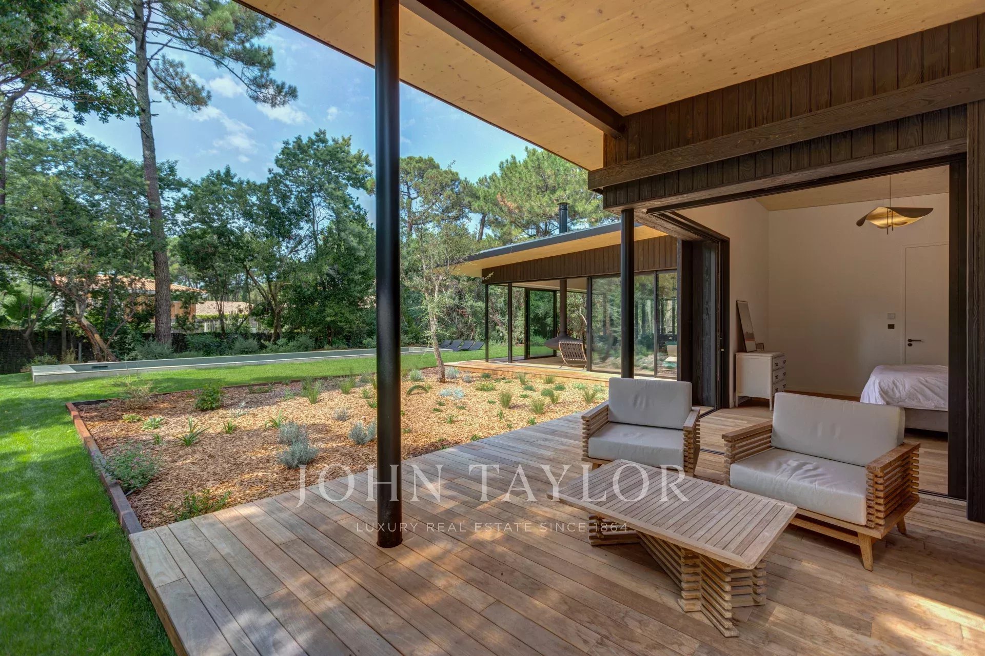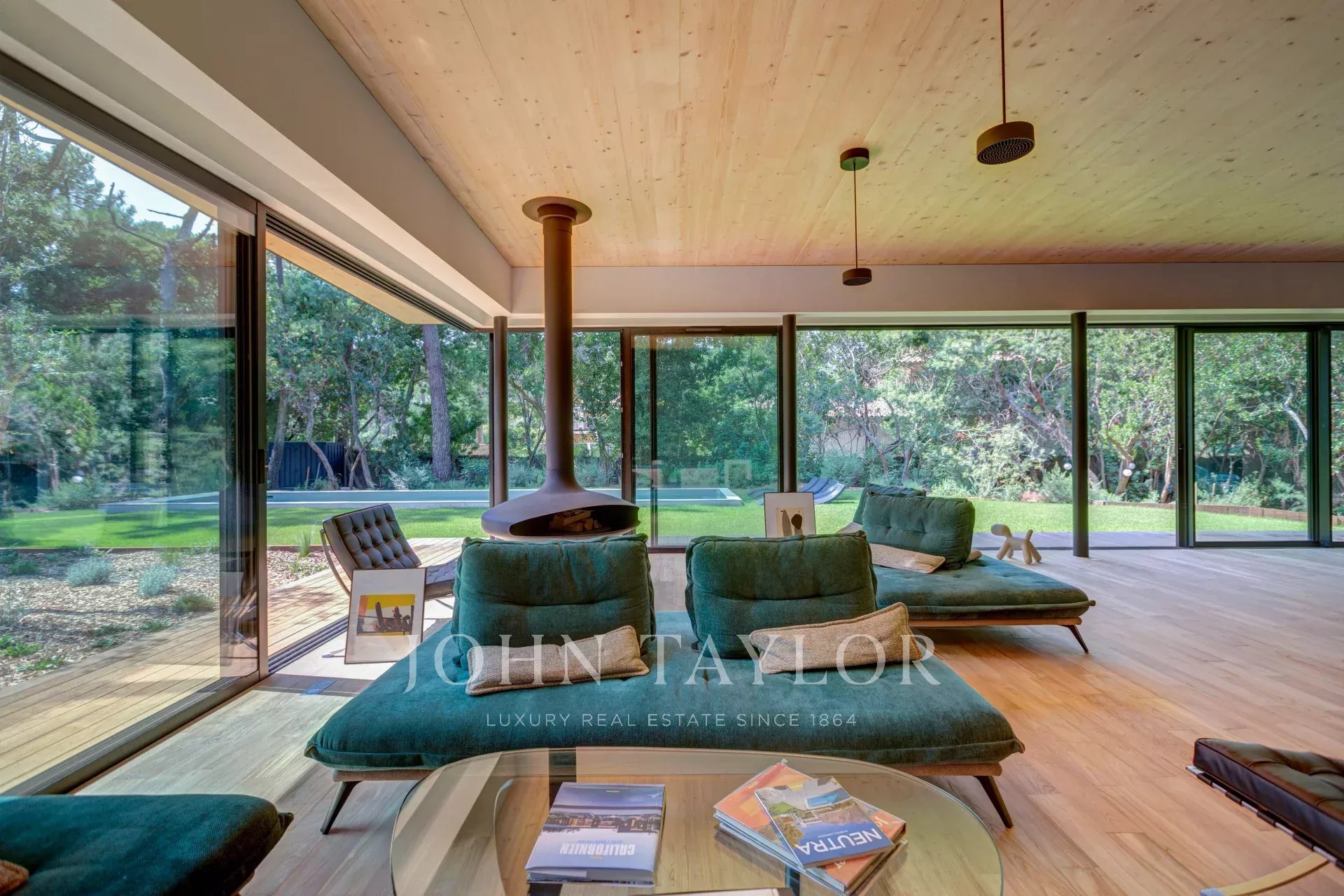 Willkommen in der Villa Kuro, einem wahren architektonischen Juwel, das die Eleganz Kaliforniens der 1950er Jahre mit japanischem Minimalismus vereint. Eingebettet in einen geschützten Kiefernwald und verkleidet mit schwarzem Holz, bietet diese abgeschiedene Villa eine Oase der Ruhe, nur wenige Schritte vom berühmten Plage des Américains entfernt.
