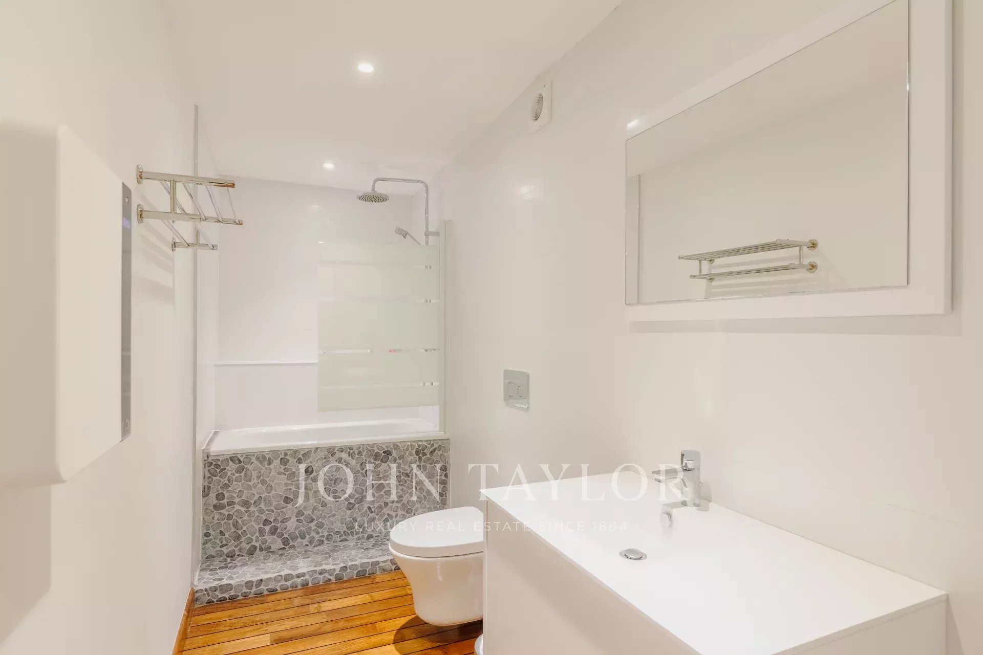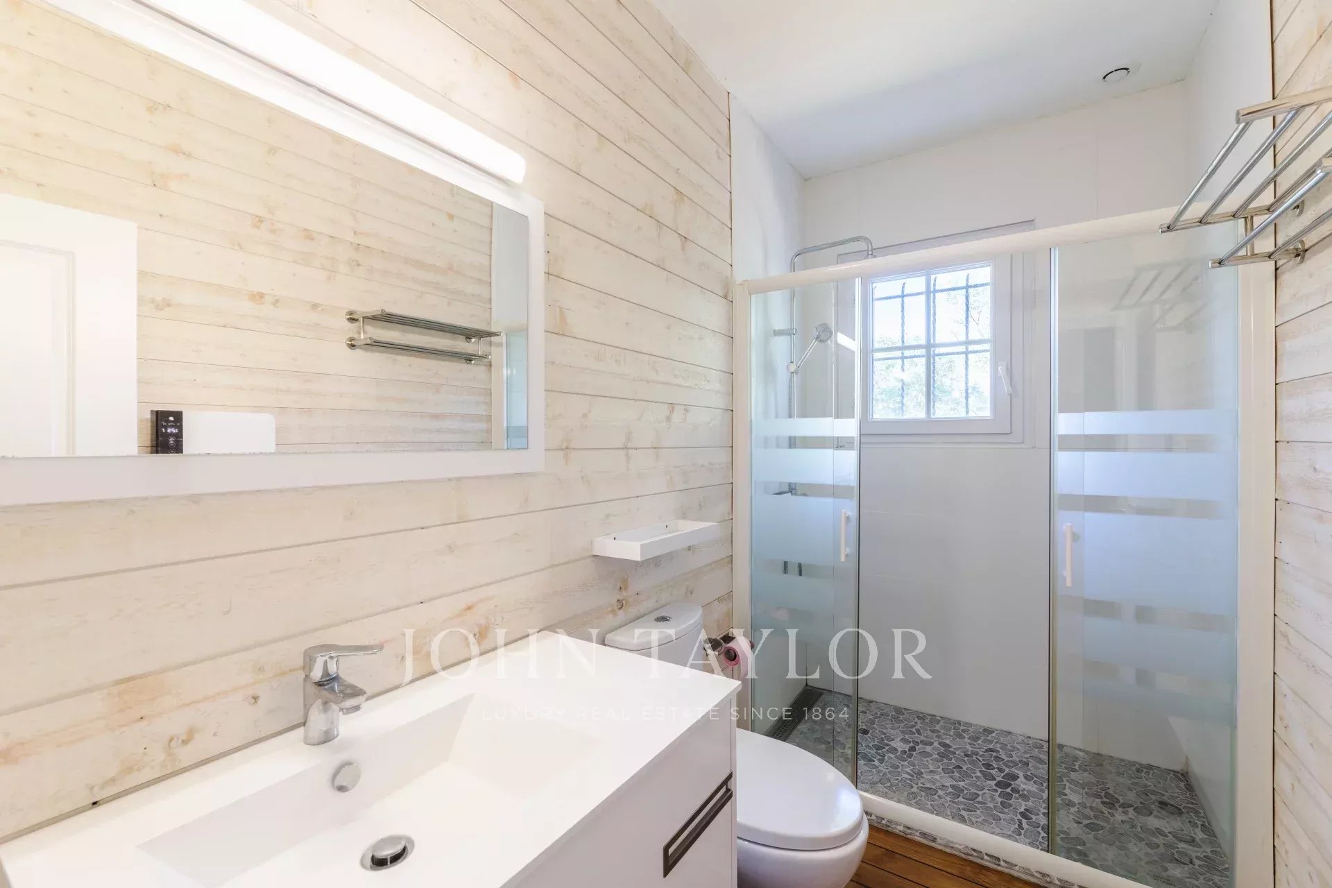 Das Erdgeschoss präsentiert sich als idealer Raum für Unterhaltung, mit einem Fitnessstudio und einem Wohnzimmer ausgestattet mit einem Fernseher und einem Tischfußball. Diese Ebene, mit eigenem Eingang, verfügt auch über 4 Schlafzimmer und 2 Badezimmer, was den Komfort und die Privatsphäre jedes Einzelnen fördert.