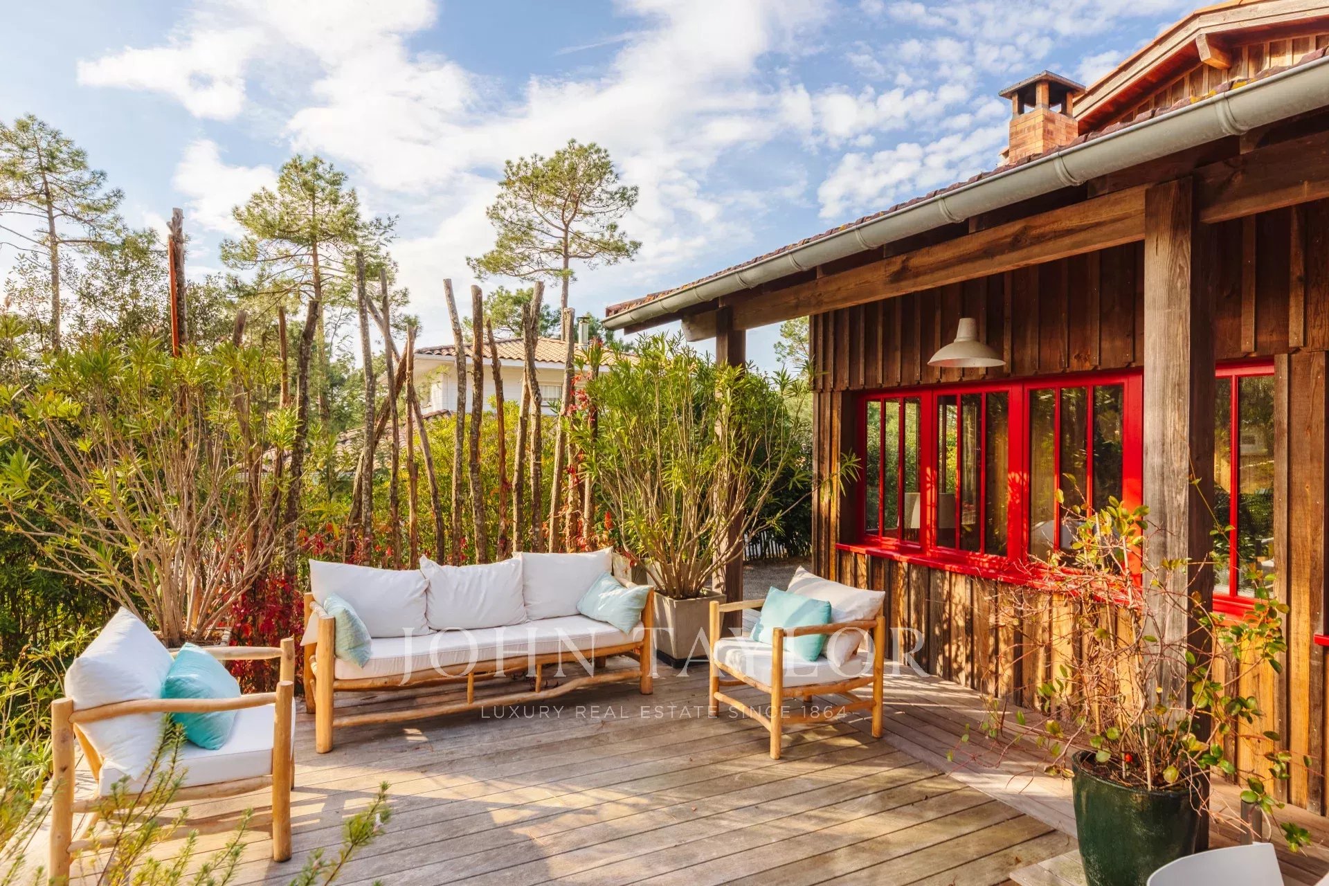 Tauchen Sie ein in die Essenz des Bassin d'Arcachon mit der Villa Chaloupe, deren kühne Architektur von den ikonischen Tchanquées-Hütten inspiriert ist und eine einzigartige und individuelle Atmosphäre schafft.