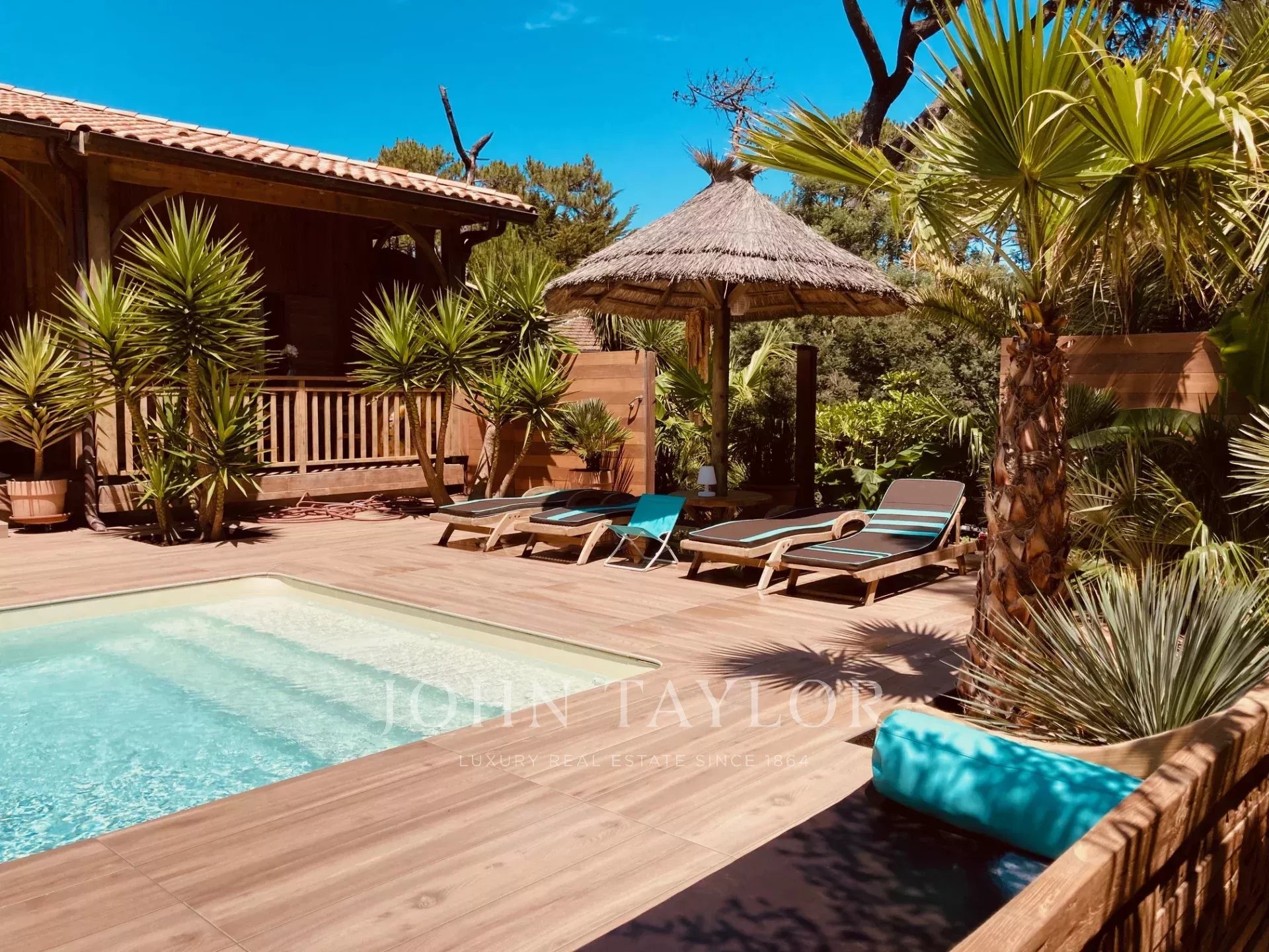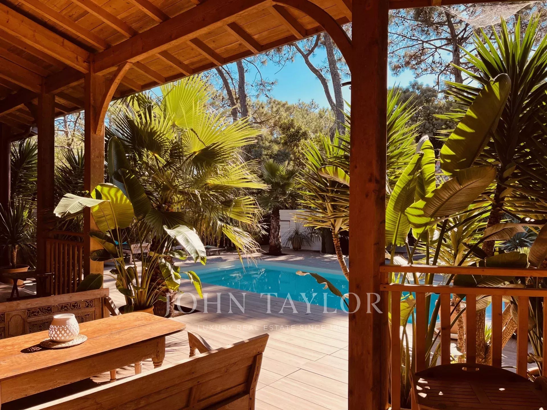 Draußen erwarten Sie ein tropischer Garten, ein beheizter Salzwasserpool (4x9 m) und ein schattiger Pavillon – ein ruhiger Rahmen im subtilen Kontrast zum intensiven Inneren.