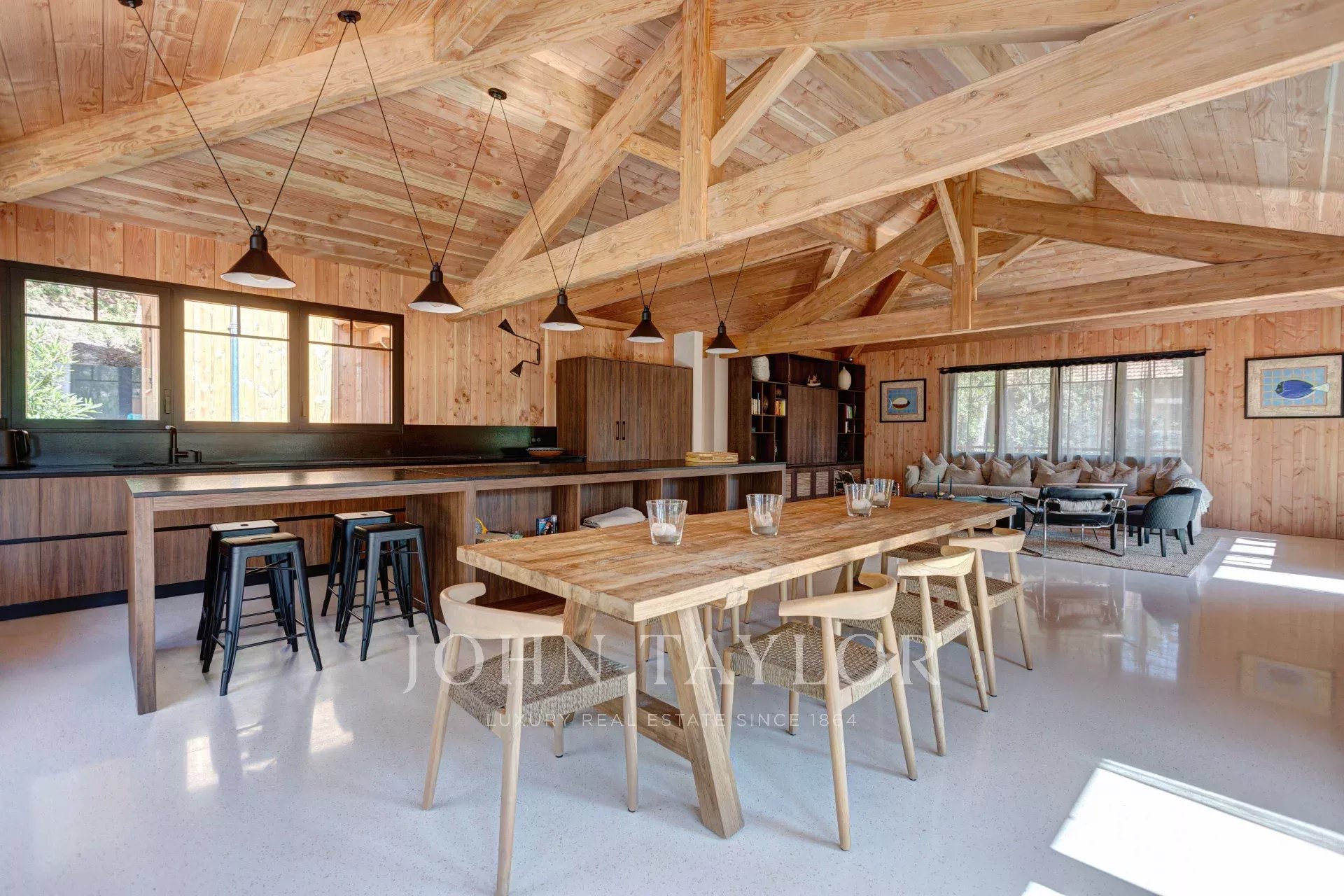 Der beeindruckende 80 m² große Wohnbereich ist der ideale Ort für unvergessliche gemeinsame Momente, sei es bei einem Abendessen mit der Familie oder mit Freunden. Die offene, voll ausgestattete Küche bildet den perfekten Treffpunkt für Ihren Aufenthalt. Der Wohnbereich geht harmonisch in die Terrasse über, die einen multifunktionalen und komfortablen Bereich bietet – direkt neben dem beheizten Pool, ideal für Entspannung zu jeder Tageszeit.
