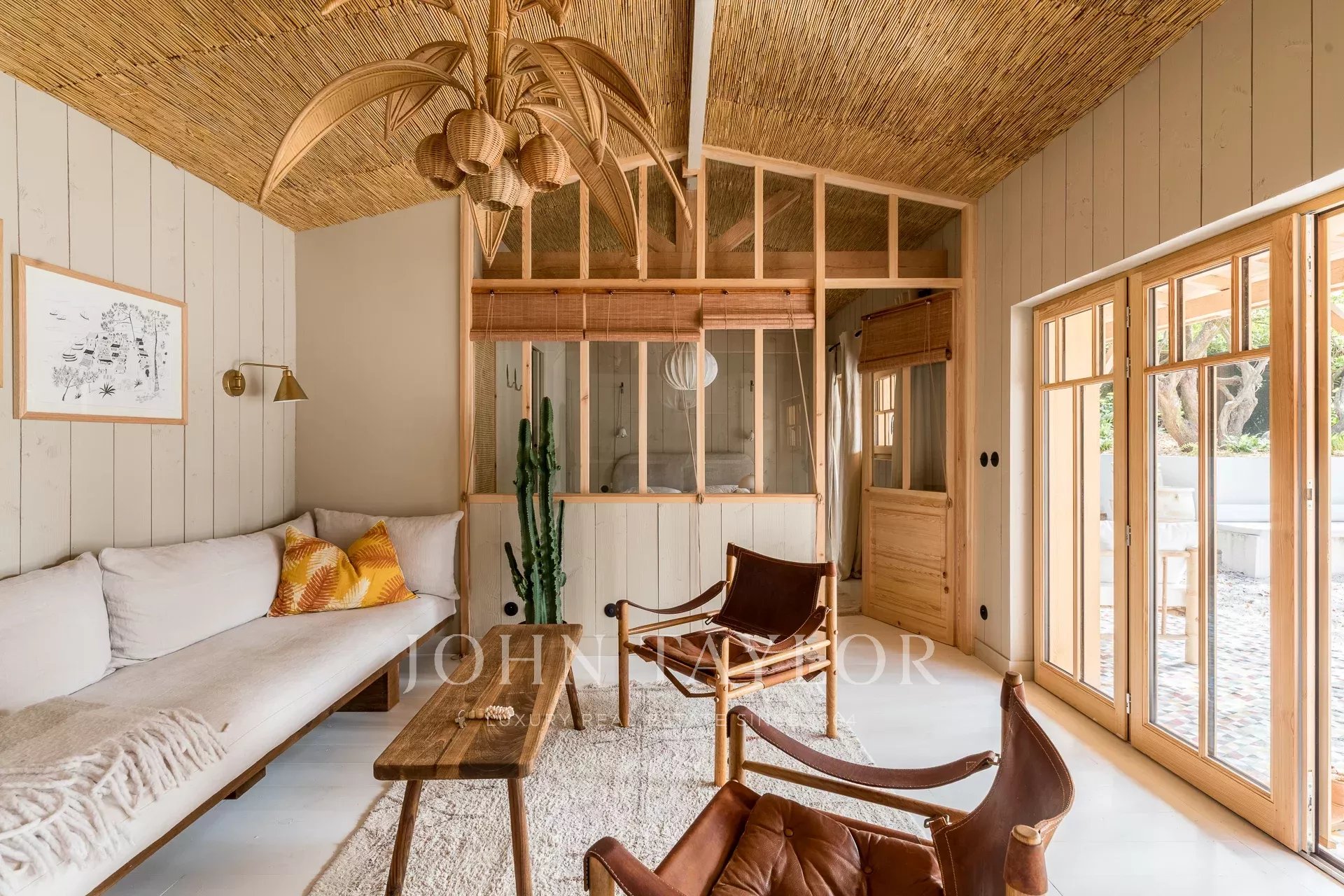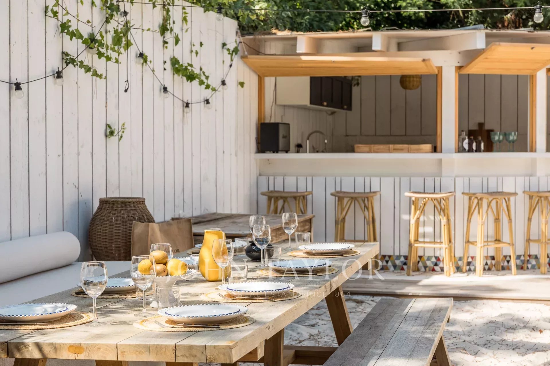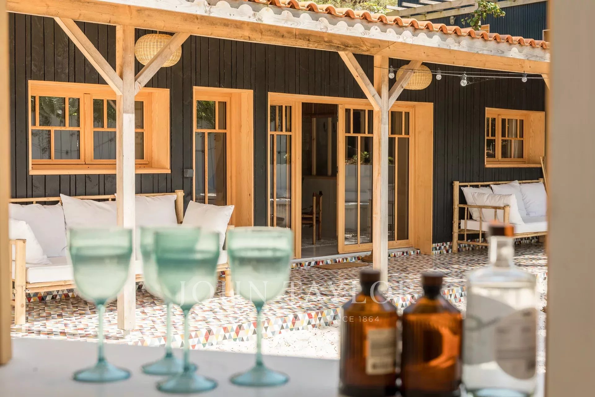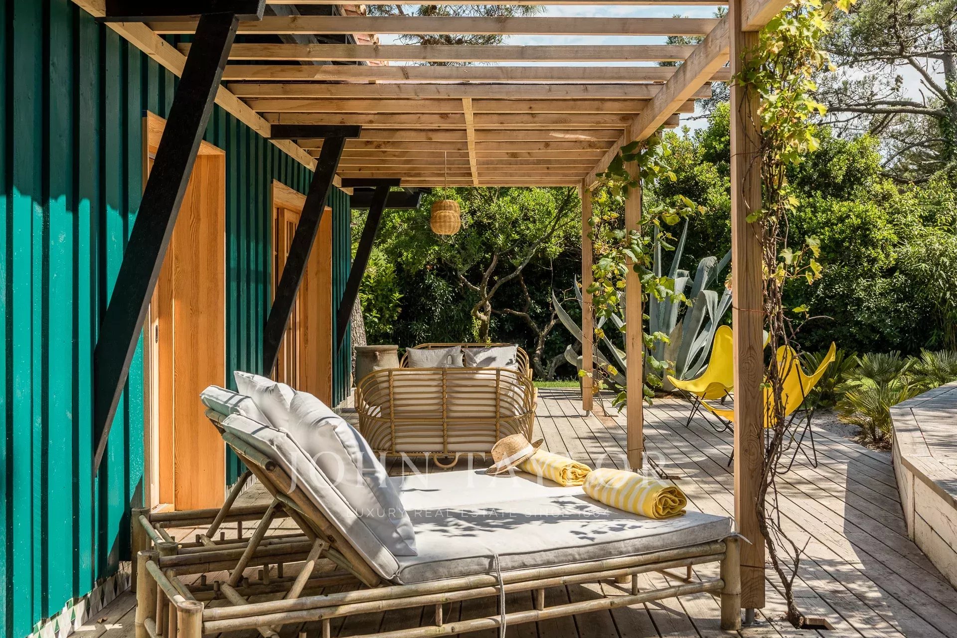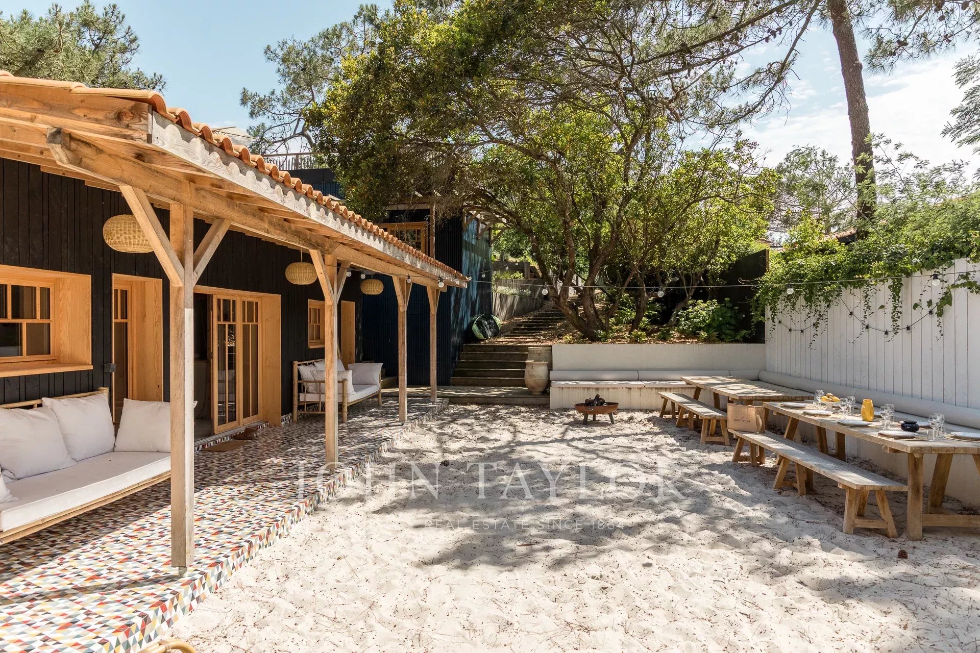 Eine Panoramaterrasse für Yoga oder Kontemplation überragt die Dünen, während die Sommerküche im Stil eines Heurigen zum pulsierenden Herzen der Sommertage wird: gemeinsame Mahlzeiten um den Feuerkorb, Aperitifs mit den Füßen im Sand unter dem Charme der Lichterketten.