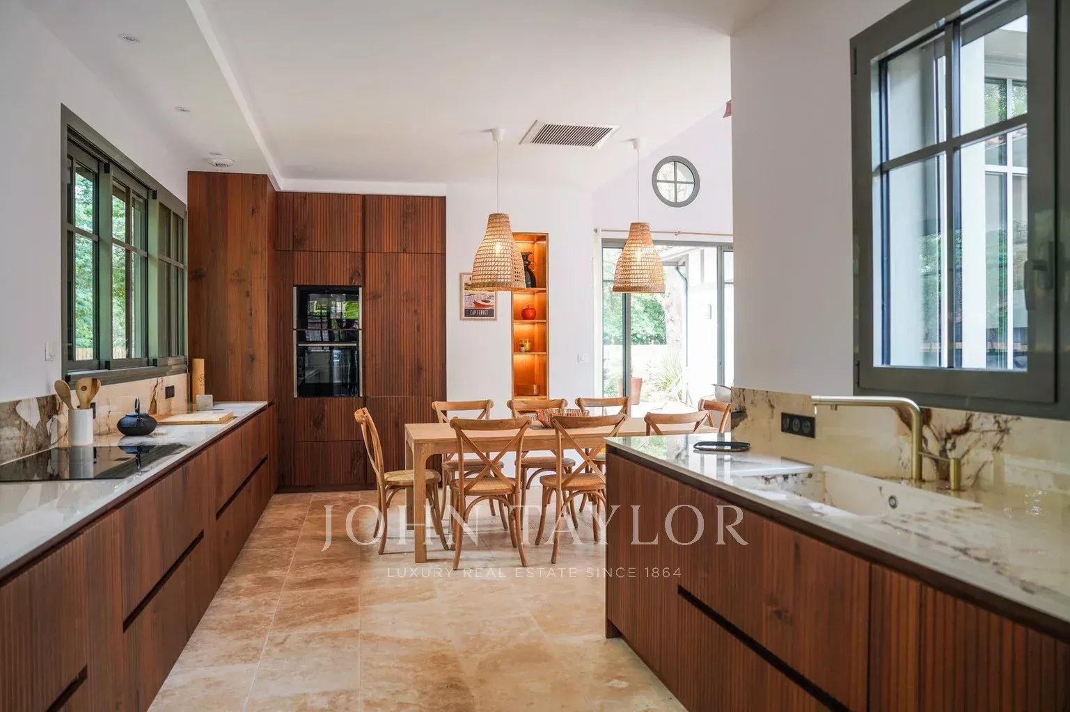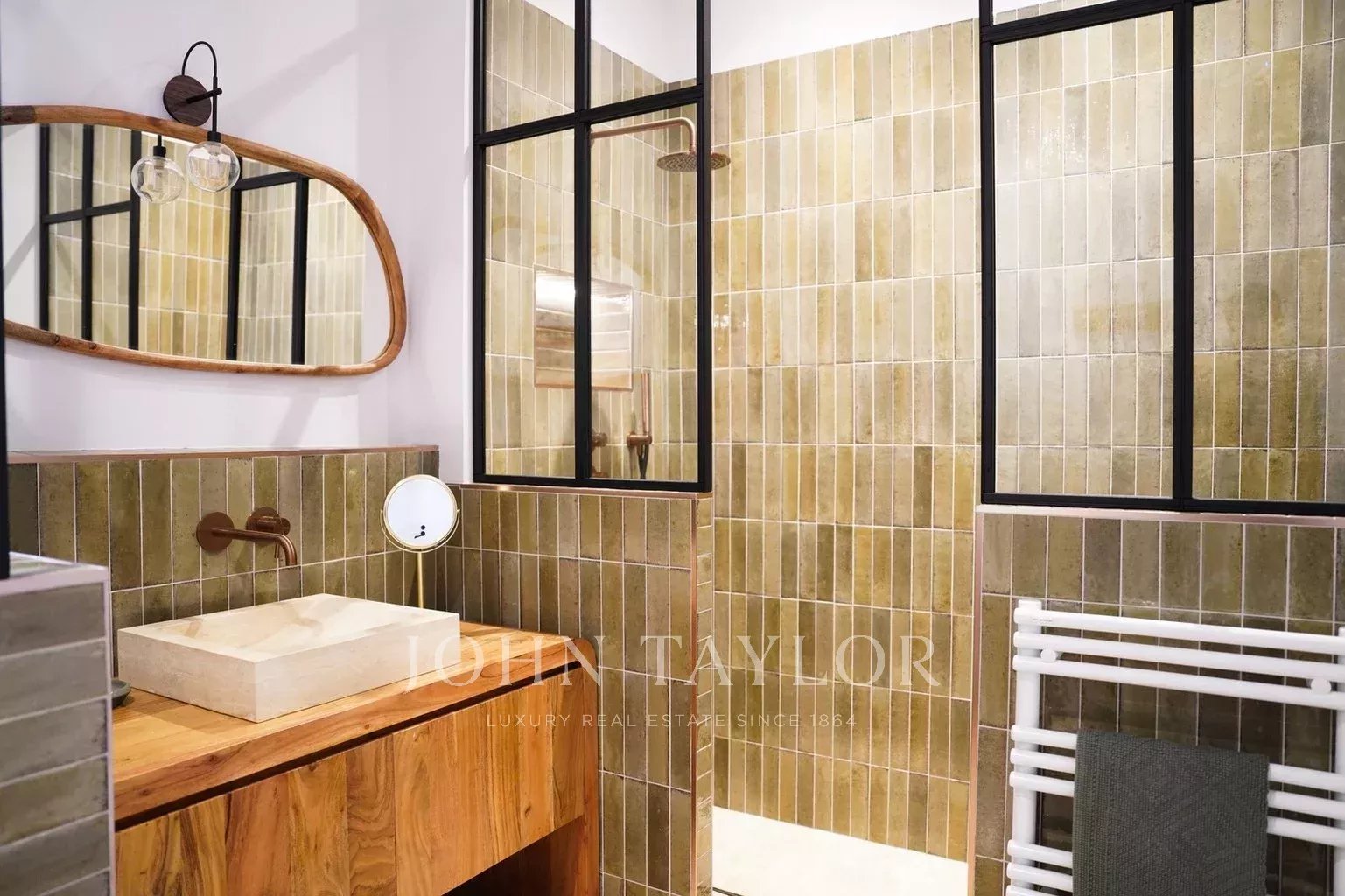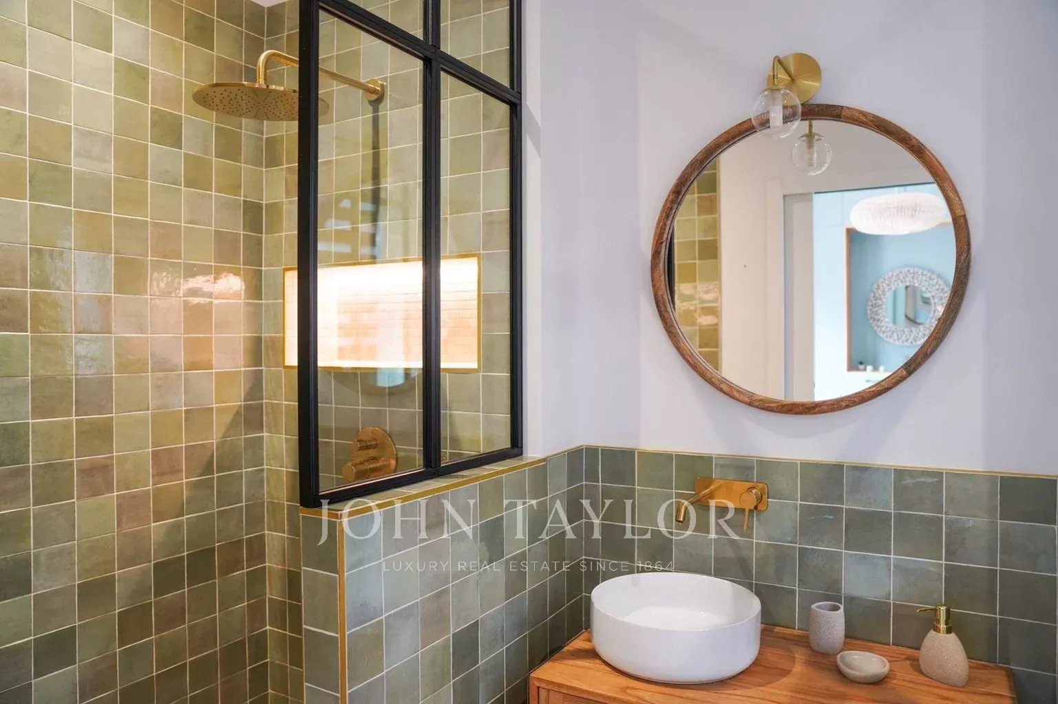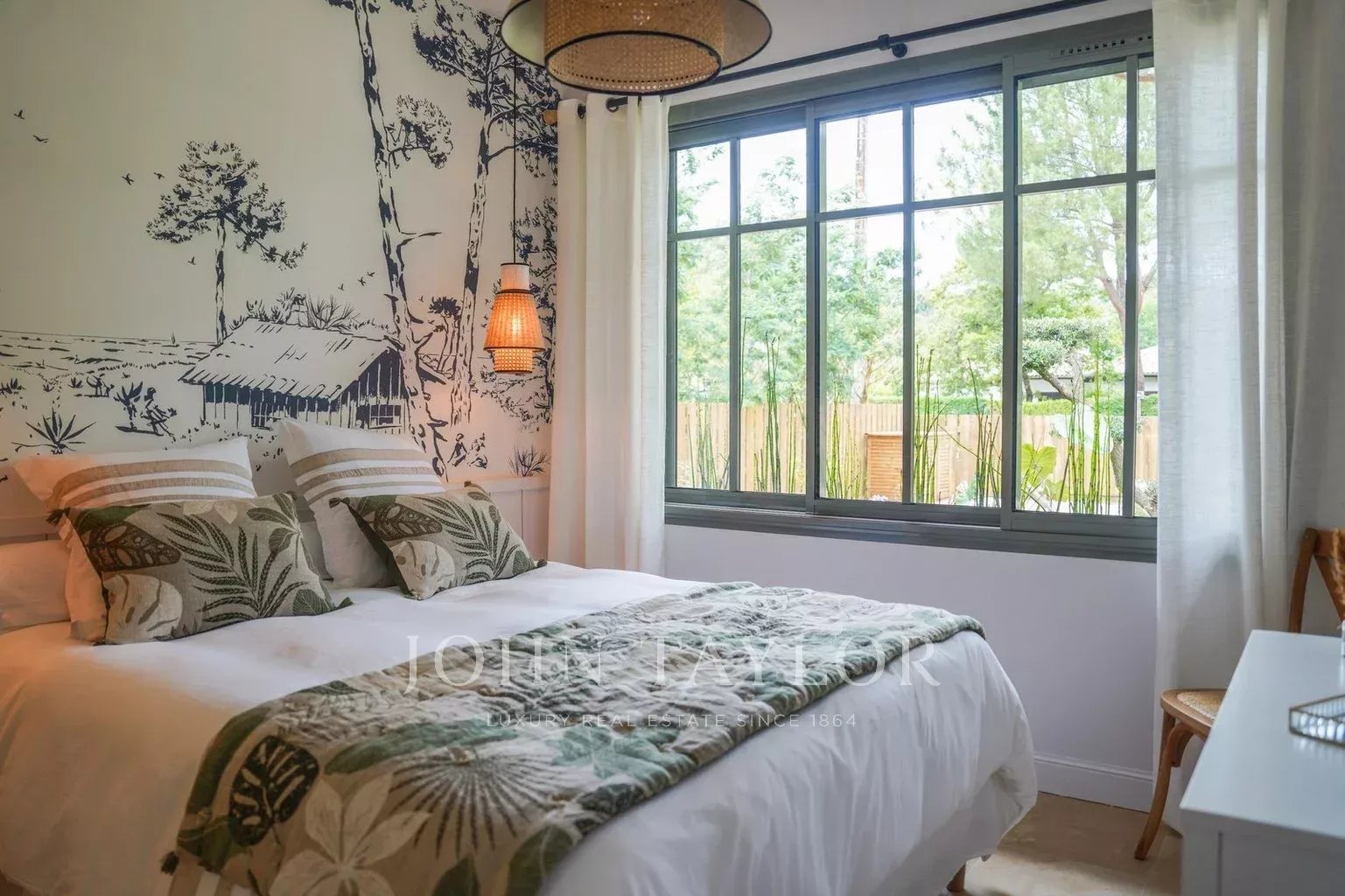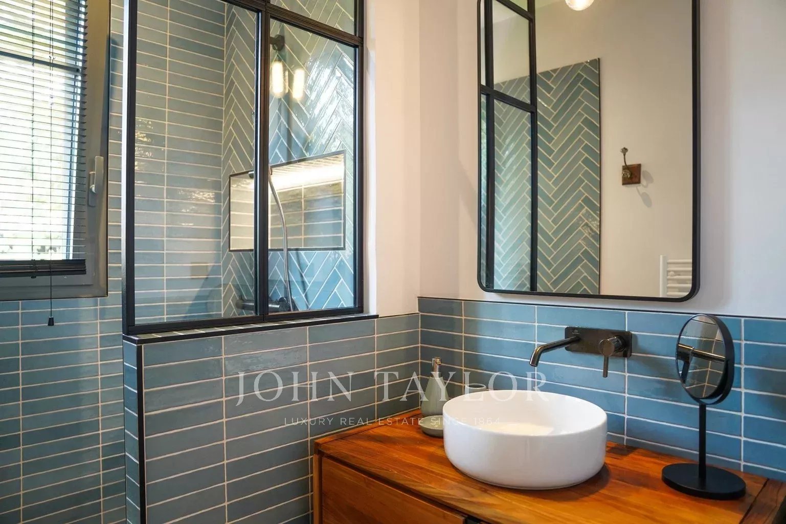 Auf zwei nach Osten und Westen ausgerichteten Terrassen können Sie zu jeder Tageszeit die Sonne genießen. Der Außenbereich bietet einen beheizten Pool (6 x 2,5 m), der durch einen Unterwasserrollladen gesichert ist, eine Sommerküche mit Plancha und Waschbecken, ein Außen-WC sowie einen Bouleplatz, der mit Guinguette-Leuchten beleuchtet ist. Die Gartenmöbel von FERMOB umfassen einen großen Tisch für 10 bis 12 Personen, Sonnenliegen und Gartenmöbel.