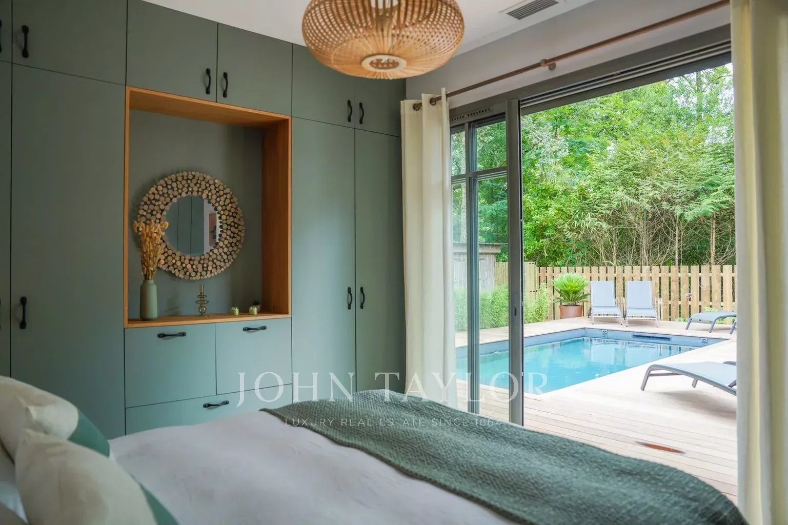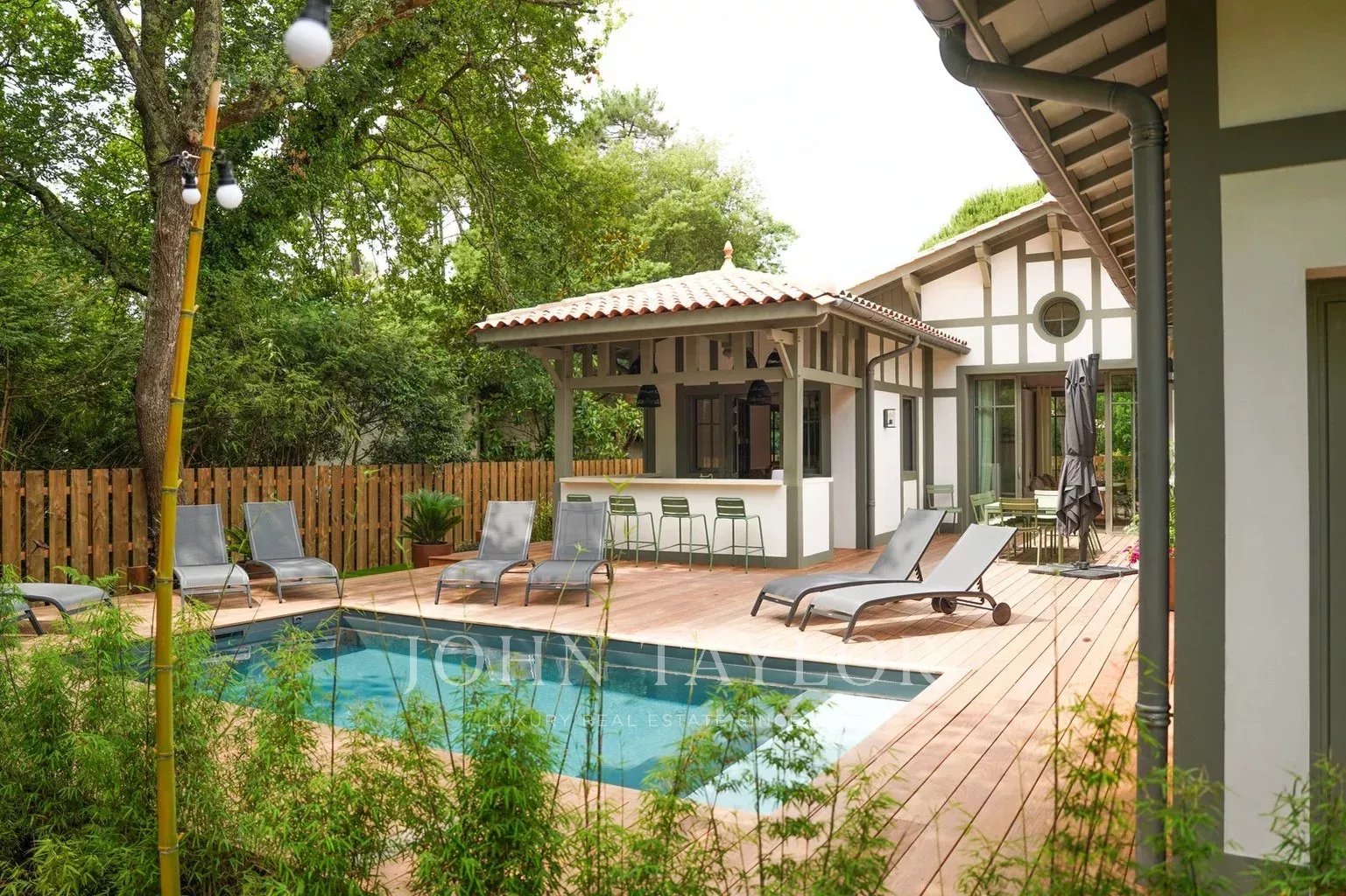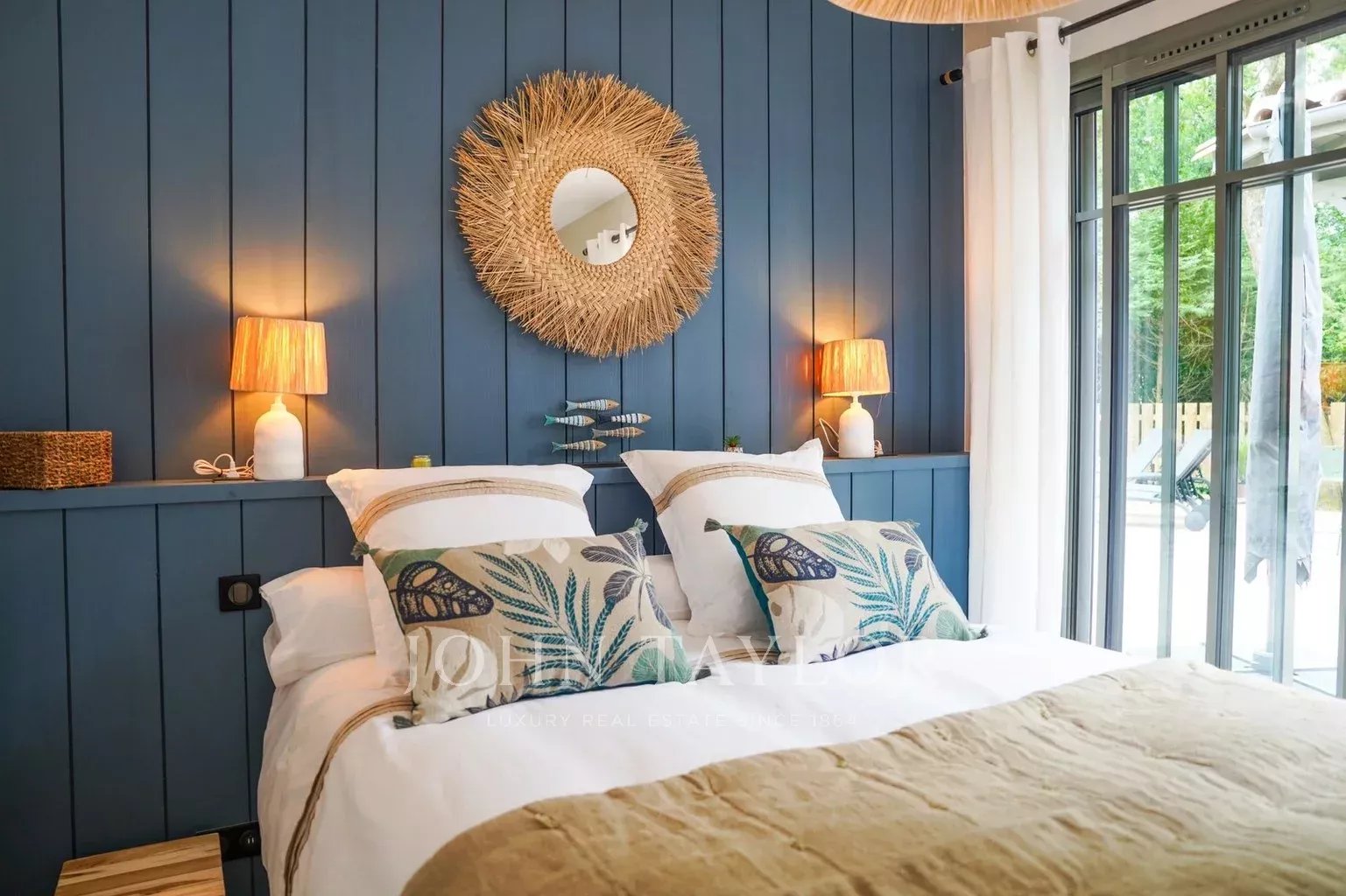 Die Villa La Musicienne liegt in Petit Piquey, nur wenige Minuten von der Pointe aux Chevaux auf der Halbinsel Cap Ferret entfernt. Das neue Anwesen ist von den baskisch-ländischen Häusern des Bassin inspiriert und bietet Platz für bis zu 12 Personen, ideal für einen Urlaub mit der Familie oder mit Freunden.