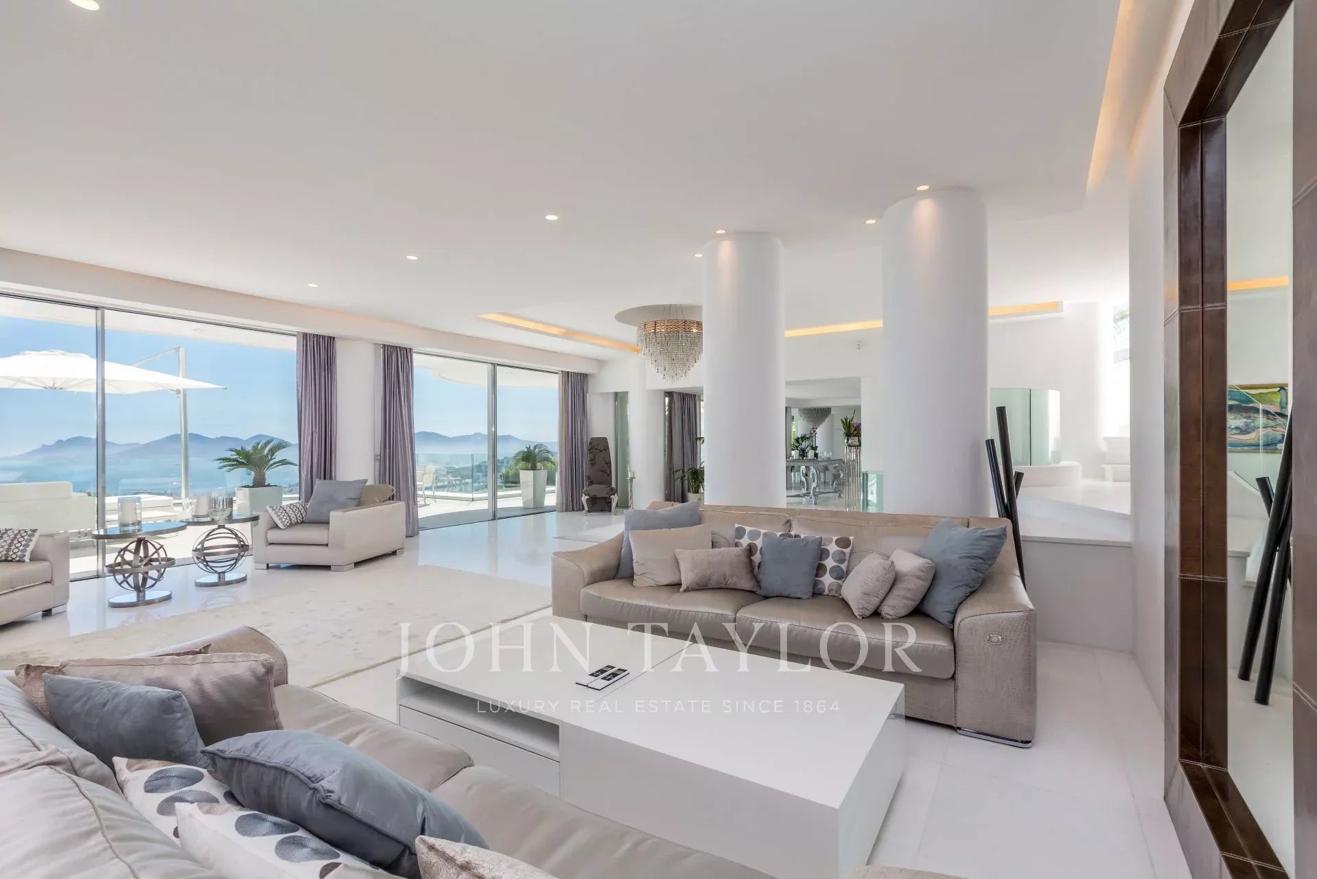 Dreifaches Wohnzimmer mit Zugang zu einer großen Terrasse mit herrlichem Meerblick und Zugang zum Garten.