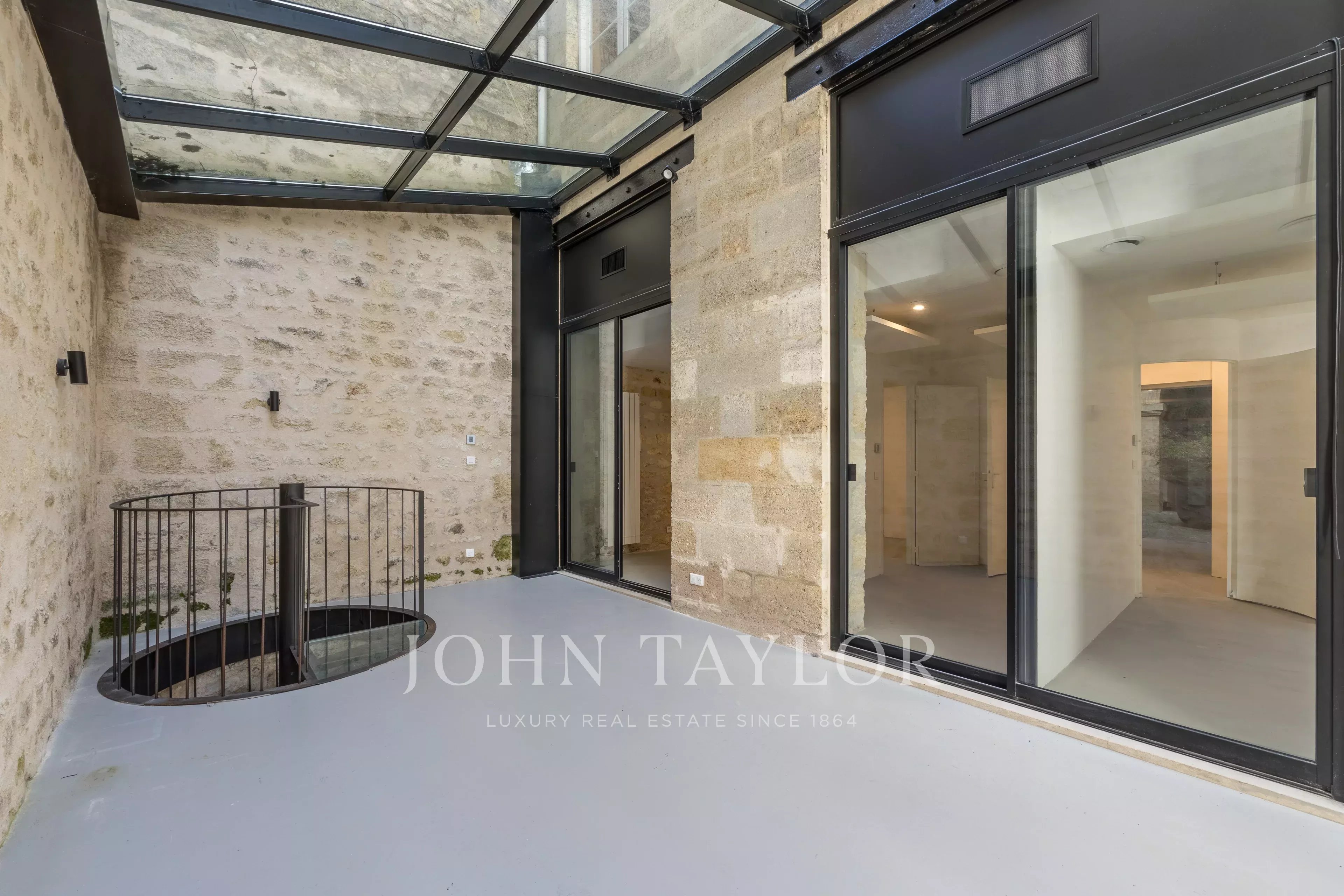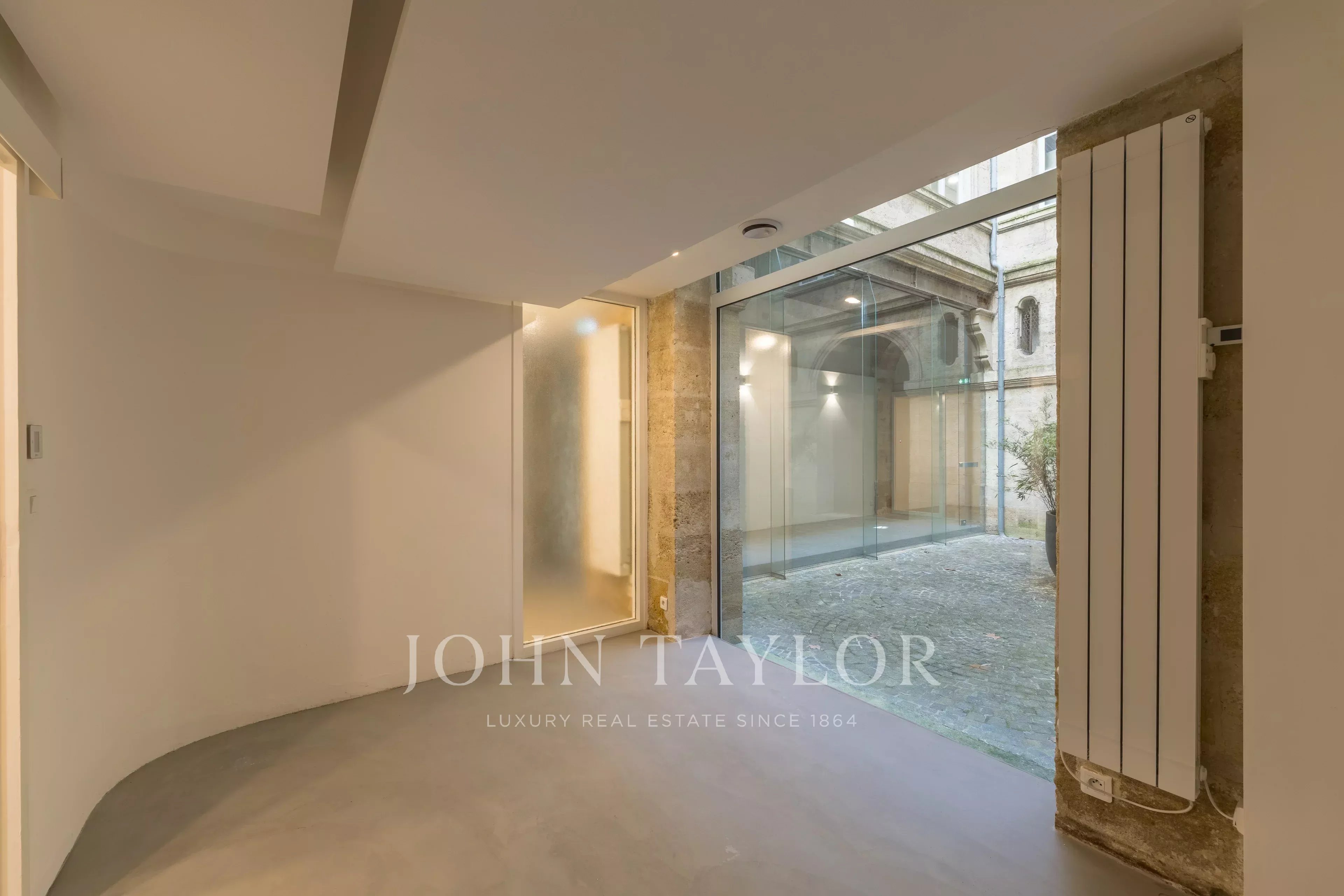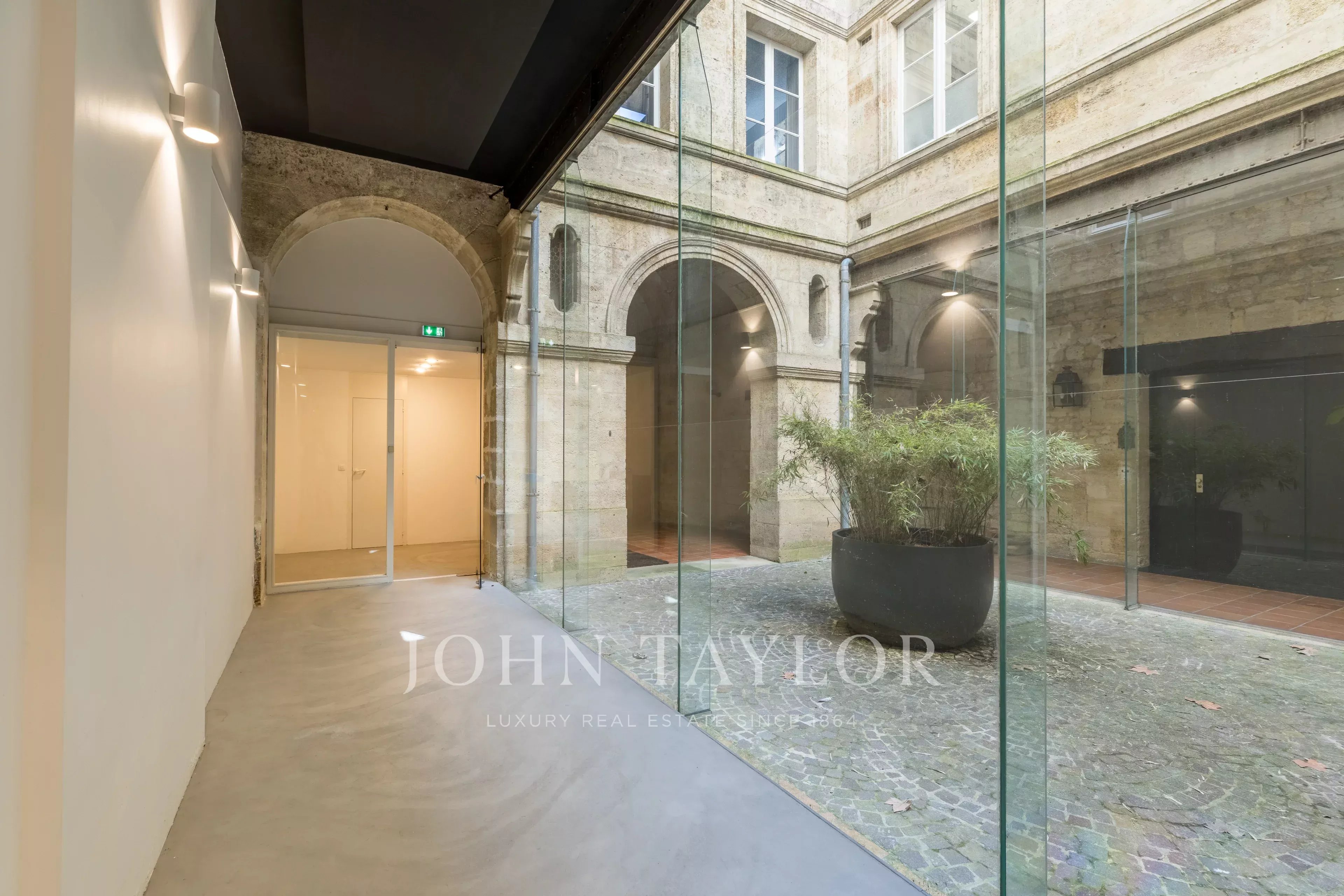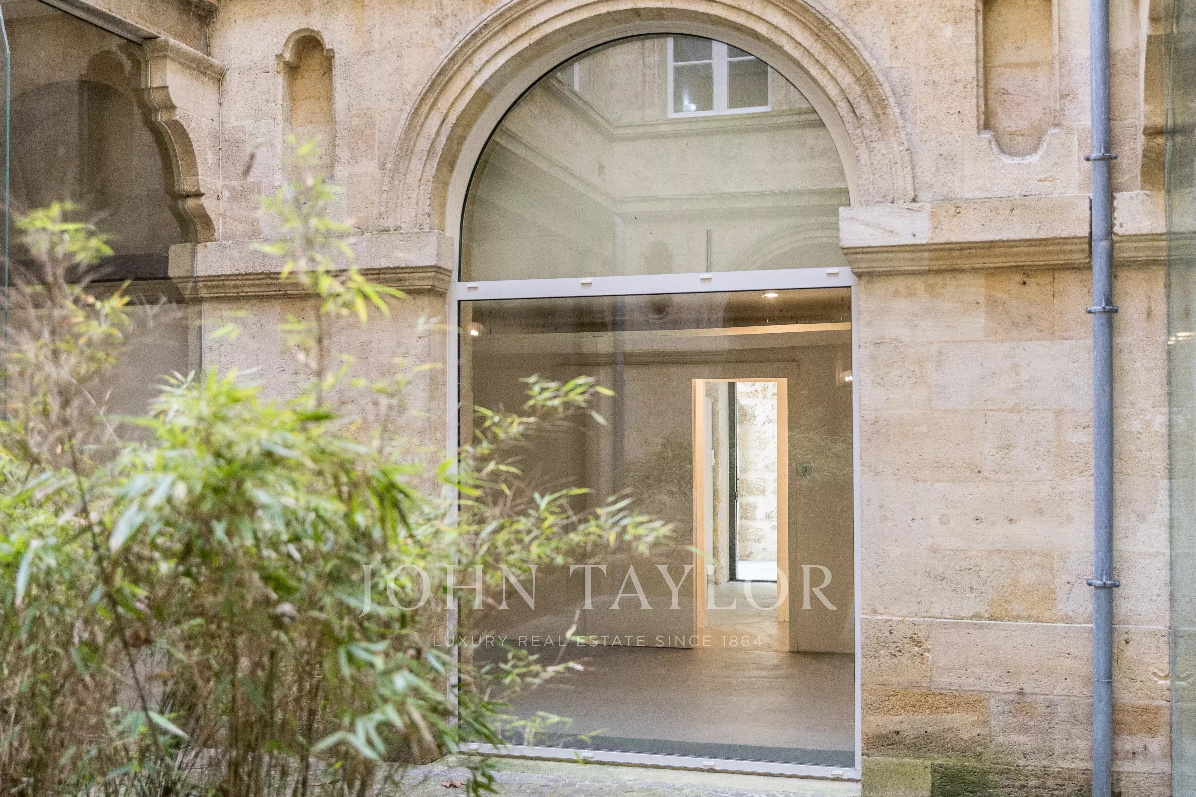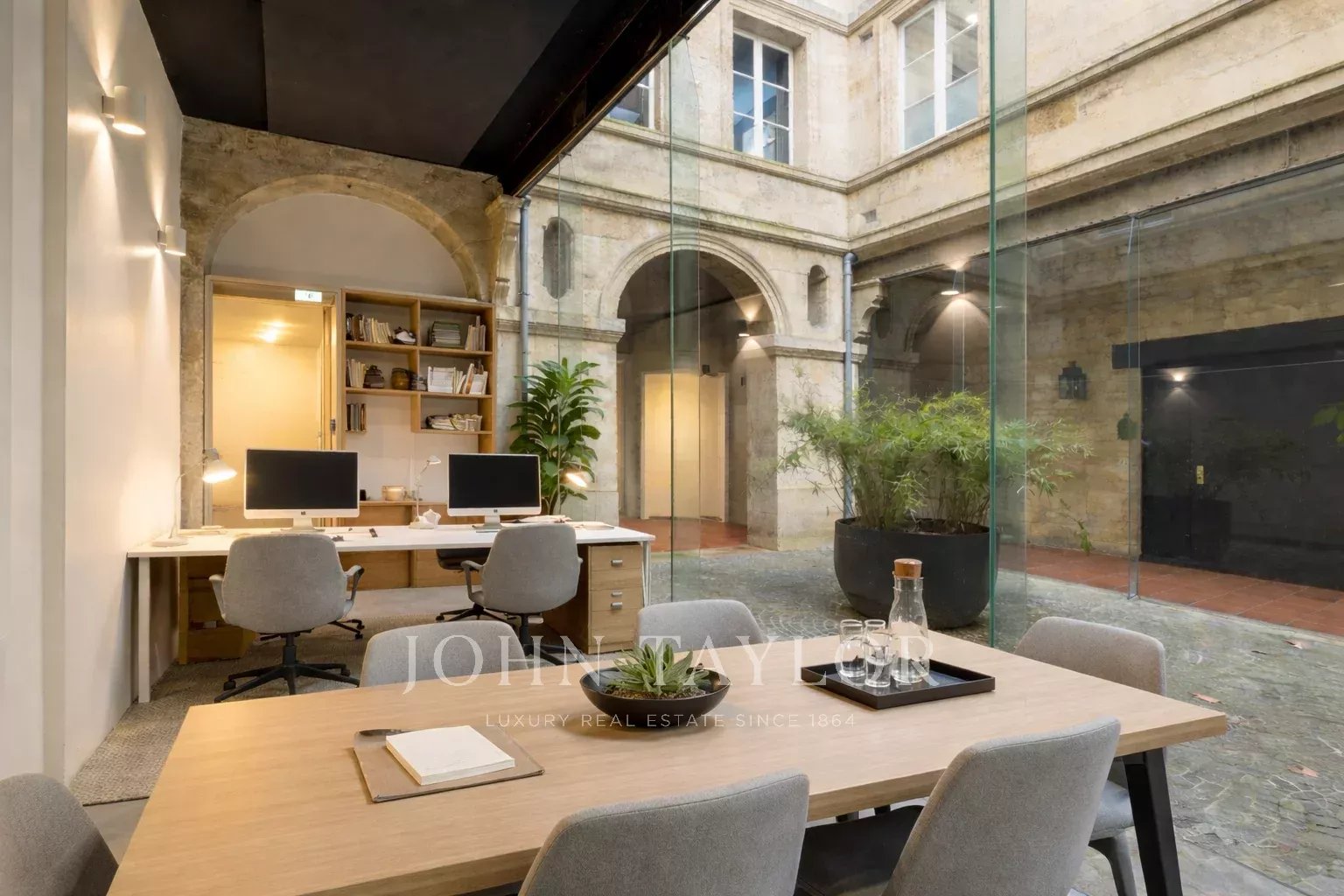 Das Erdgeschoss ist perfekt aufgeteilt und in mehrere separate Zonen gegliedert. Es bietet Arbeitsbereiche, darunter ein großes Raum unter einer Glasüberdachung, das Licht und Charakter bringt, sowie einen angenehmen privaten Hof, der im Herzen der Stadt ein echter Vorteil ist. Im Untergeschoss befindet sich ein gewölbter Raum von 55 m² voller Charme, ideal für Entspannung oder Empfänge.