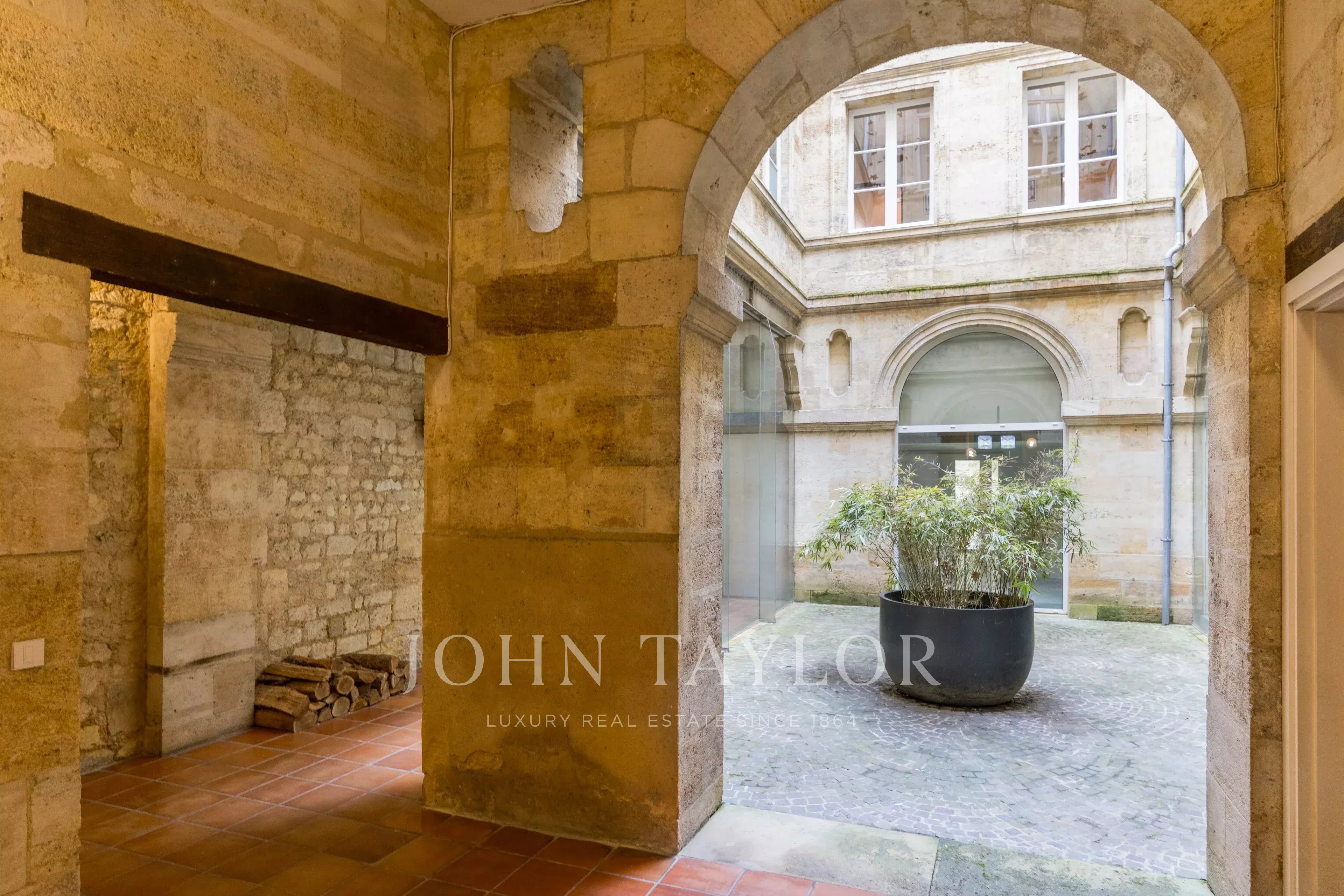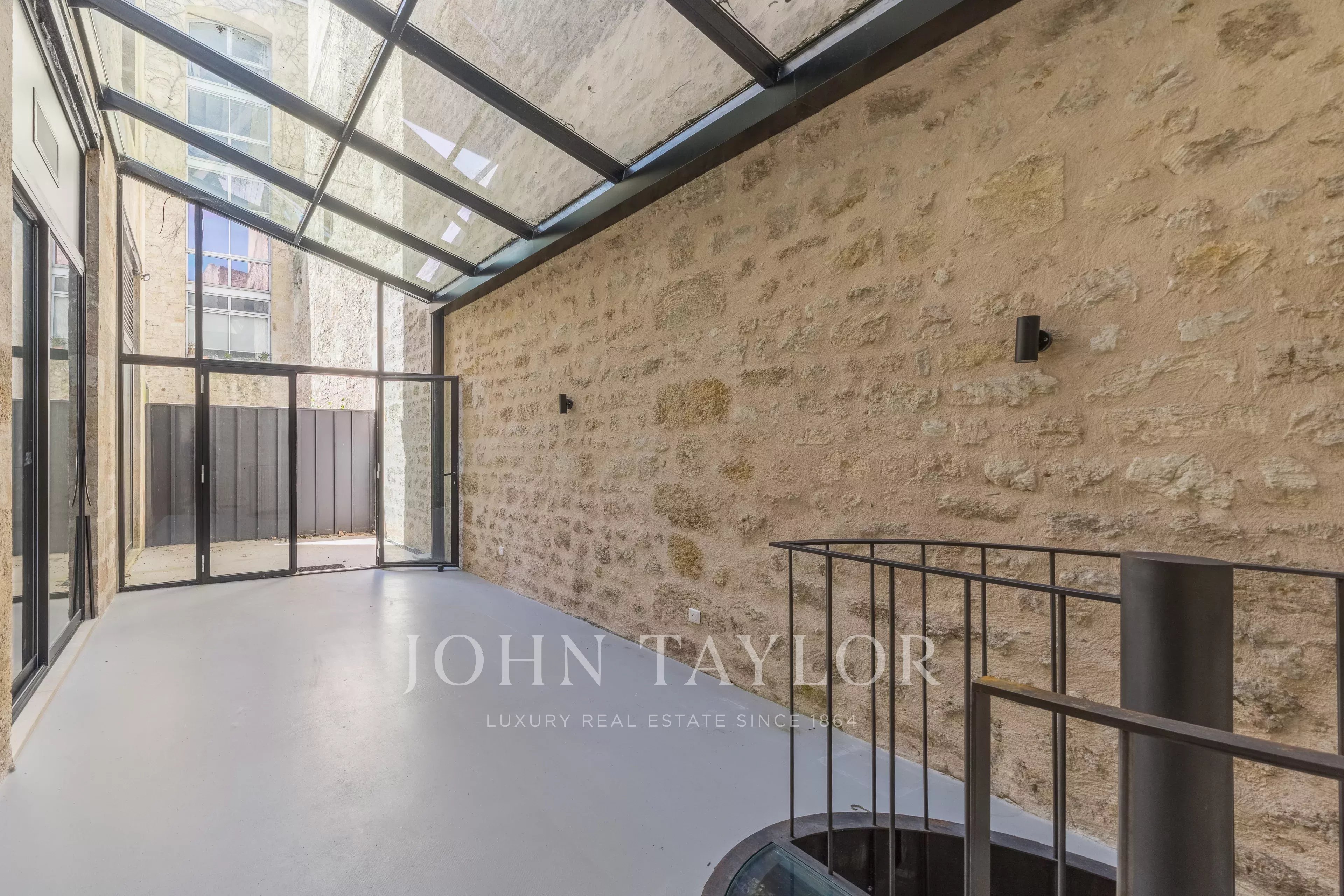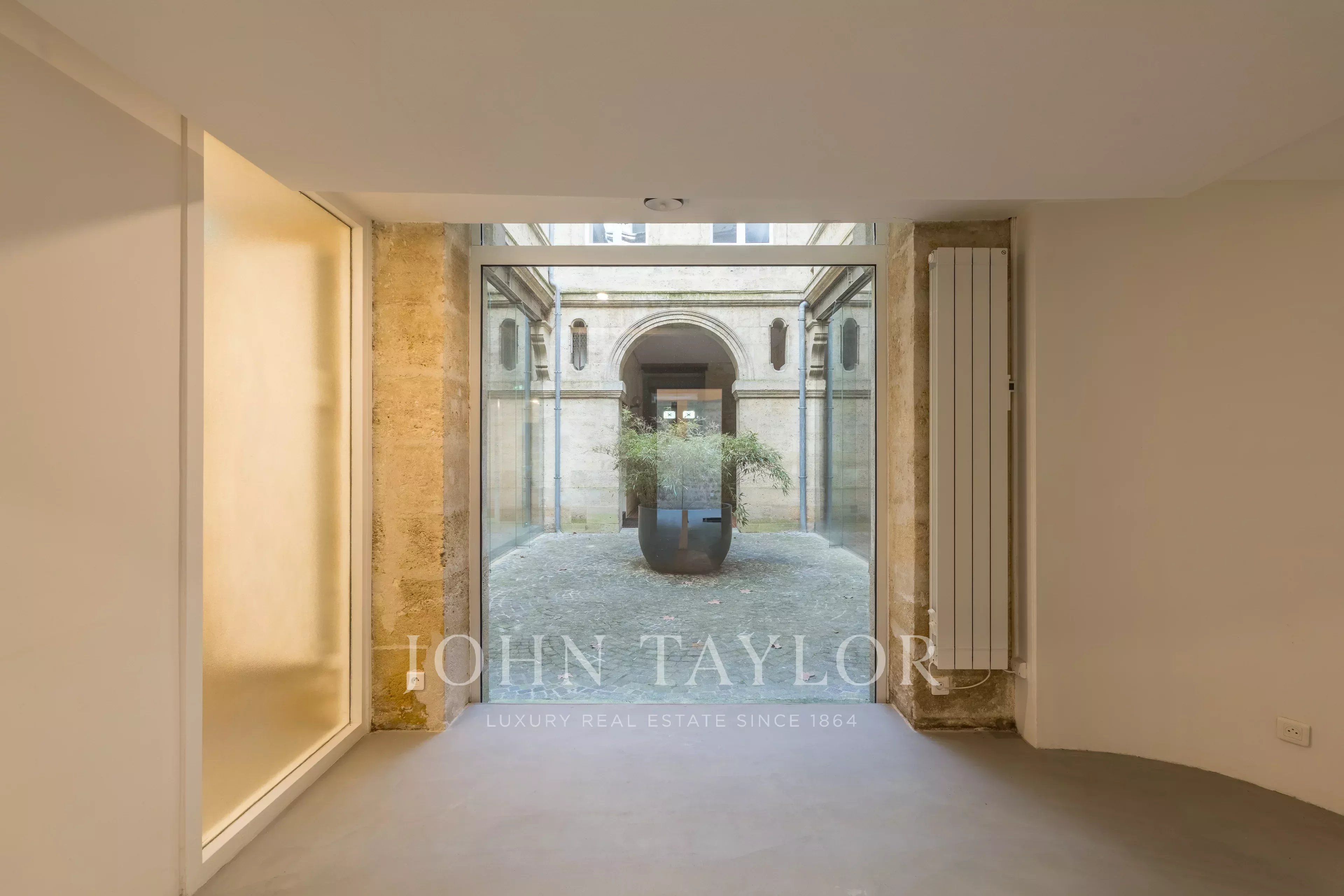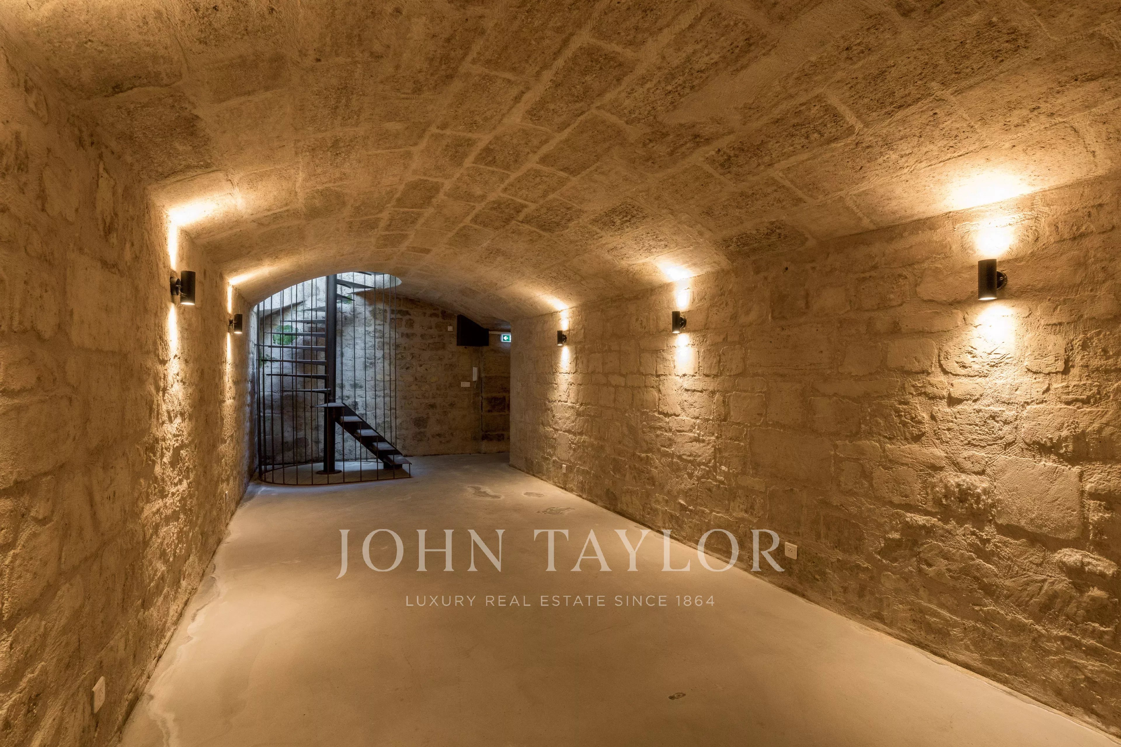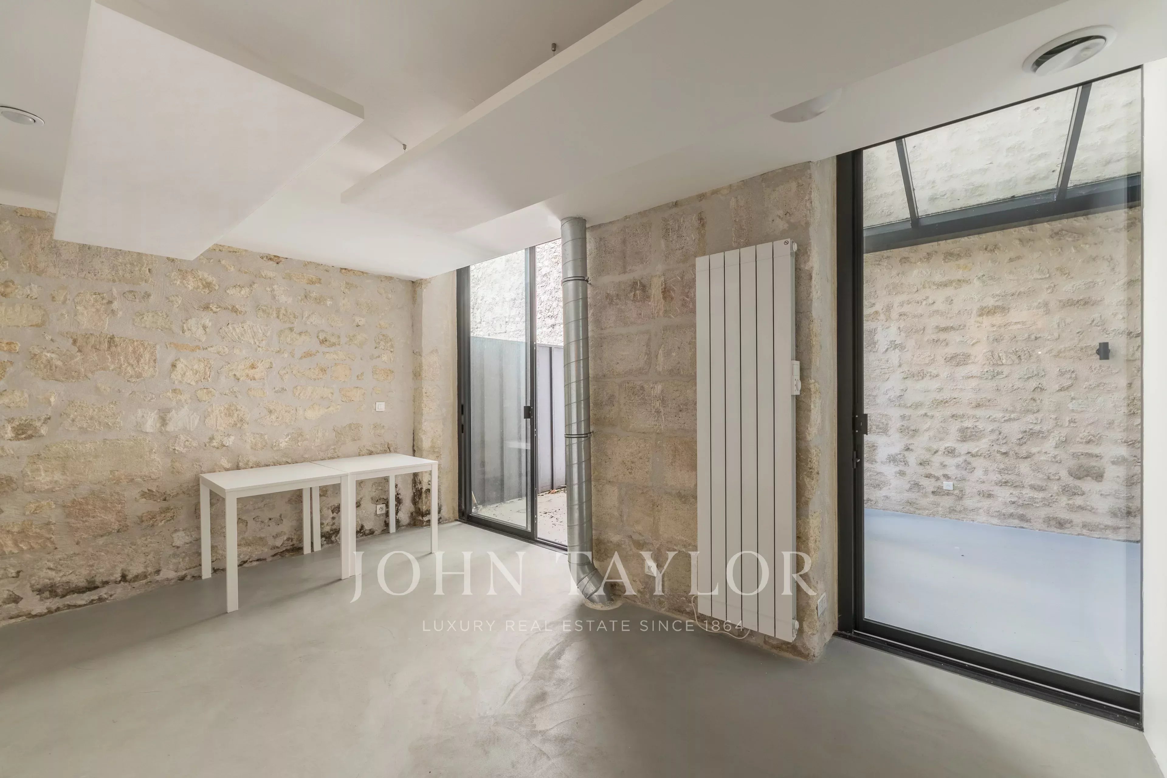 Das Erdgeschoss ist perfekt aufgeteilt und in mehrere separate Zonen gegliedert. Es bietet Arbeitsbereiche, darunter ein großes Raum unter einer Glasüberdachung, das Licht und Charakter bringt, sowie einen angenehmen privaten Hof, der im Herzen der Stadt ein echter Vorteil ist. Im Untergeschoss befindet sich ein gewölbter Raum von 55 m² voller Charme, ideal für Entspannung oder Empfänge.