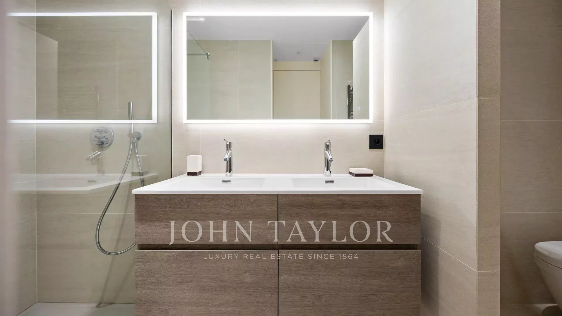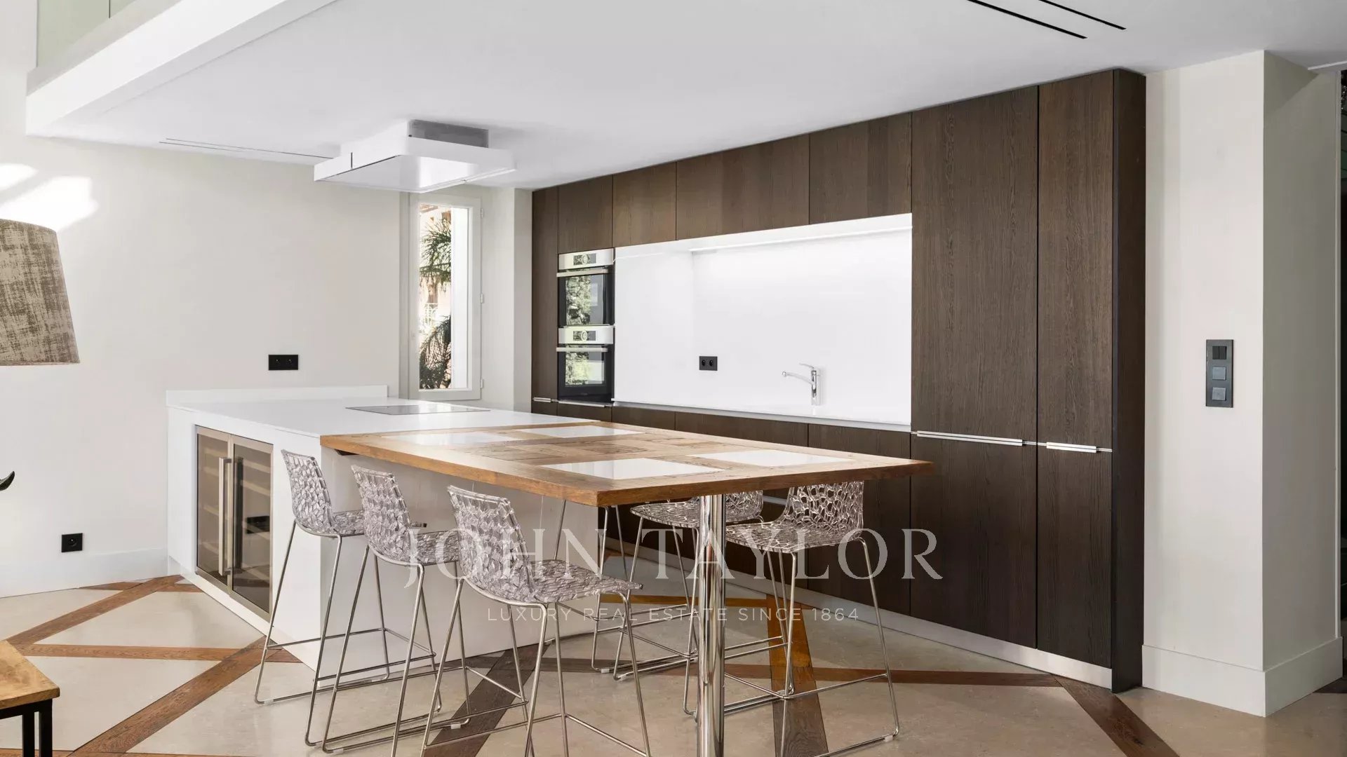 Sie besteht aus einem nach Süden ausgerichteten Wohn- und Essbereich, einer voll ausgestatteten Küche, einer Bibliothek und einem Büro im Zwischengeschoss sowie drei Schlafzimmern und drei Duschbädern.