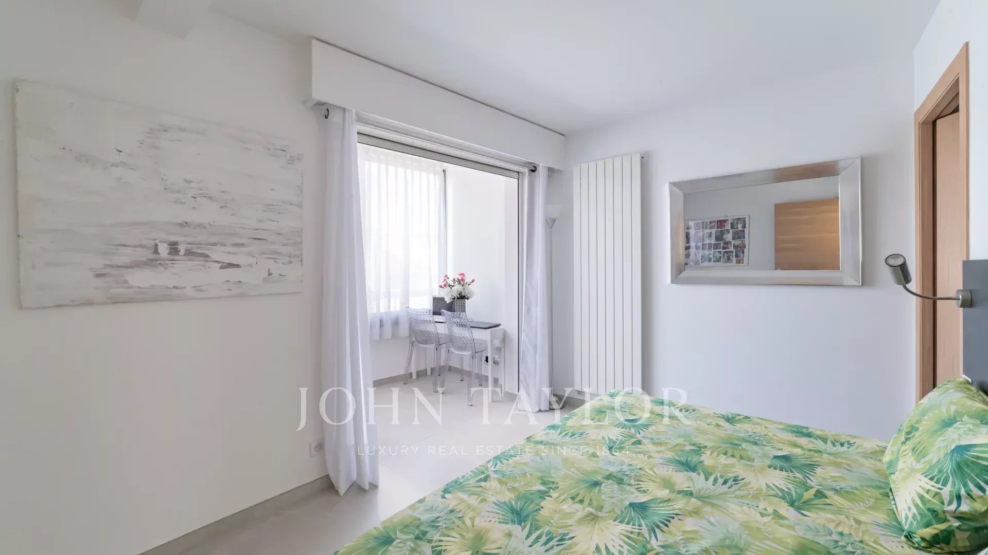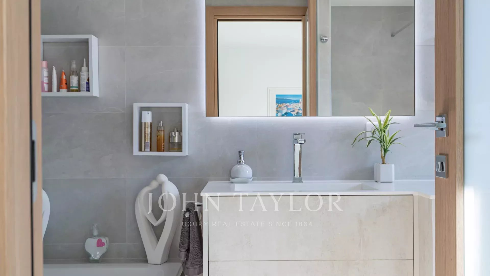 Mit einer Wohnfläche von 76 m² profitiert sie von drei integrierten und unabhängigen Klimaanlagen. Sie besteht aus einem Eingangsbereich mit viel Stauraum, einem Wohnzimmer mit amerikanischer Küche, das sich zur Terrasse hin öffnet, einem Gäste-WC, einem Schlafzimmer mit Bad, einem weiteren Schlafzimmer mit Duschbad und WC sowie einem Bürobereich.