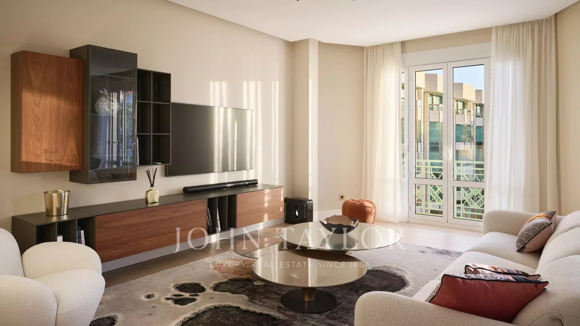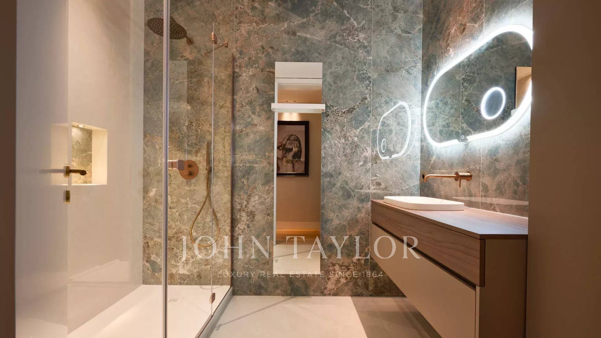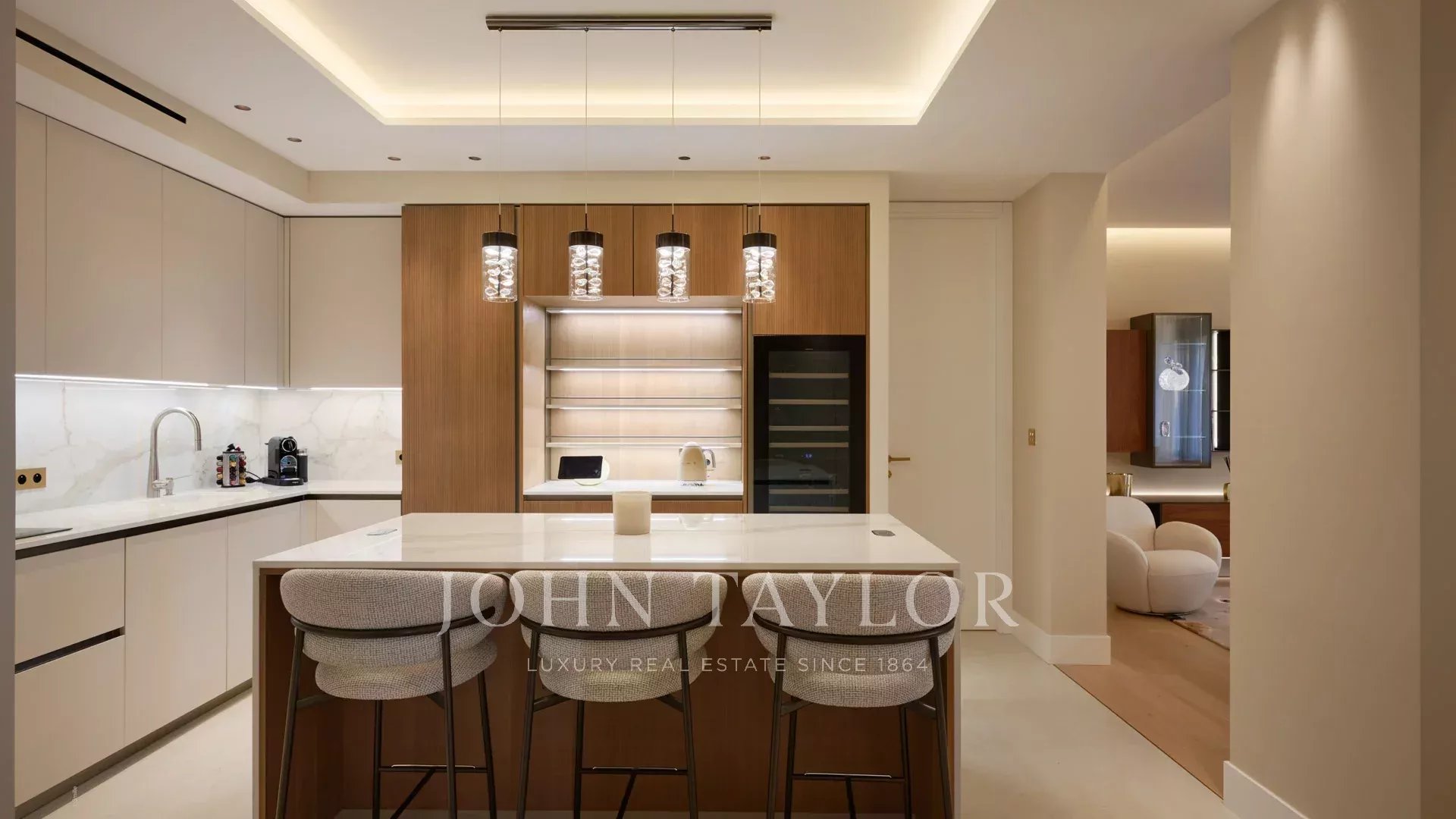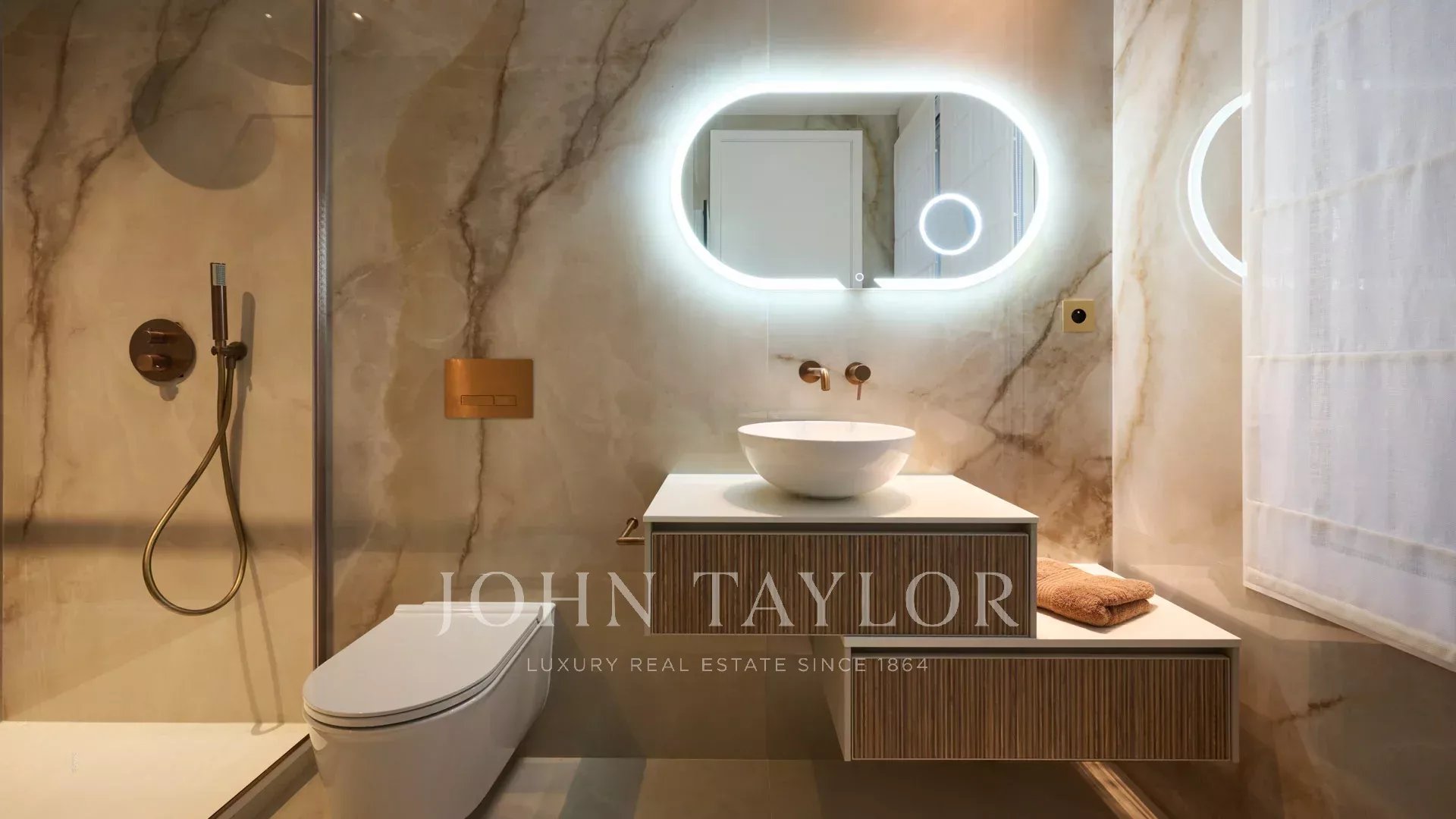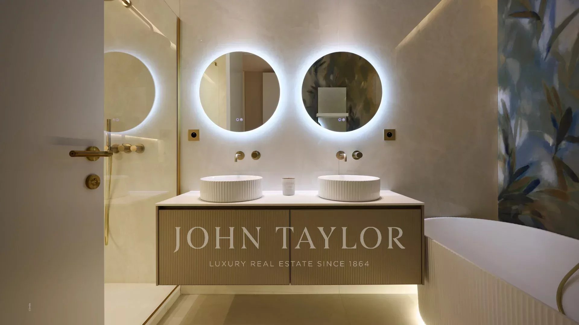 Die Wohnung besteht aus einem Eingangsbereich, einer amerikanischen Küche, die sich zu einem großen, hellen Wohn- und Esszimmer hin öffnet. Es verfügt über drei Schlafzimmer en suite, jedes mit eigenem Duschbad, sowie über ein Gäste-WC und eine Waschküche.