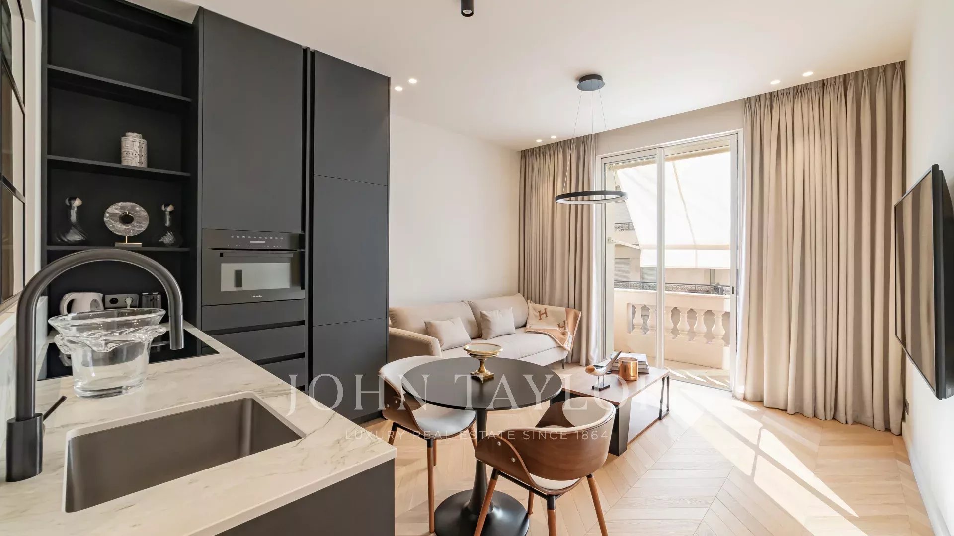 Im zentralen Teil von La Croisette in einer luxuriösen Residenz mit Concierge-Service, wunderschöne Wohnung, die wie eine Suite in einem Palast renoviert wurde und einen kleinen Balkon mit seitlichem Meerblick bietet.