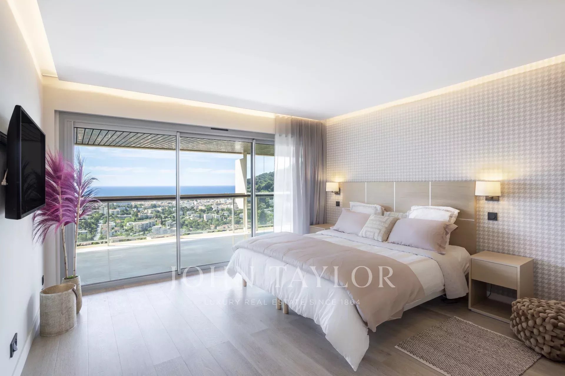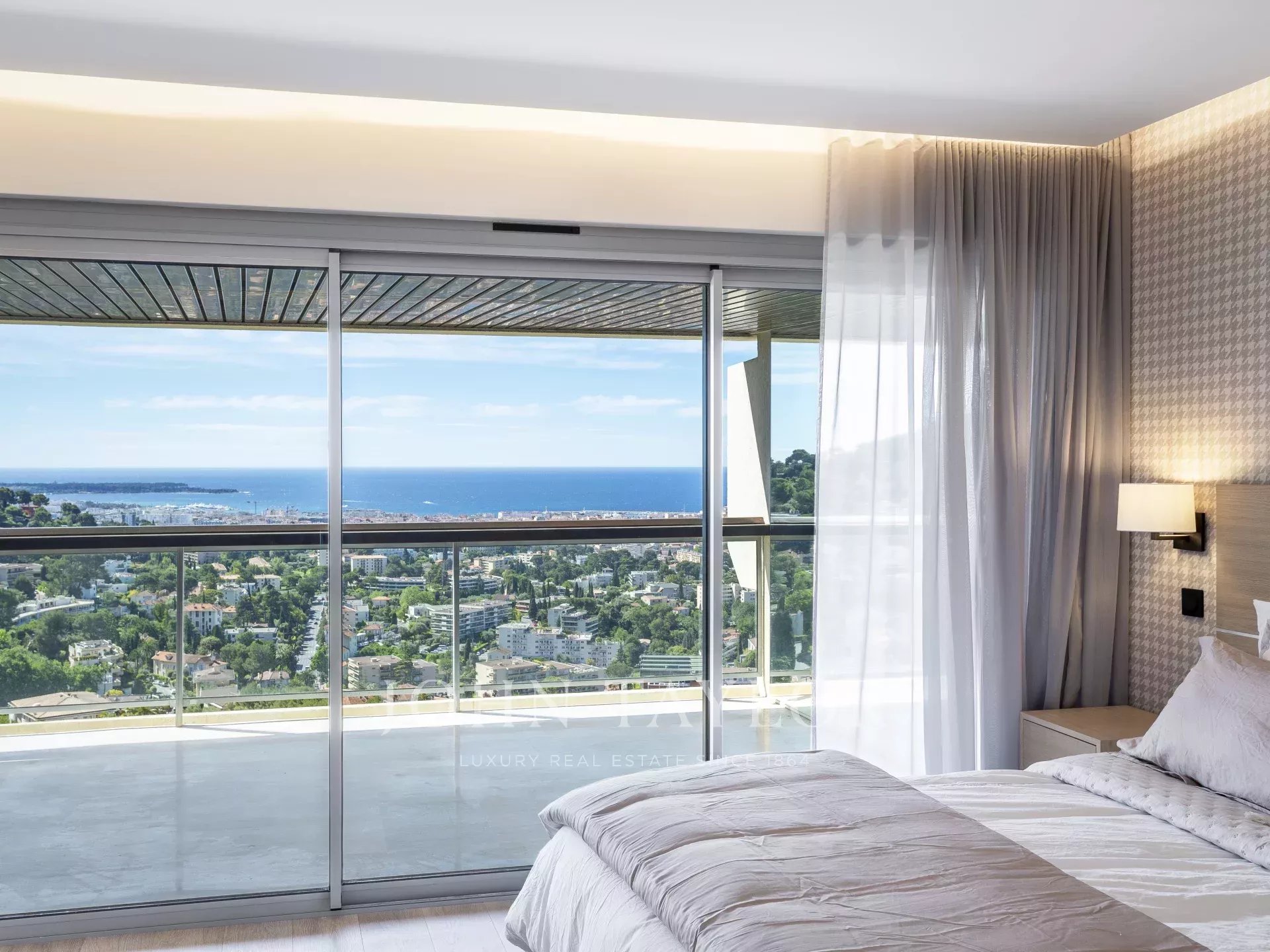 In einer prestigeträchtigen Residenz in Le Cannet Résidentiel bietet diese Dachgeschosswohnung eine ideale, ruhige Umgebung mit einem herrlichen Panoramablick auf die Bucht von Cannes von den Lérins-Inseln bis zum Esterel-Massiv.