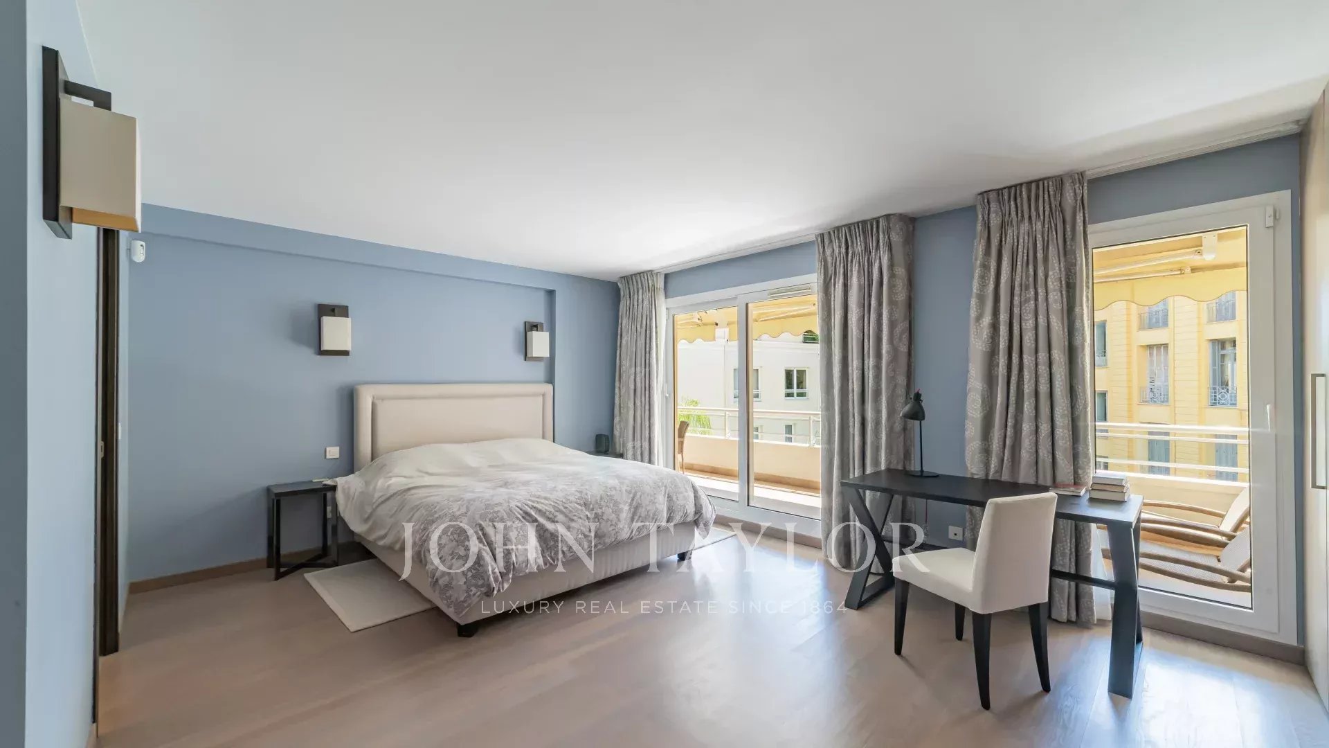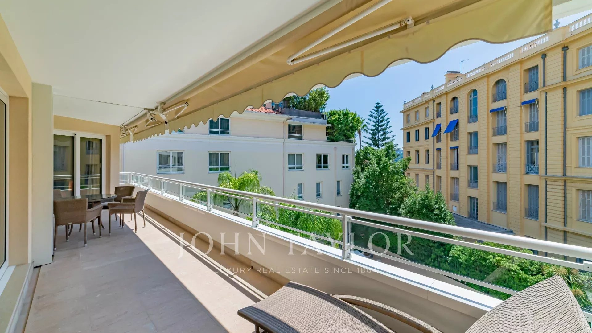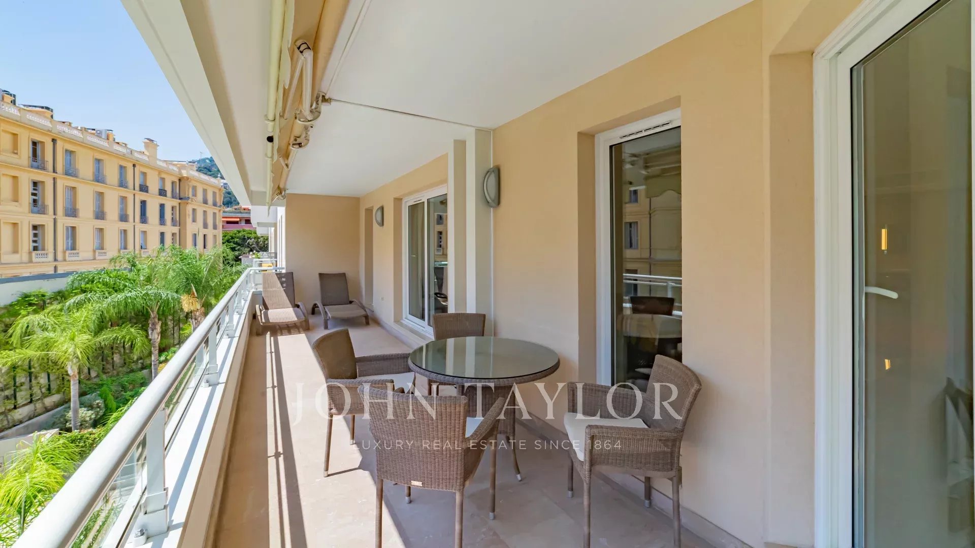 Das Wohnzimmer und ein Schlafzimmer führen auf eine große Terrasse, die nach Süden ausgerichtet ist und einen schönen Blick auf den Pool dieser Residenz mit Concierge bietet.