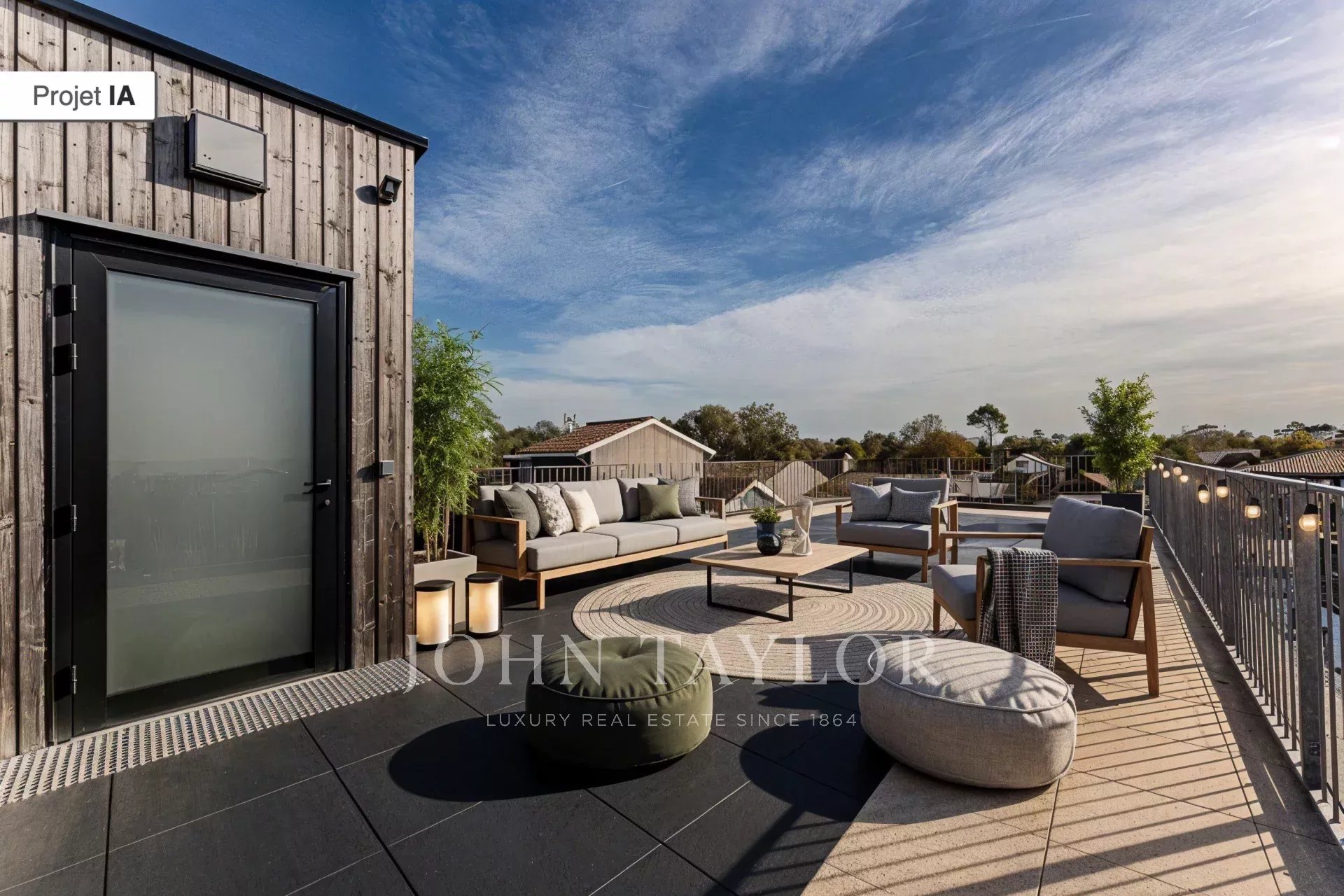 - Ein spektakuläres 76 m² großes Rooftop in der oberen Etage, das ein einzigartiges und kontemplatives Panorama auf das Bassin d'Arcachon bietet.