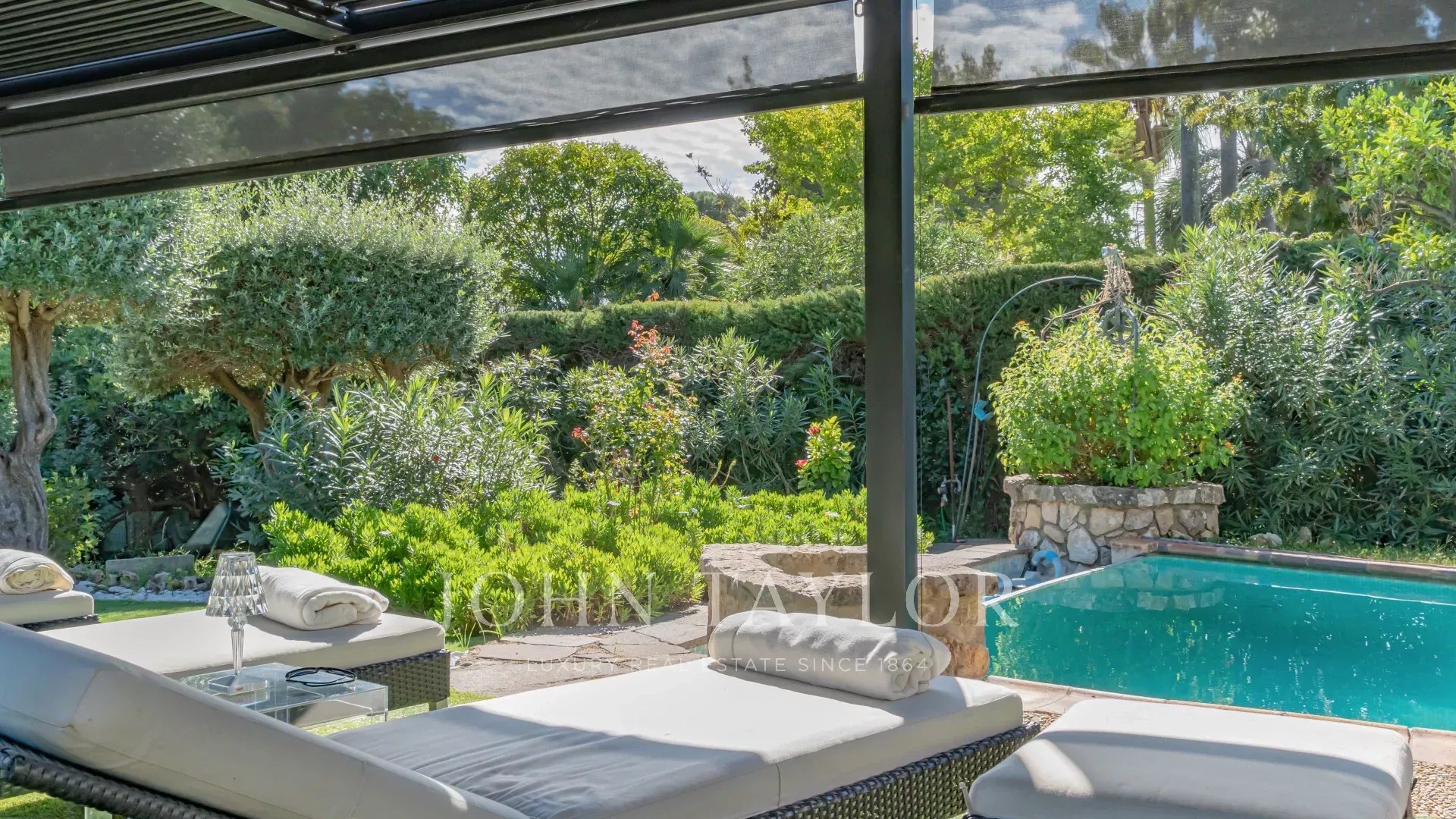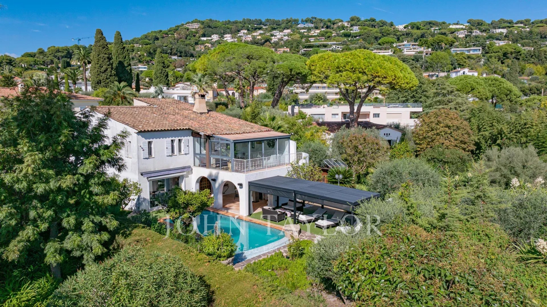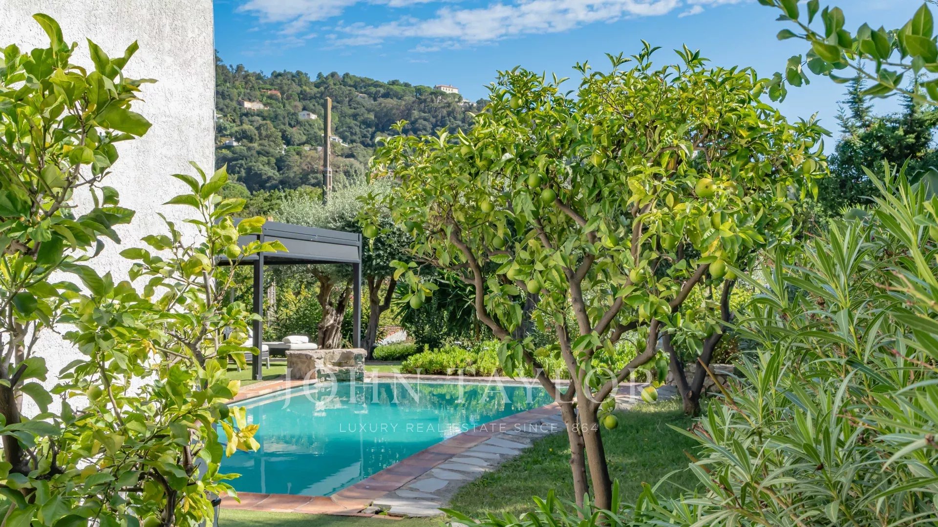 In der Nähe des Stadtzentrums genießt diese Villa eine grüne Umgebung. Ihr Außenbereich ist mit zahlreichen mediterranen Baumarten bepflanzt und bietet mehrere Terrassen, die den Pool umgeben.