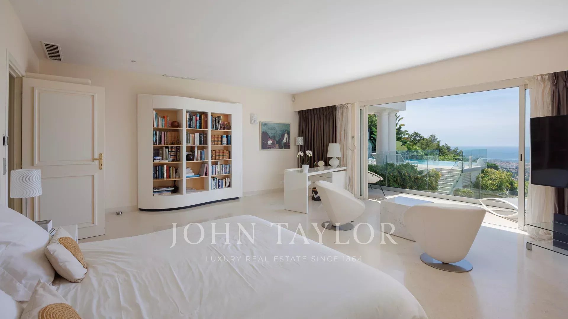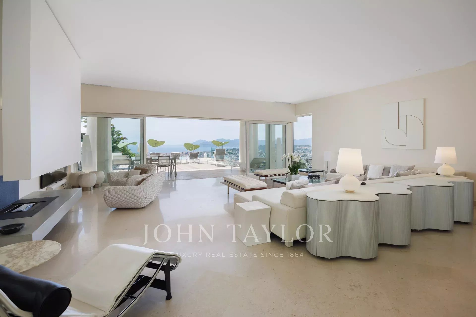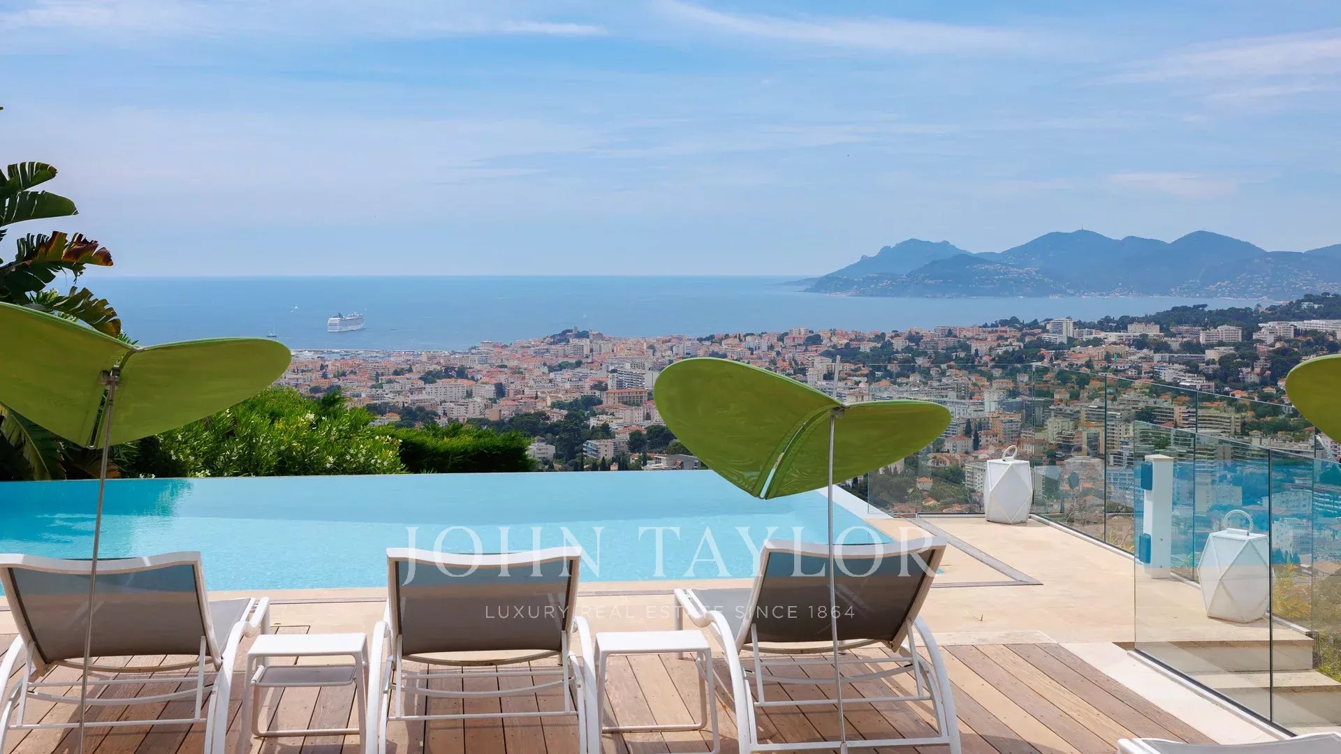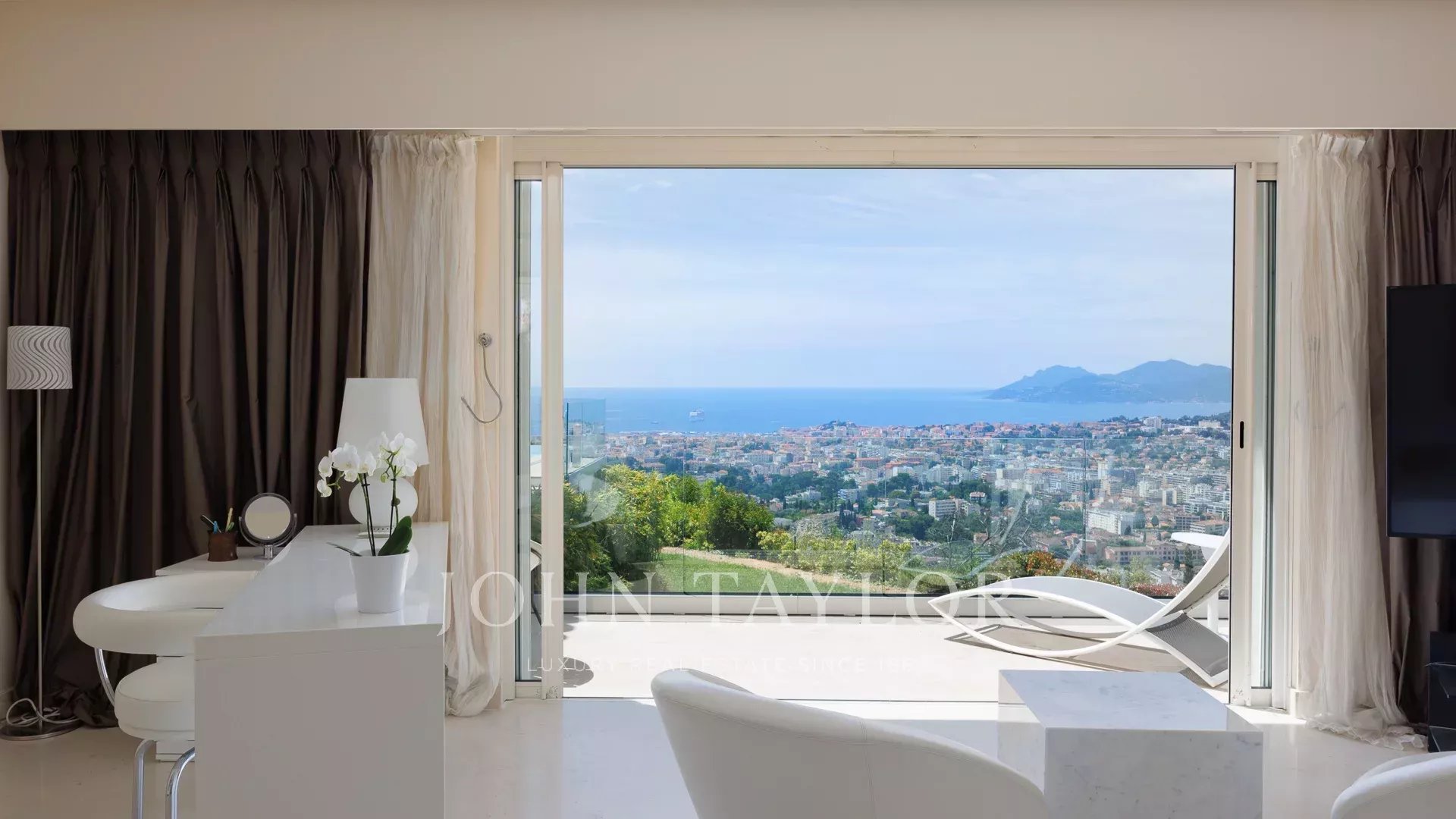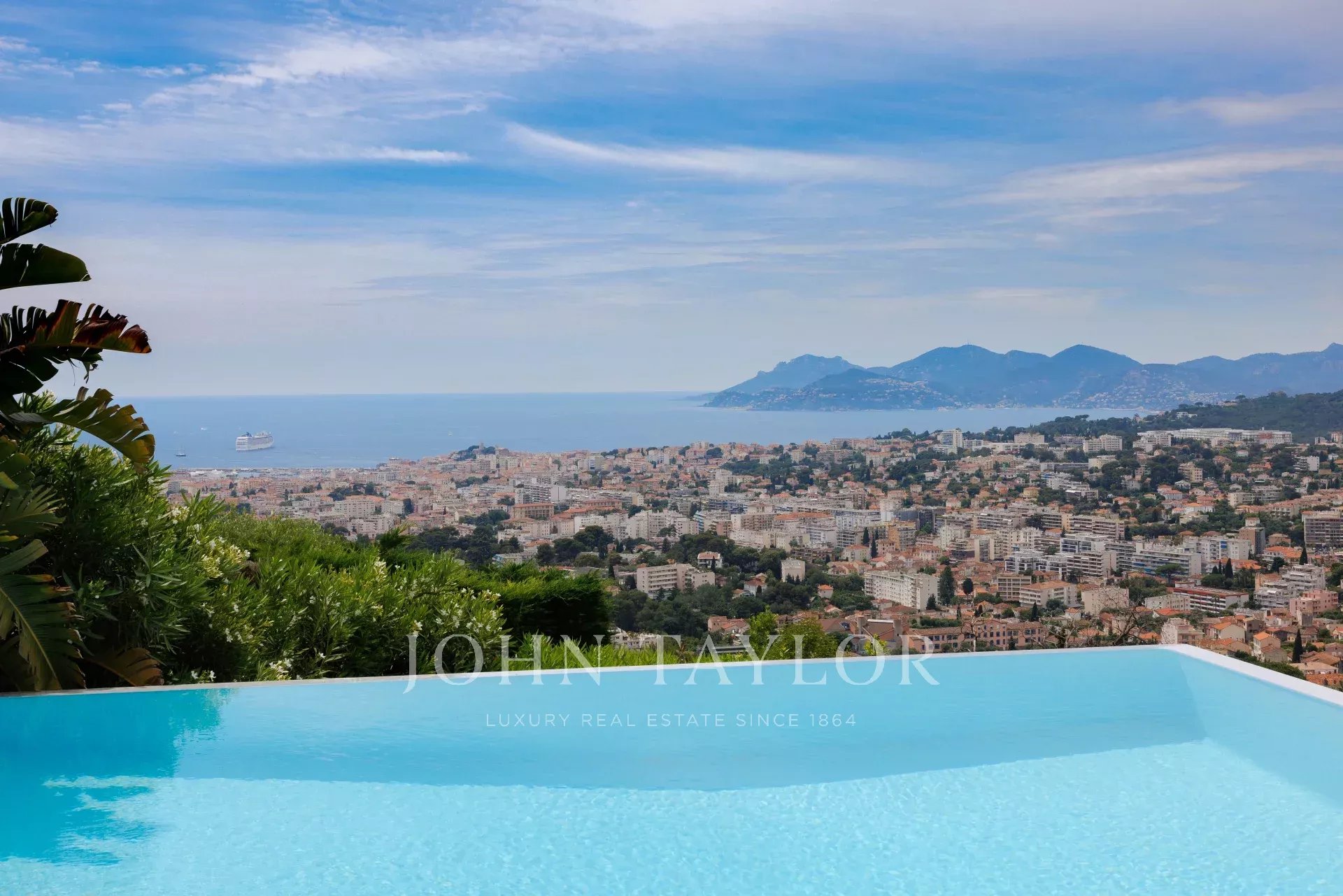 Diese wunderschöne, zeitgenössische, neue und voll klimatisierte Villa liegt auf den Anhöhen von Cannes in einem privaten Anwesen und bietet einen wunderschönen Meerblick auf die Bucht von Cannes und das Esterel-Massiv.