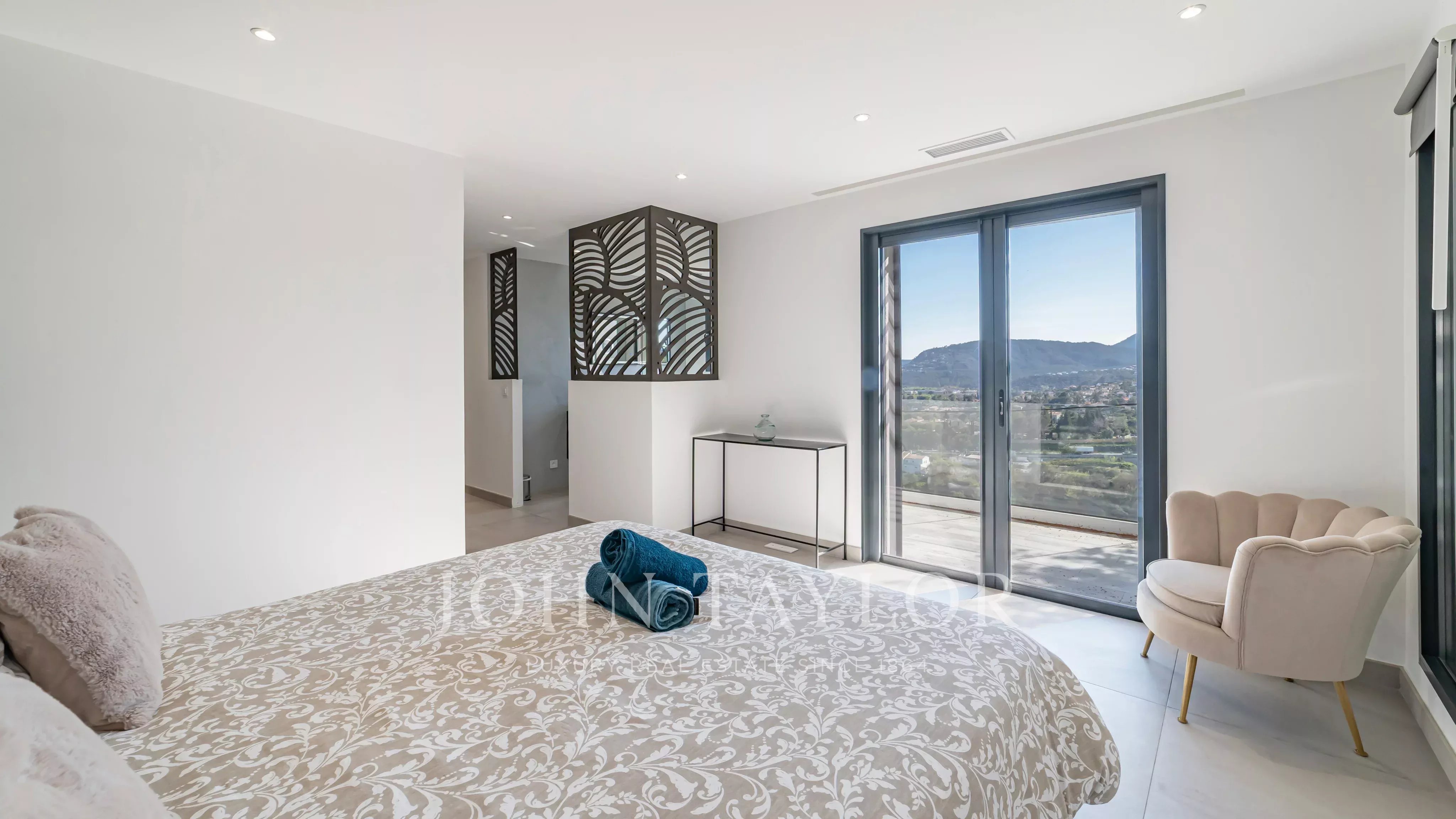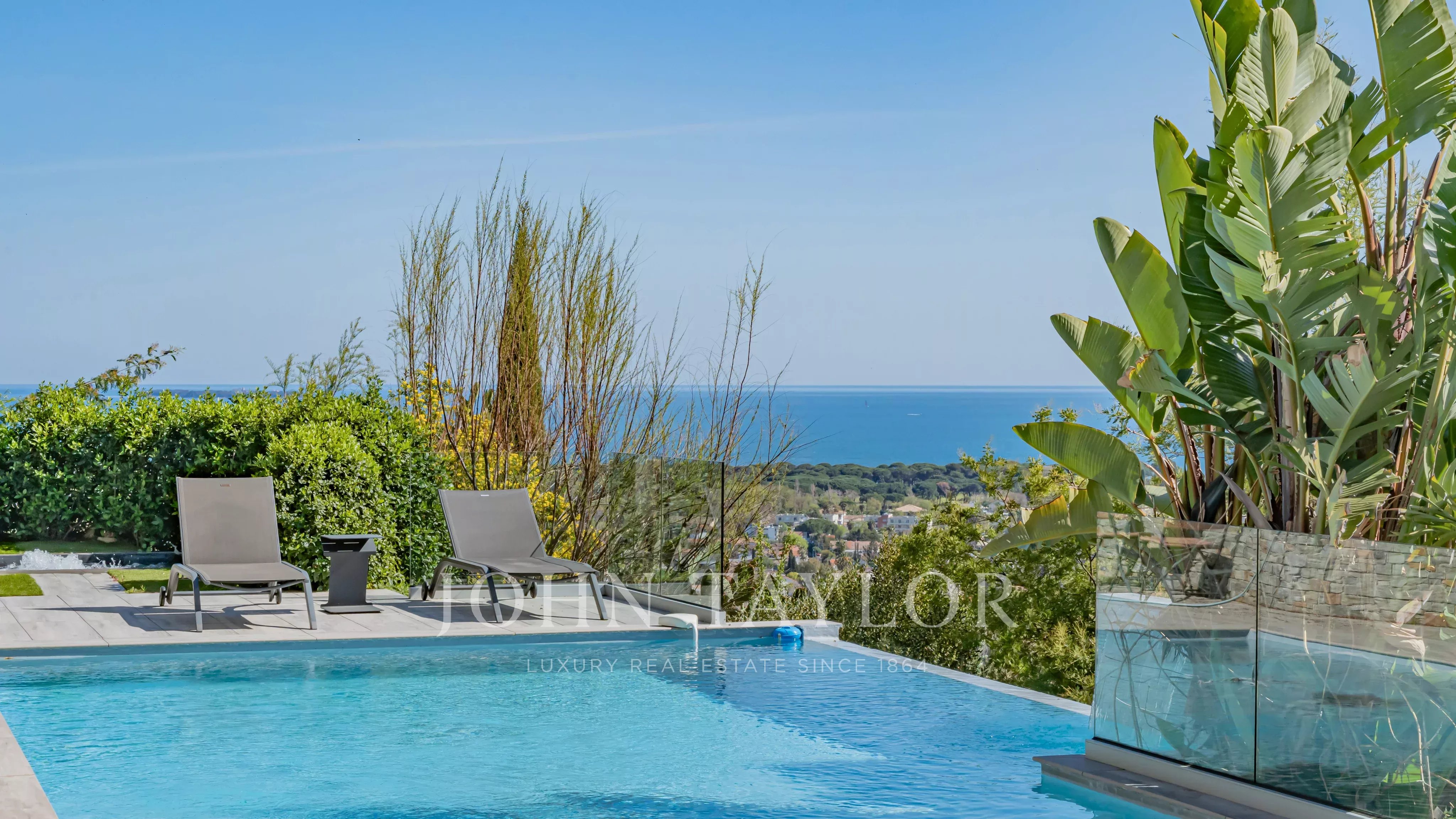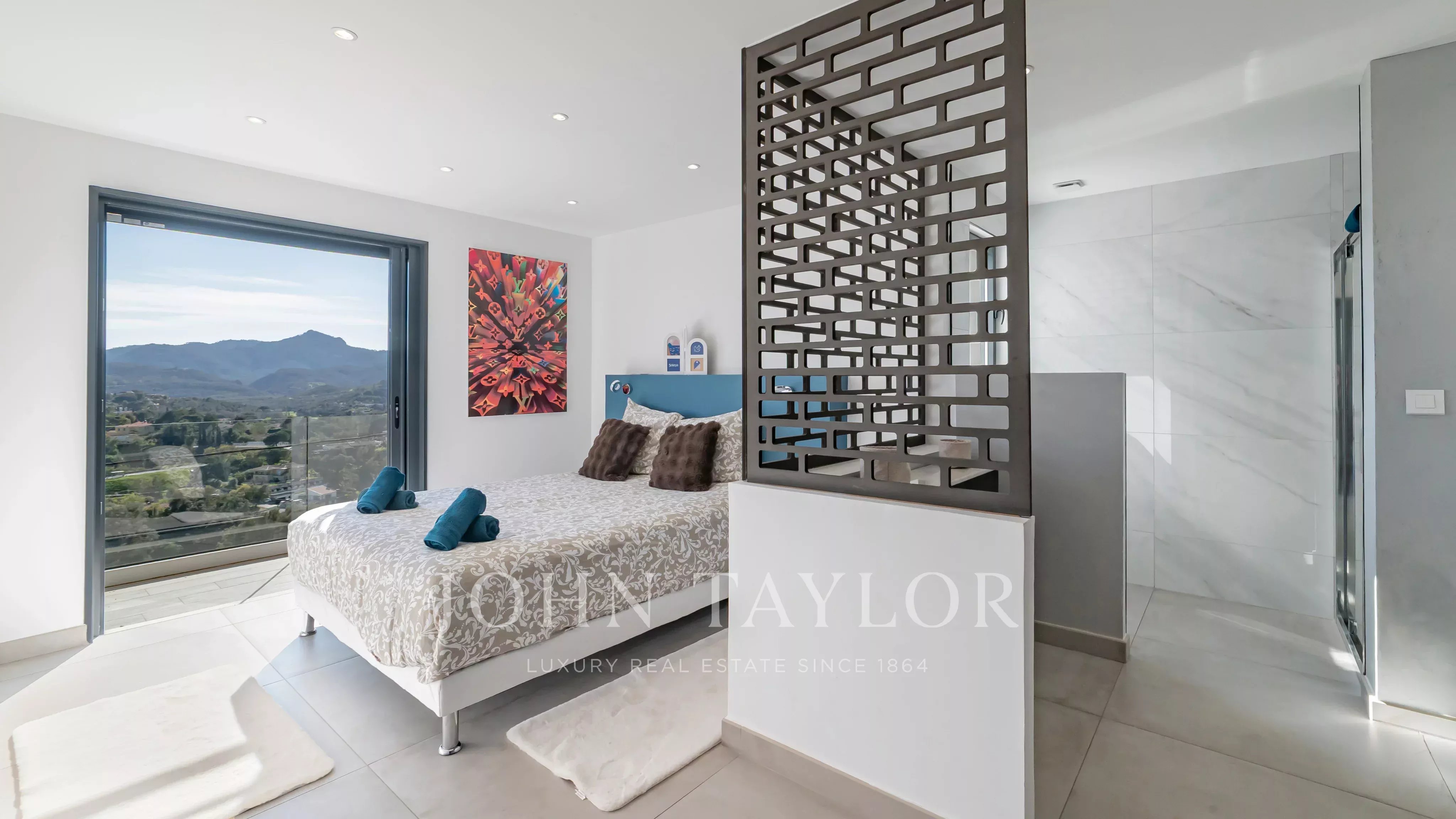 Diese wunderschöne moderne Villa liegt nur 5 Minuten vom Stadtzentrum von Mandelieu entfernt. Sie bietet hochwertige Ausstattungsmerkmale und beeindruckt durch ihre Architektur und den atemberaubenden Blick auf das Meer und die Lérins-Inseln.