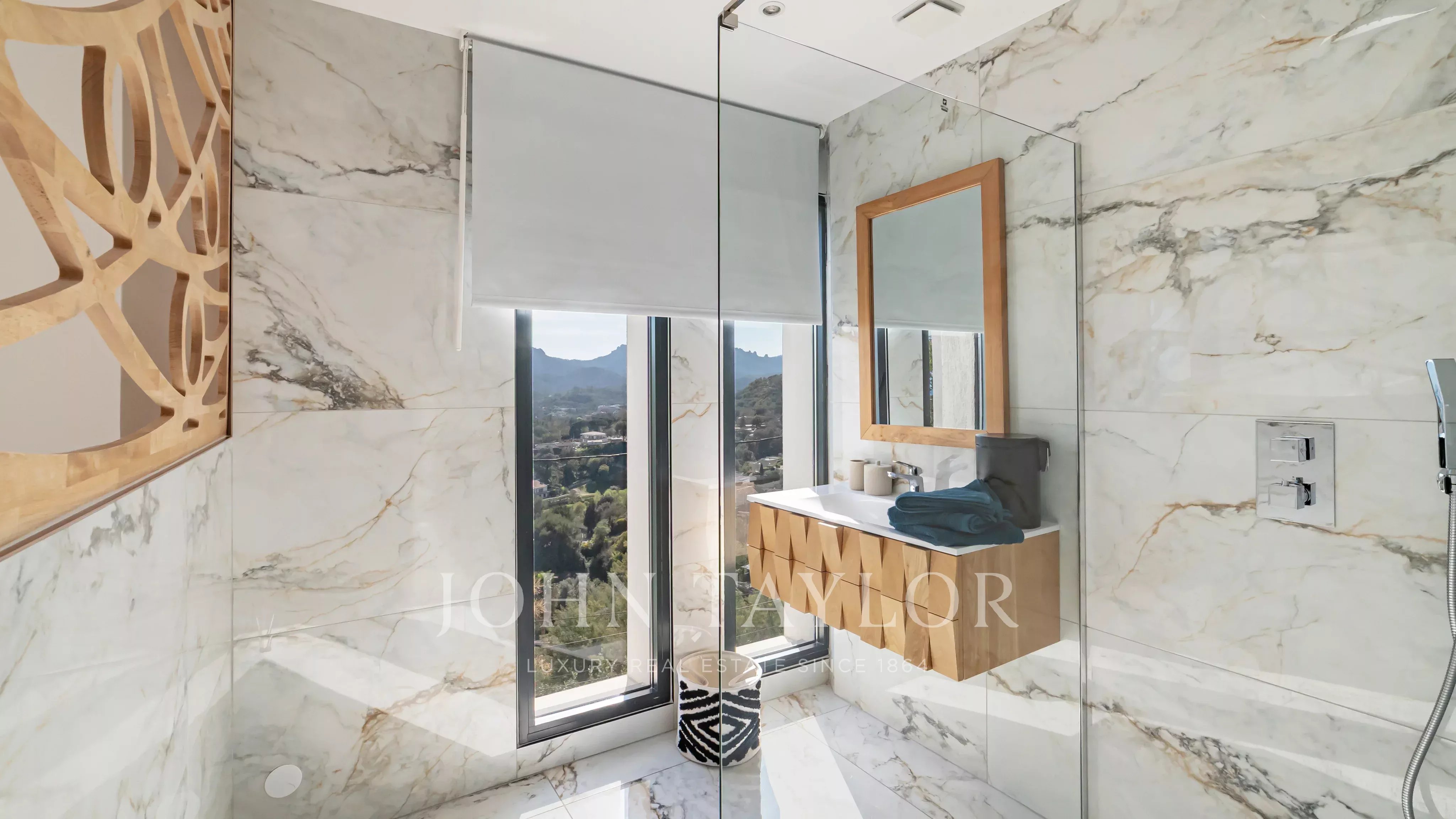 - Majestätisches und helles Wohnzimmer mit einer Deckenhöhe von 5 Metern, das auf eine große Terrasse und einen beheizten Infinity-Pool (11m x 5m) führt,