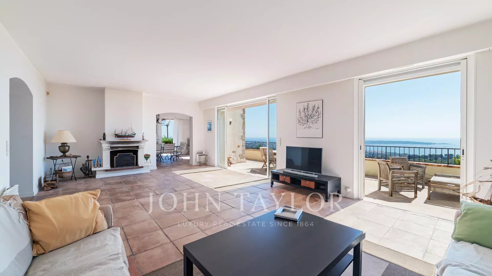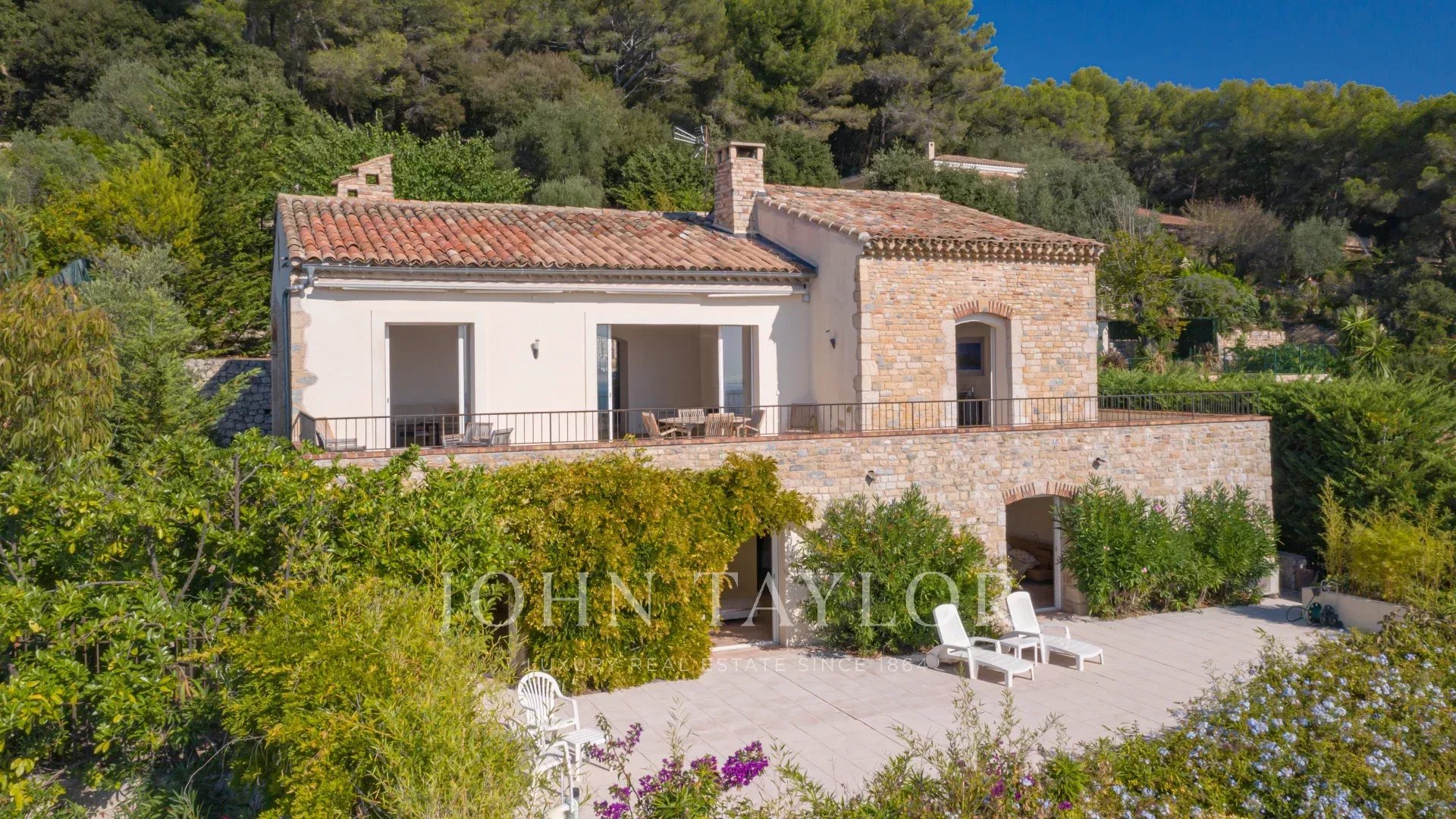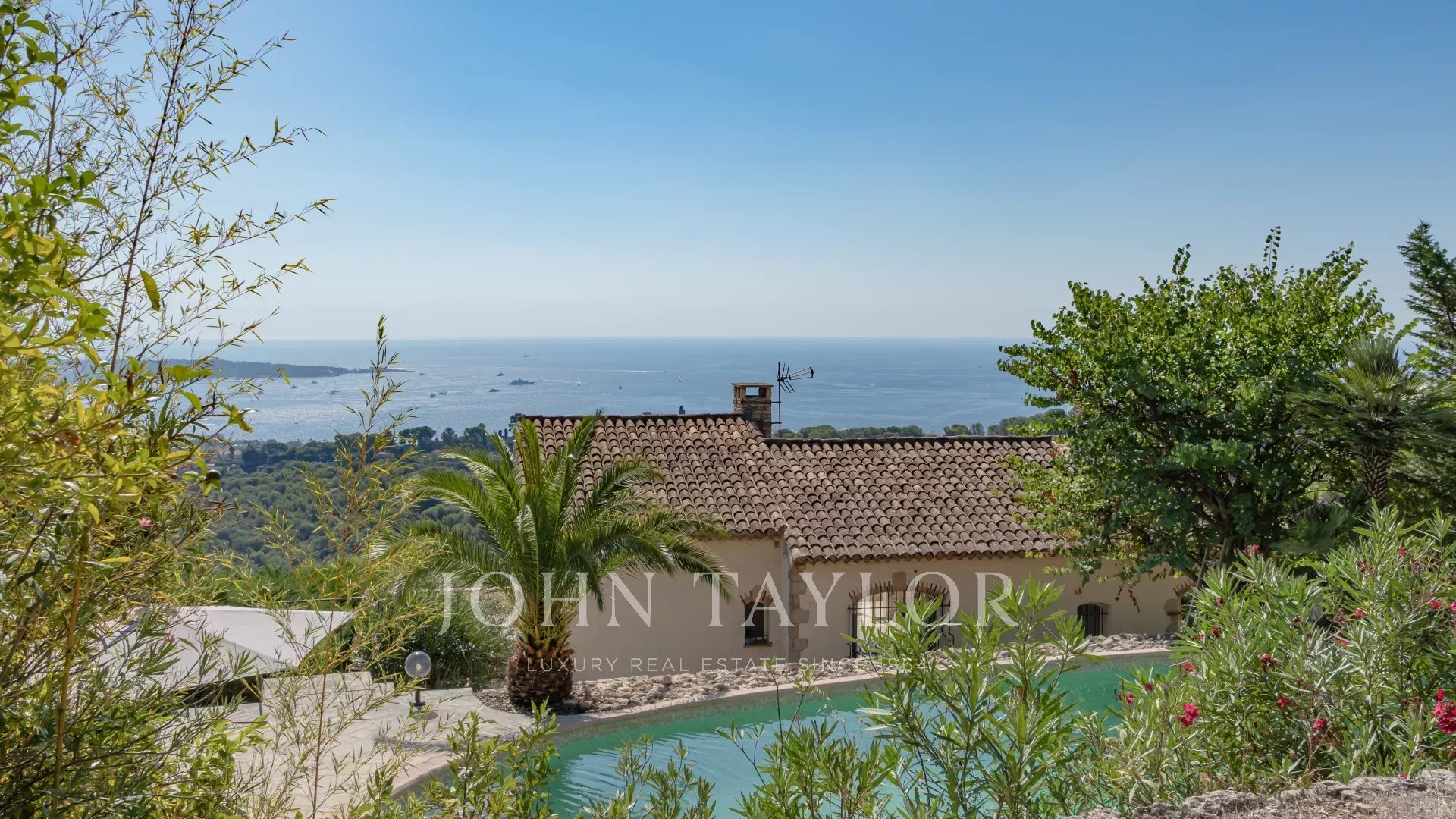 Auf den Anhöhen von Golfe Juan in der Nähe der Achsen bietet diese provenzalische Villa, die auf einem 1820 m² großen Grundstück mit Pool errichtet wurde, ein außergewöhnliches Panorama auf das Meer und Cap d'Antibes.