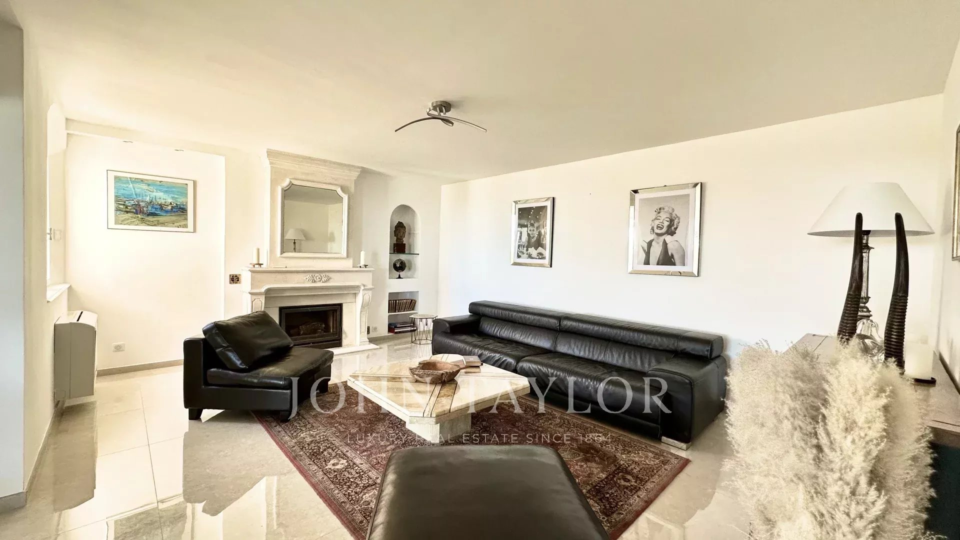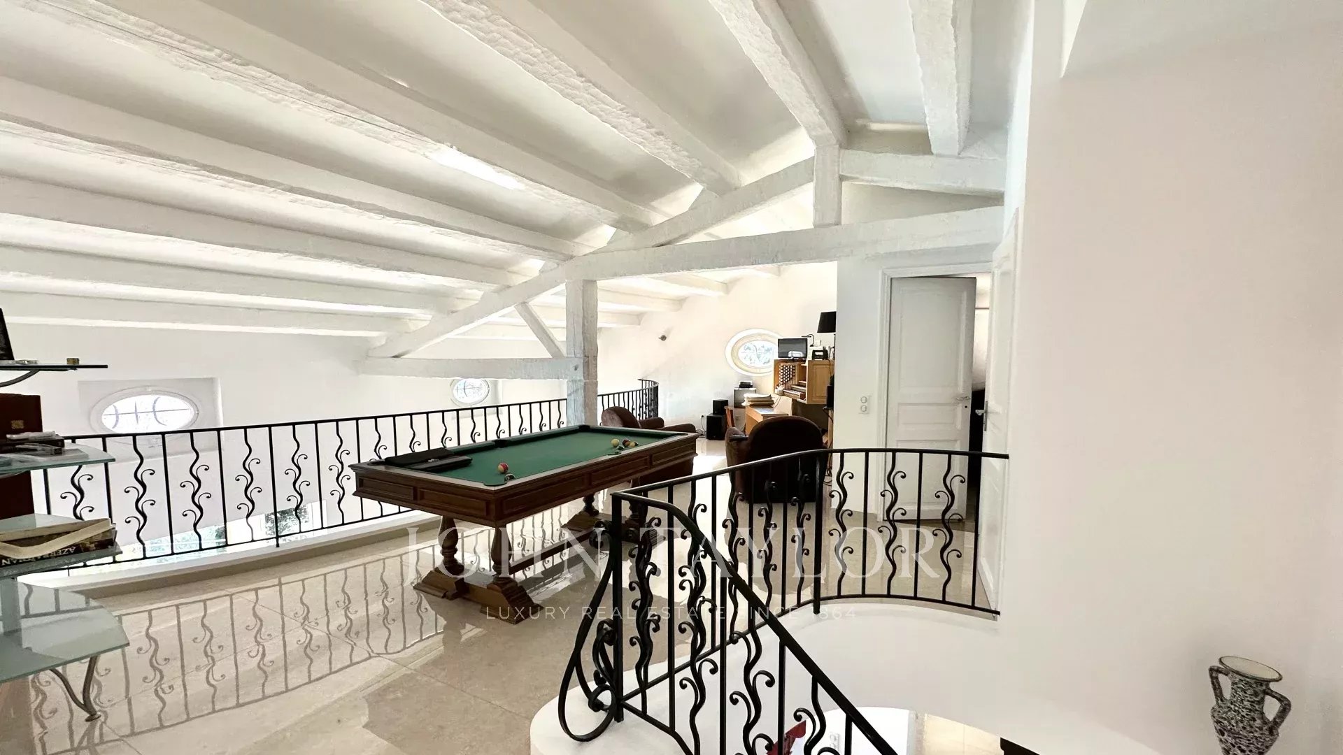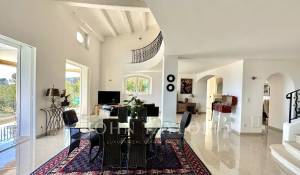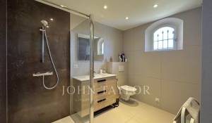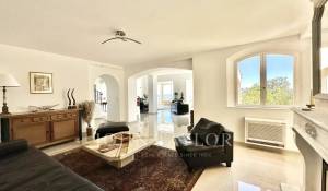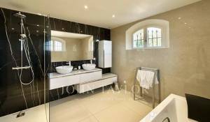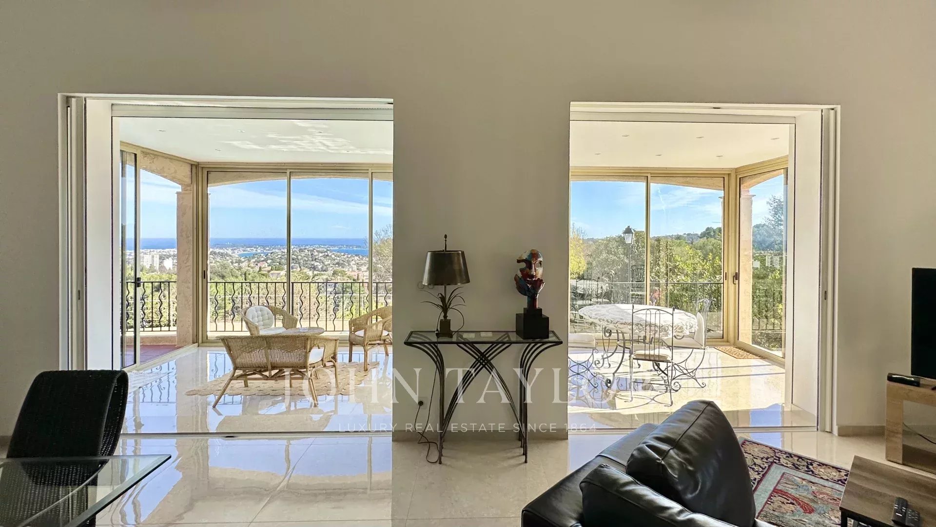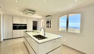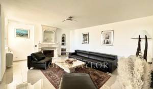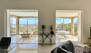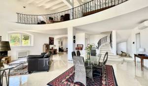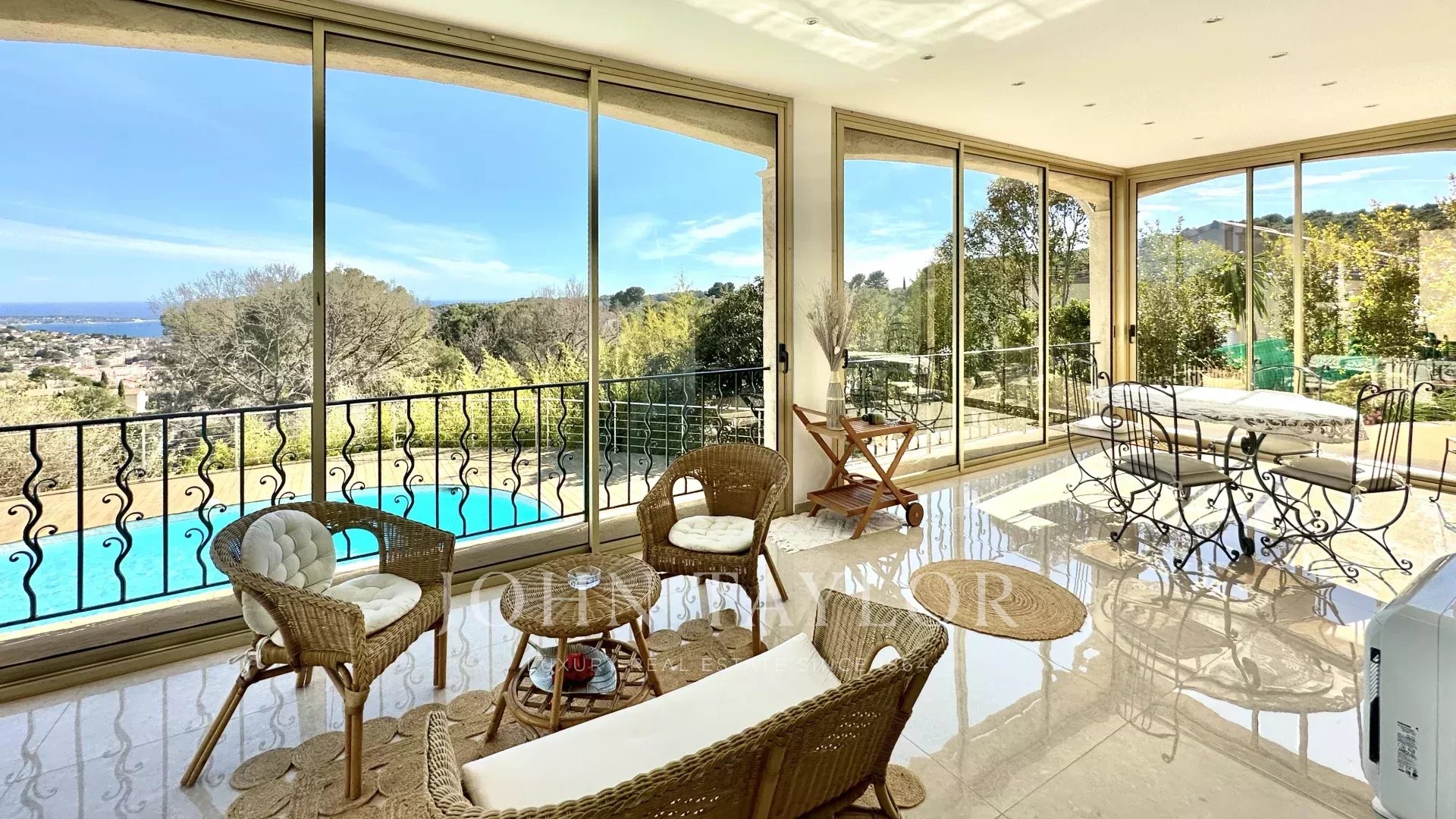 Diese mit schönen Materialien renovierte Villa liegt auf den Anhöhen von Vallauris in einer ruhigen Wohngegend und bietet einen freien Blick auf das Meer, Cap d'Antibes und den Hügel von Super-Cannes.