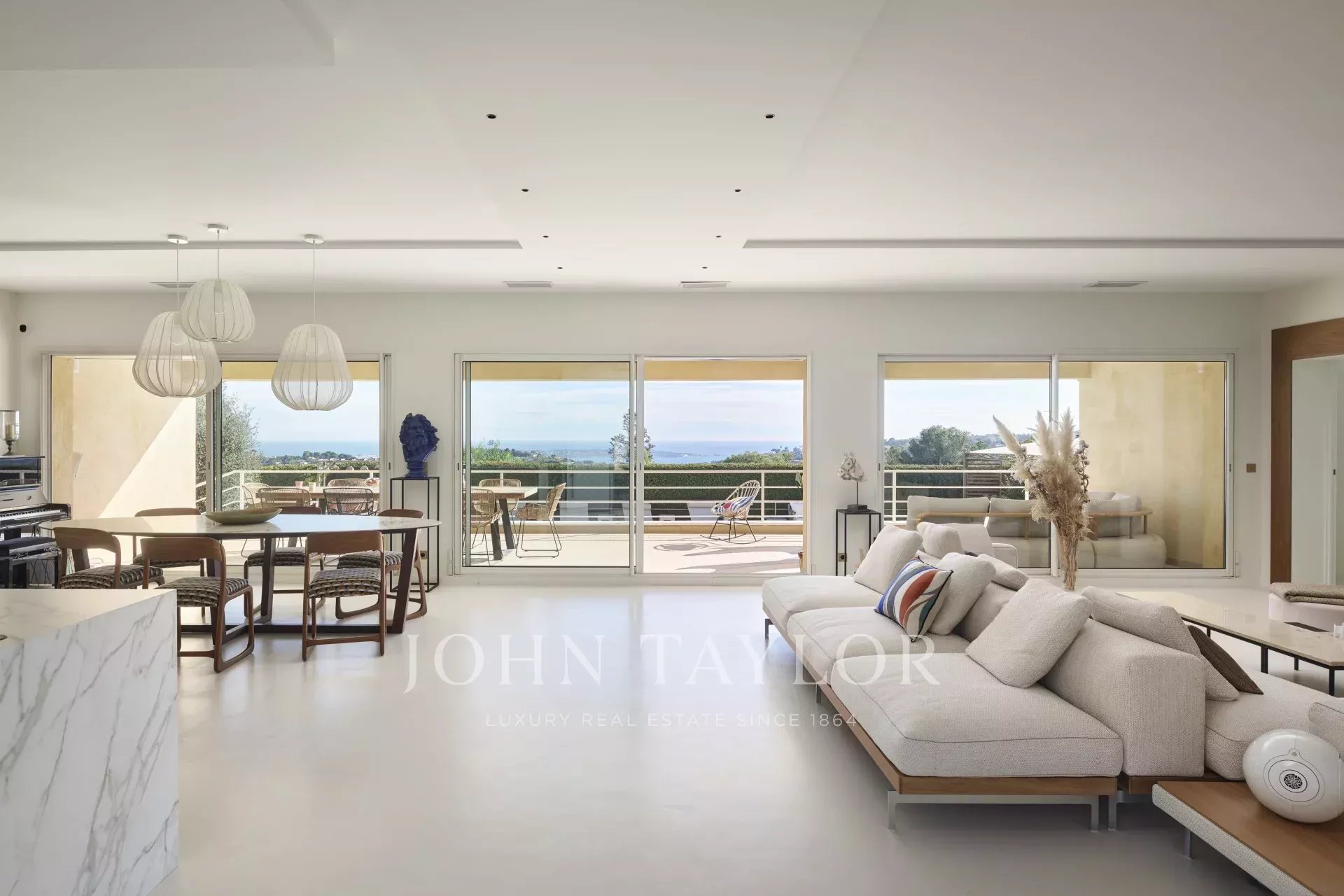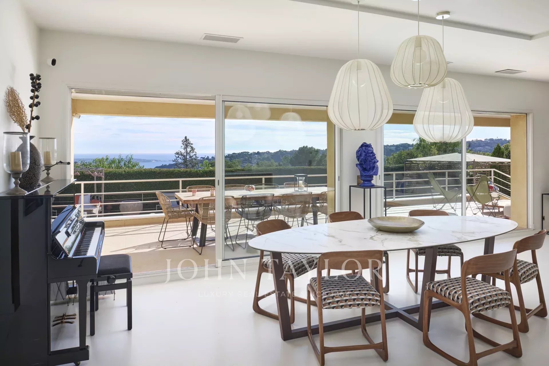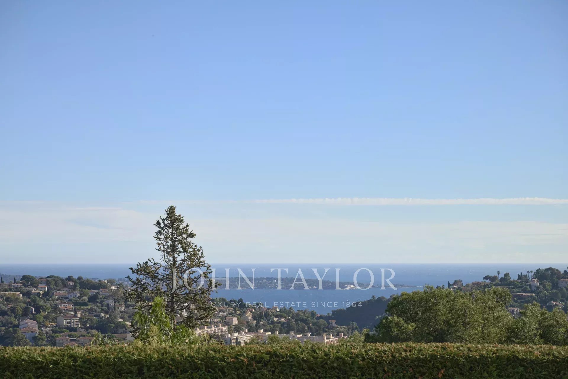 In unmittelbarer Nähe der Verkehrsachsen und des Zentrums von Cannes auf den Anhöhen von Vallauris bietet diese hübsche, moderne, ebenerdige Villa einen Panoramablick auf das Meer, Cap d'Antibes und die Berge.