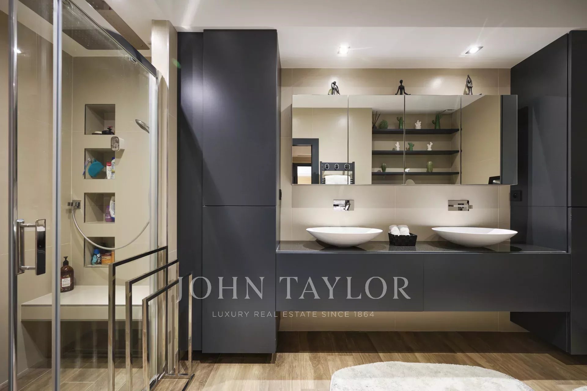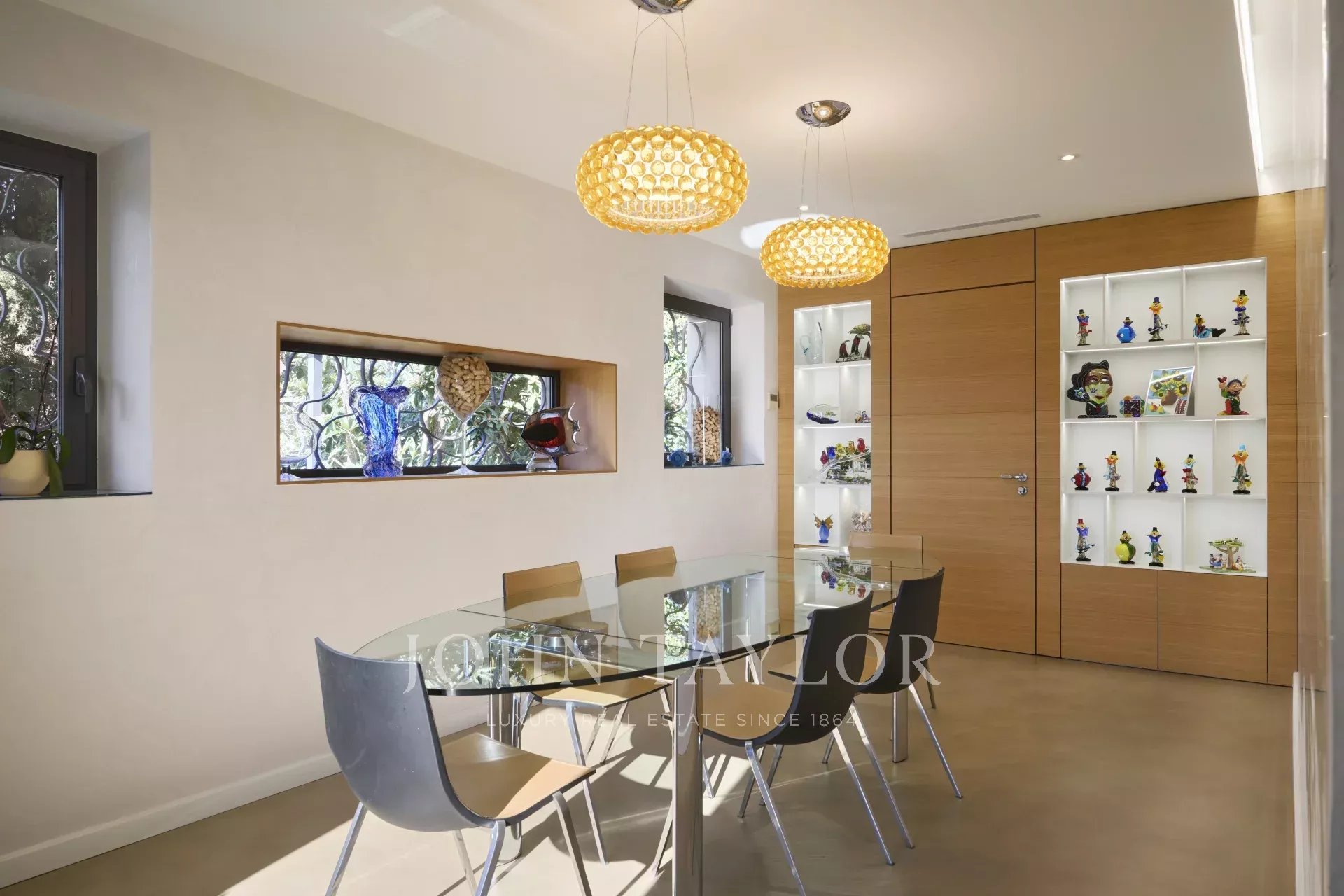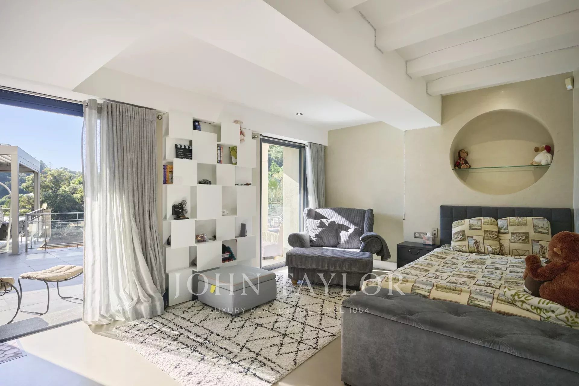 Die Villa ist ca. 250 m² groß und liegt auf einem Grundstück von 2185 m² mit Pool. Im Erdgeschoss befinden sich eine Eingangshalle, eine Gästetoilette, ein Wohnzimmer mit Zugang zu einer überdachten Terrasse, ein Esszimmer, eine Küche sowie ein Hauptschlafzimmer mit Badezimmer und Ankleidezimmer. Im Gartengeschoss befinden sich drei große Schlafzimmer mit jeweiligen Badezimmern.