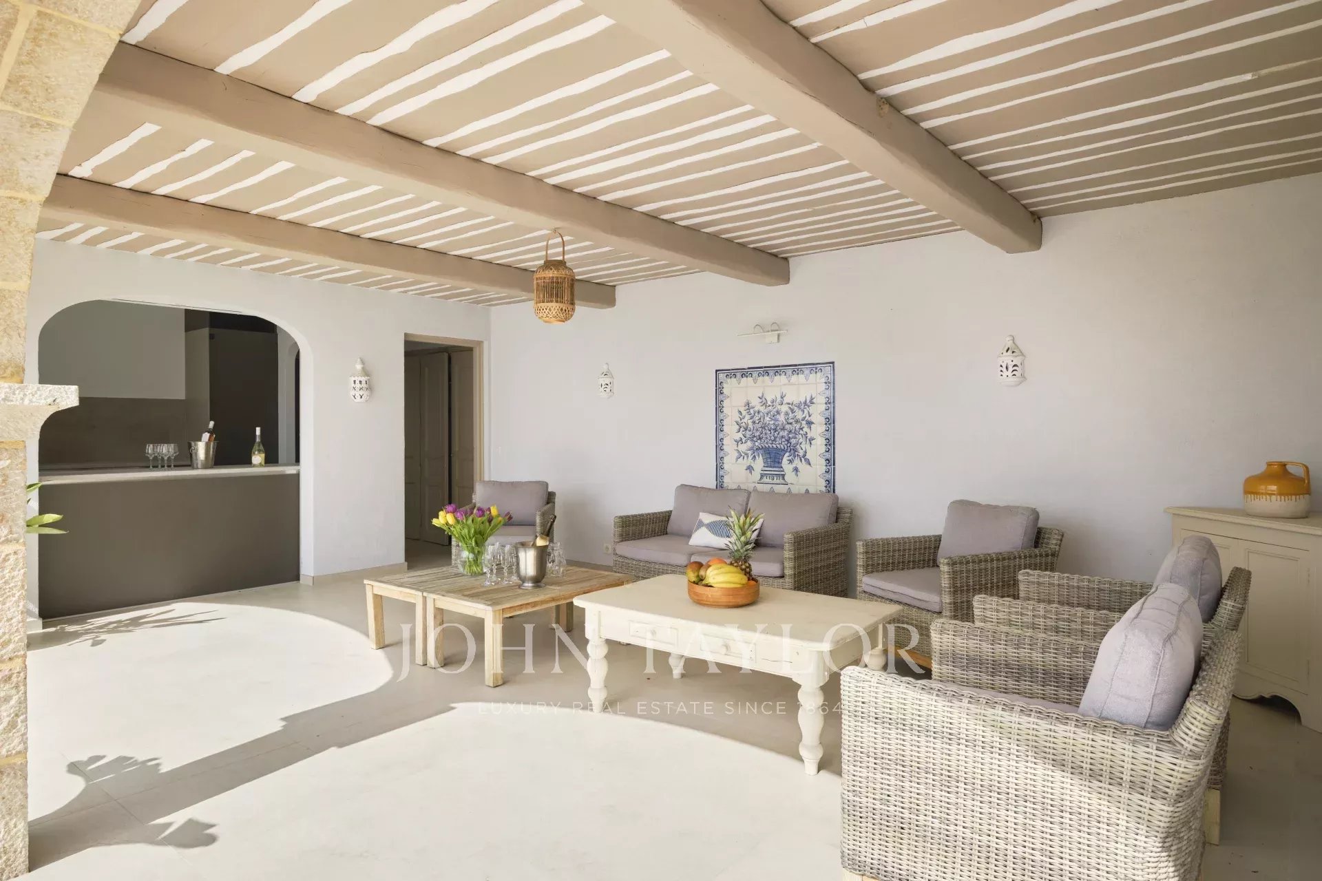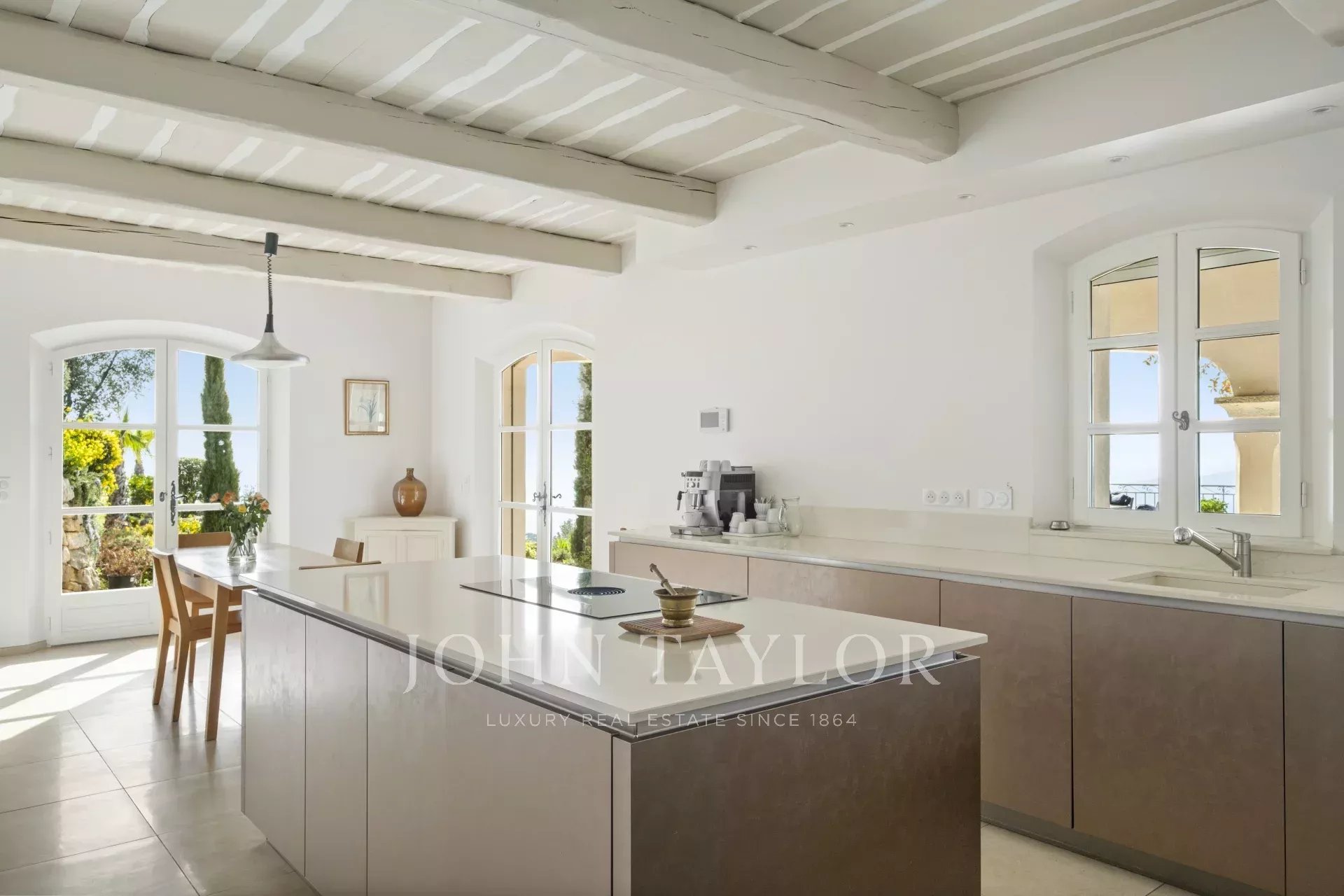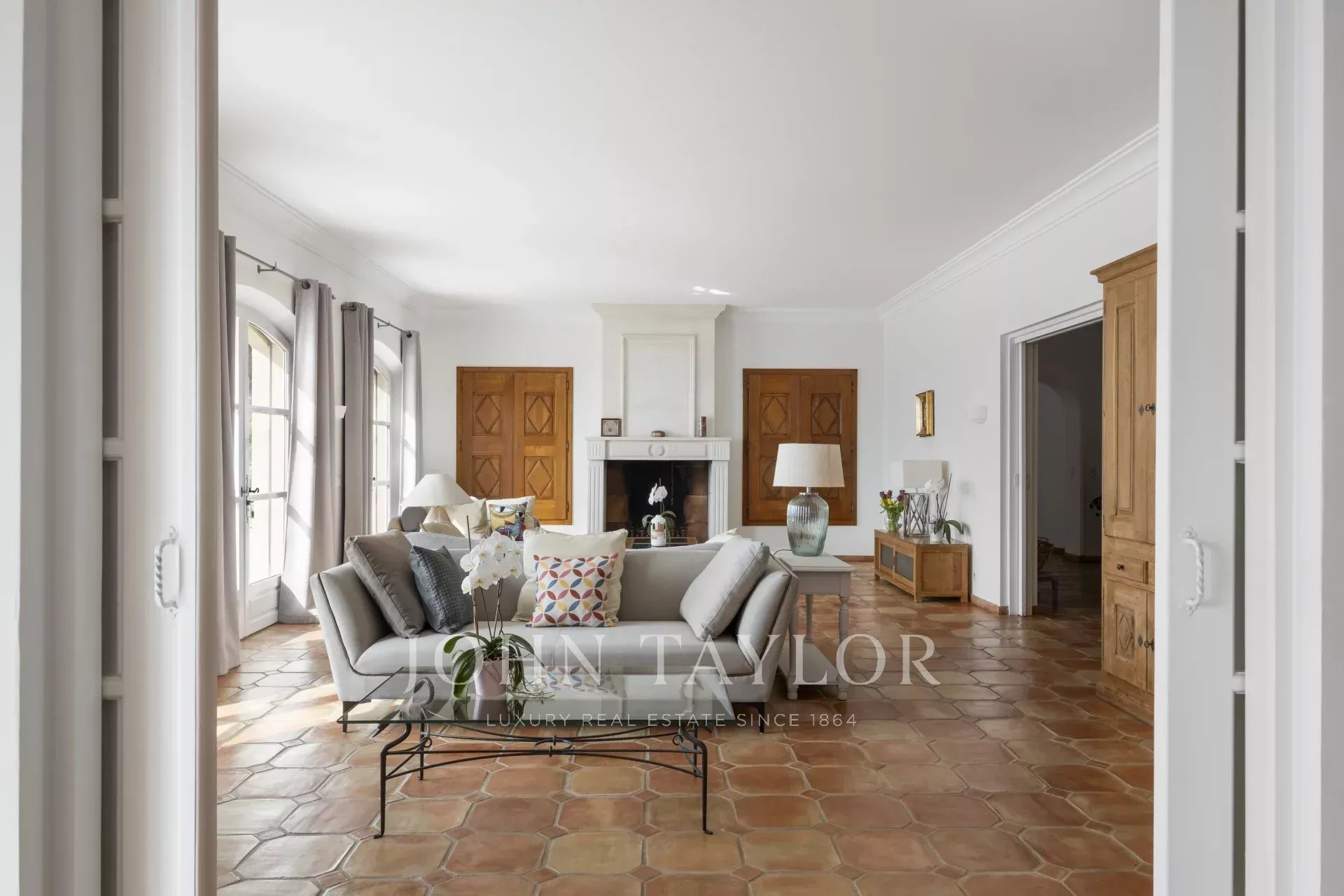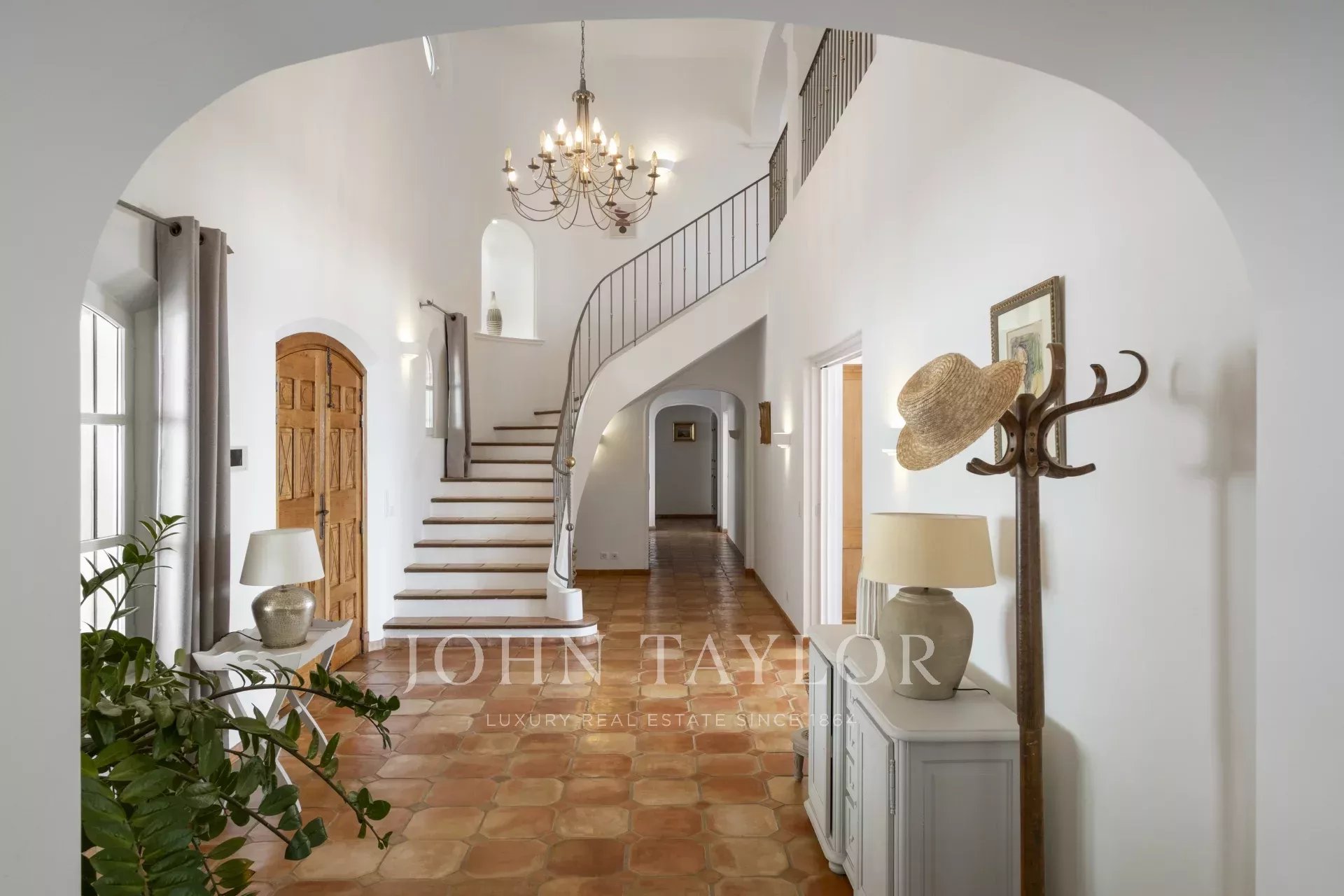 Eine großartige Eingangshalle mit doppelter Deckenhöhe führt in das weitläufige Wohn-/Esszimmer, mit elegantem Kamin und großen Panoramafenstern, die sich zu einer riesigen Terrasse öffnen. Die charmante provenzalische Küche mit großem Kamin bietet einen geselligen Raum für Familienmahlzeiten. Auf derselben Ebene finden Sie auch ein Arbeitszimmer, zwei Schlafzimmer, darunter eine Mastersuite mit hübschem Badezimmer, Ankleideraum und eigener privater Terrasse, sowie einen Hauswirtschaftsraum, Abstellraum und Garderobe.