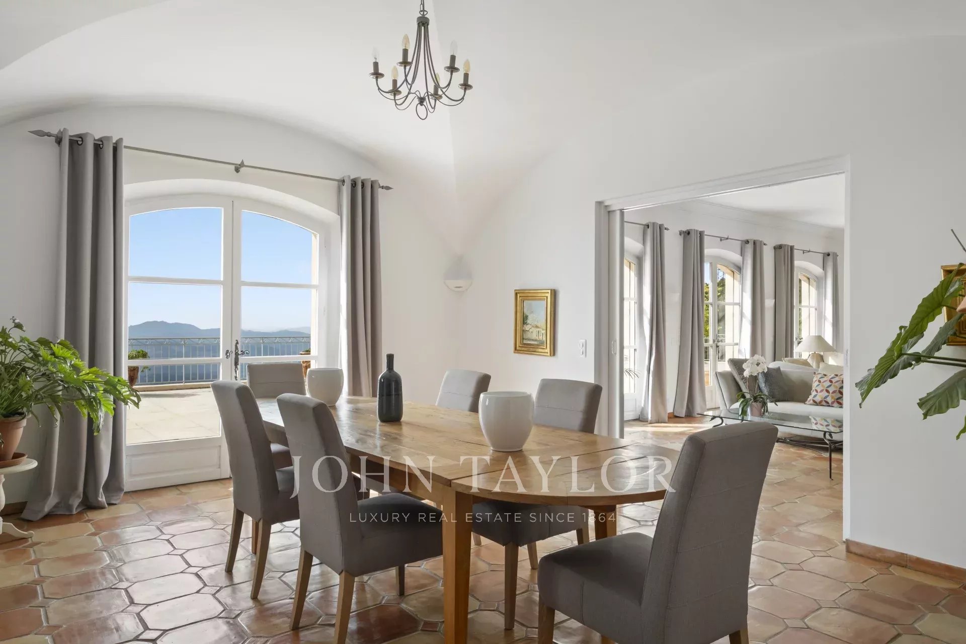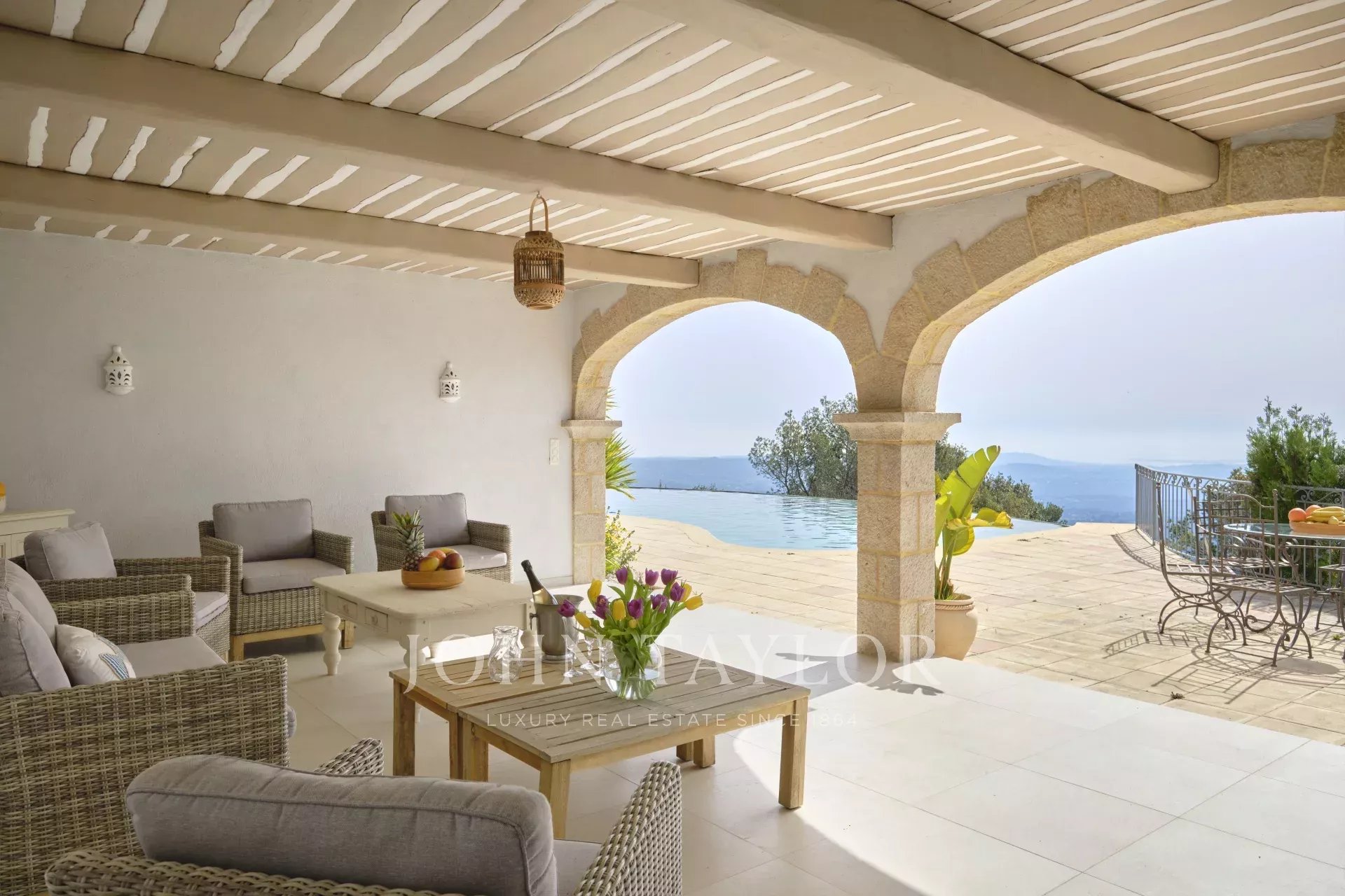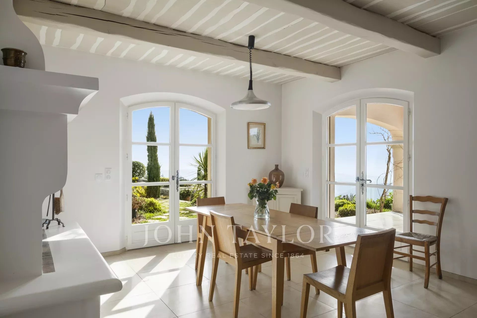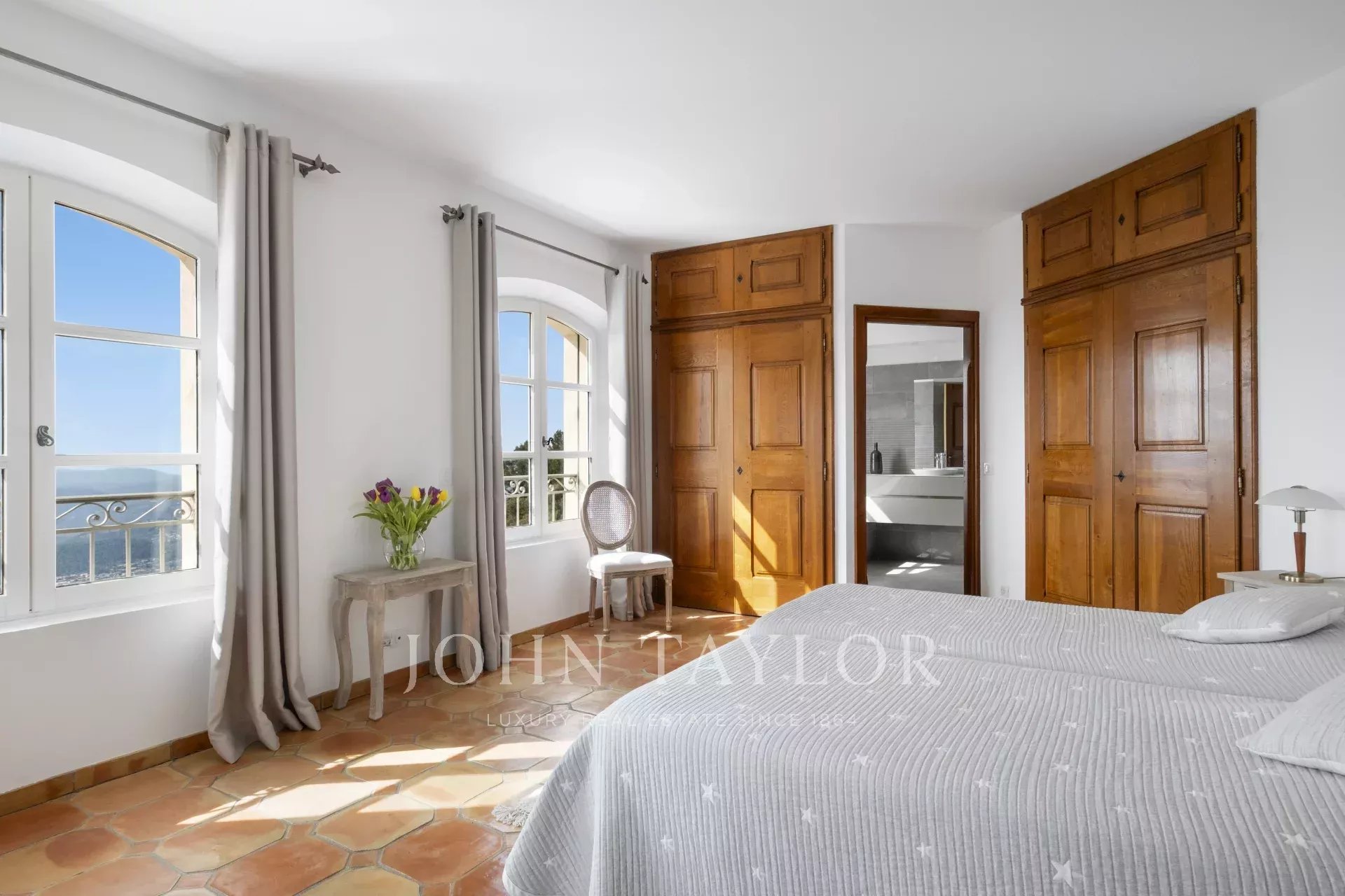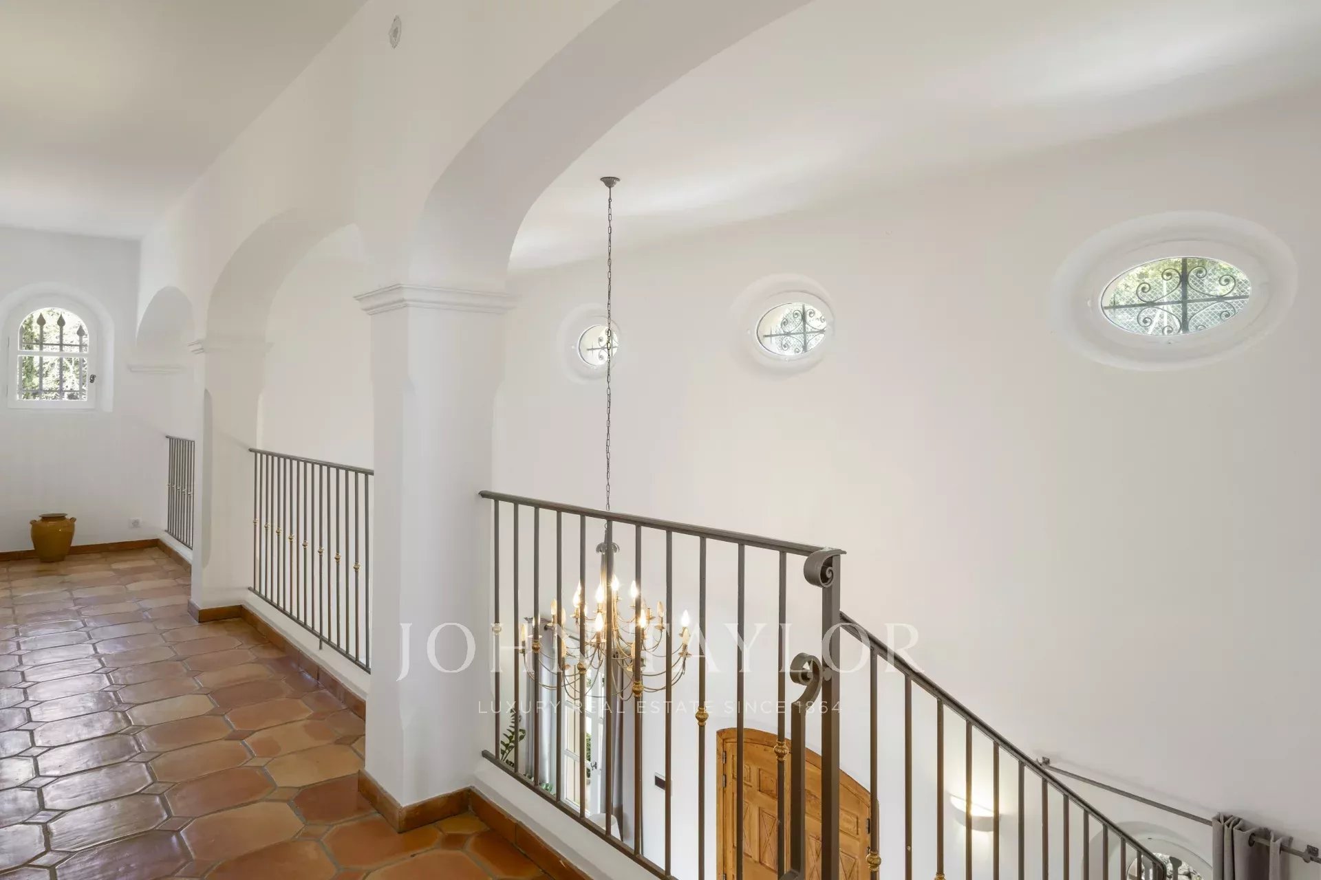 Eine großartige Eingangshalle mit doppelter Deckenhöhe führt in das weitläufige Wohn-/Esszimmer, mit elegantem Kamin und großen Panoramafenstern, die sich zu einer riesigen Terrasse öffnen. Die charmante provenzalische Küche mit großem Kamin bietet einen geselligen Raum für Familienmahlzeiten. Auf derselben Ebene finden Sie auch ein Arbeitszimmer, zwei Schlafzimmer, darunter eine Mastersuite mit hübschem Badezimmer, Ankleideraum und eigener privater Terrasse, sowie einen Hauswirtschaftsraum, Abstellraum und Garderobe.