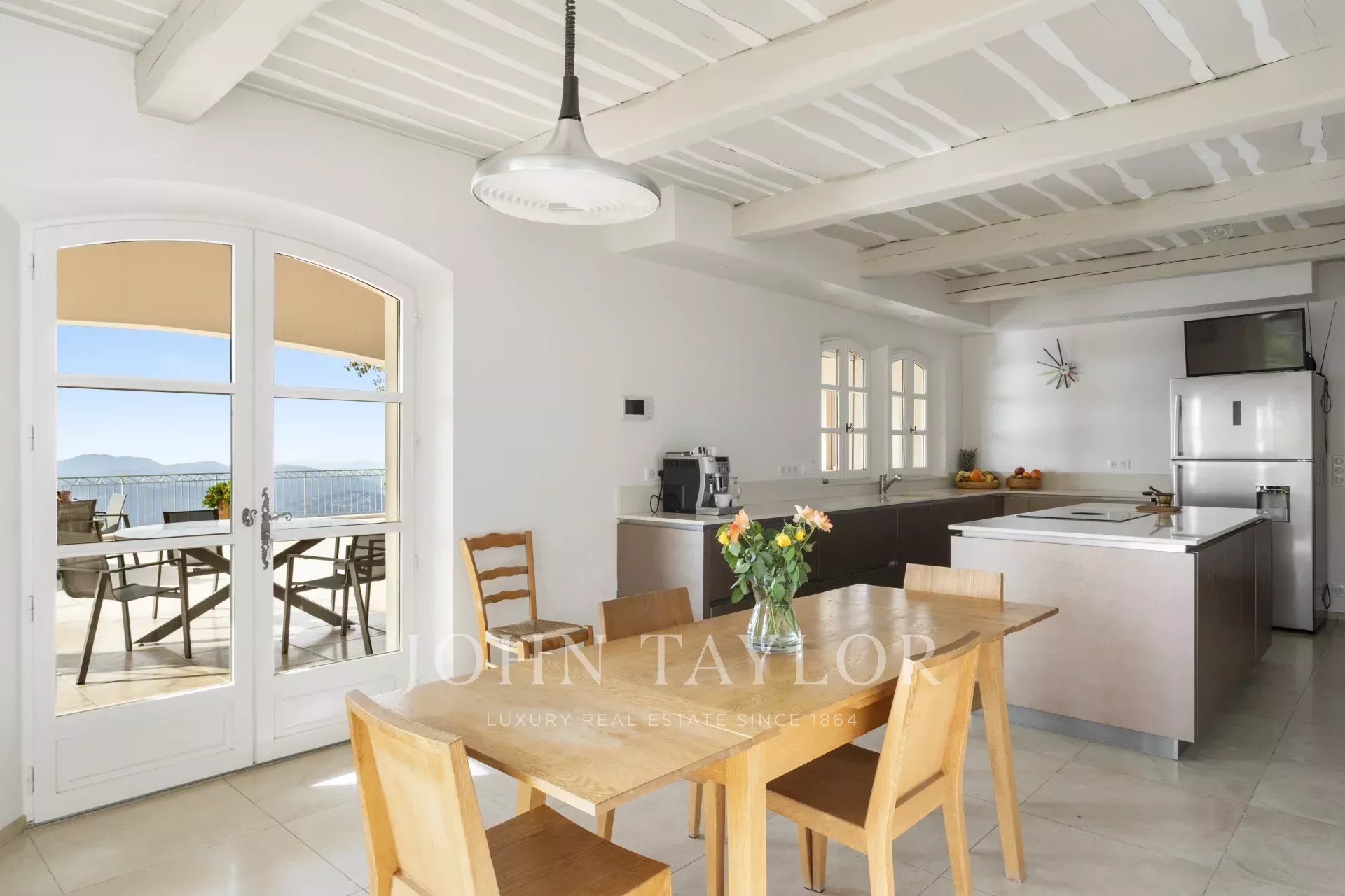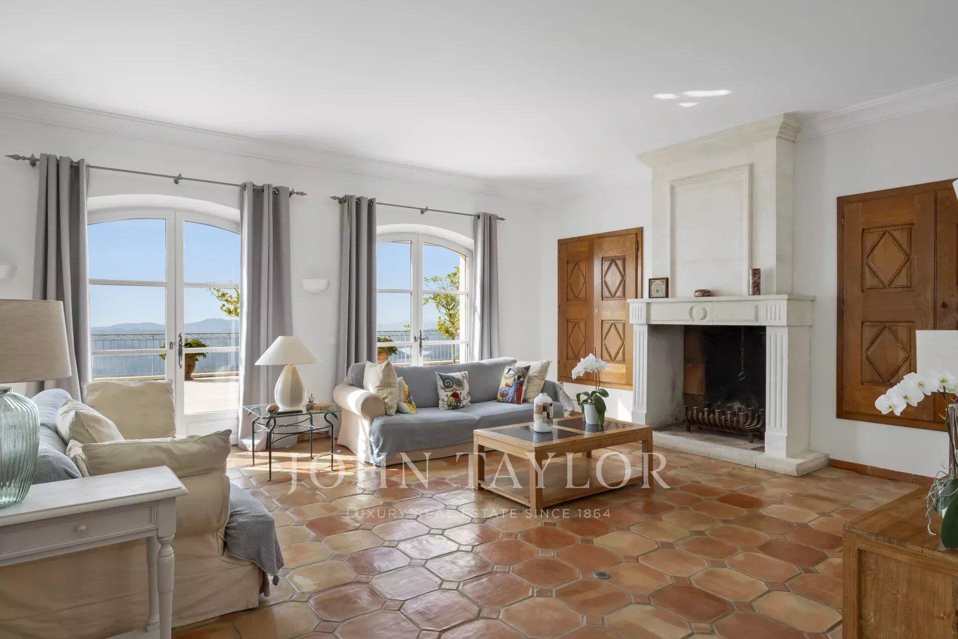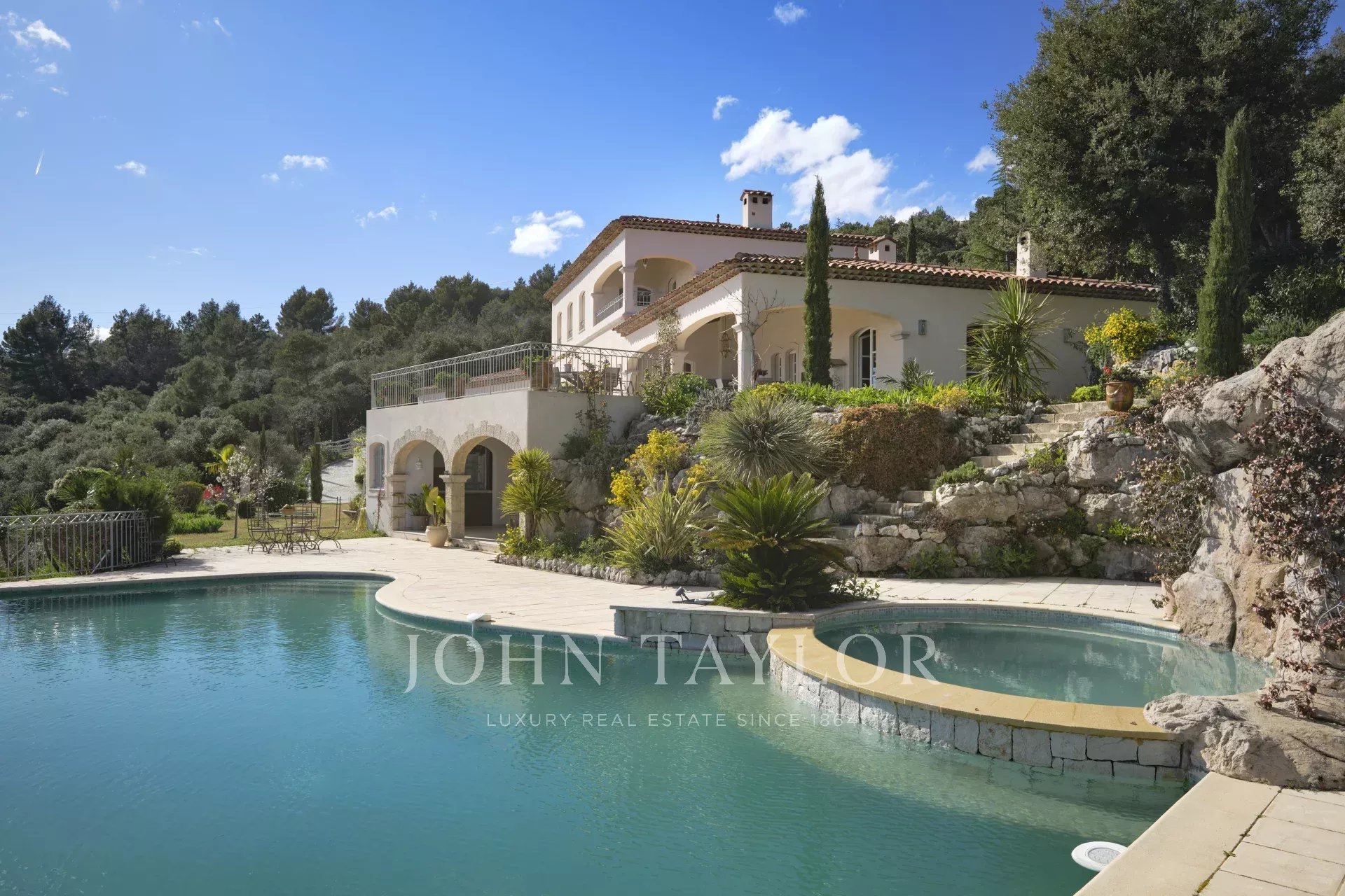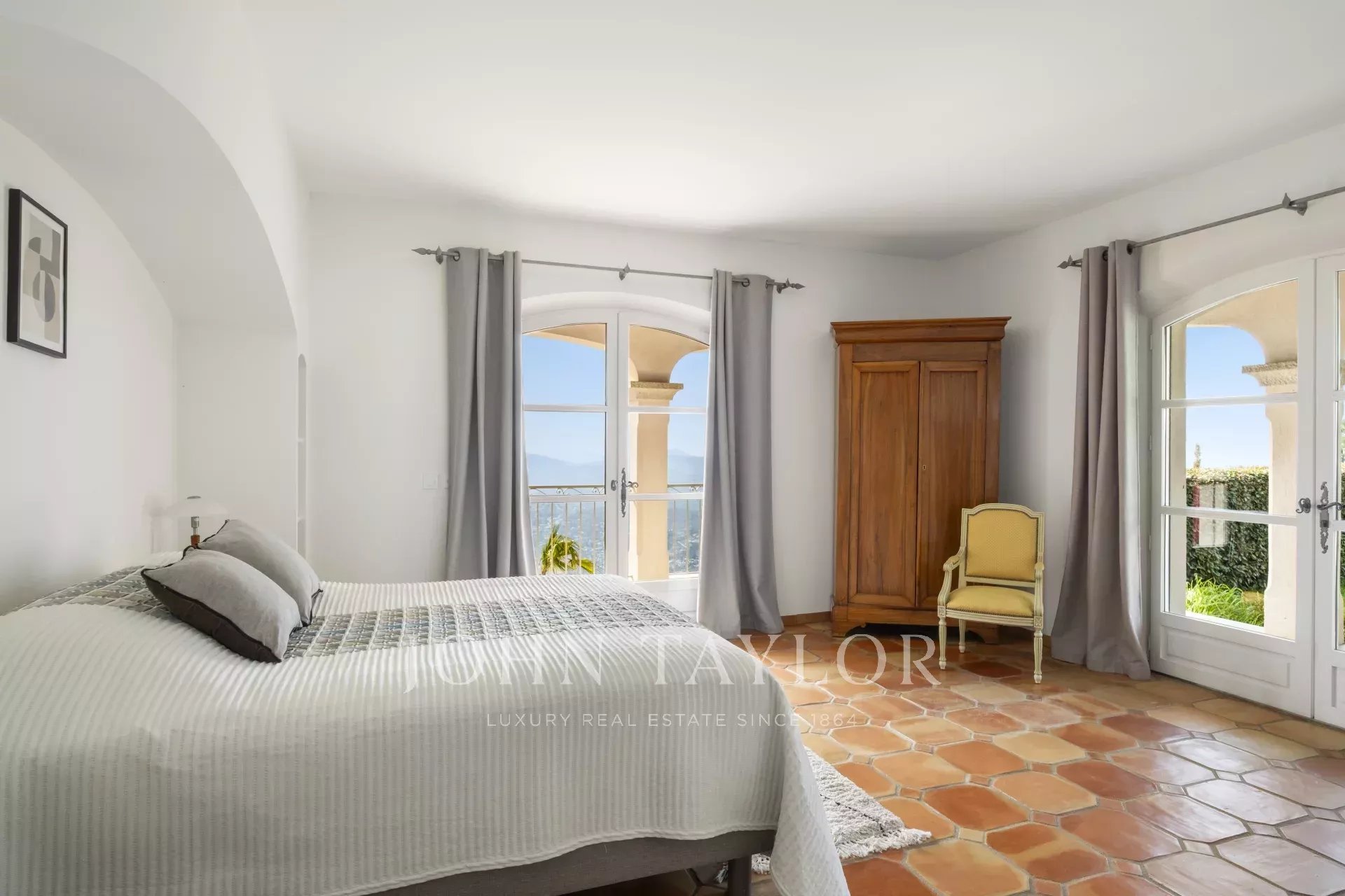 Eine großartige Eingangshalle mit doppelter Deckenhöhe führt in das weitläufige Wohn-/Esszimmer, mit elegantem Kamin und großen Panoramafenstern, die sich zu einer riesigen Terrasse öffnen. Die charmante provenzalische Küche mit großem Kamin bietet einen geselligen Raum für Familienmahlzeiten. Auf derselben Ebene finden Sie auch ein Arbeitszimmer, zwei Schlafzimmer, darunter eine Mastersuite mit hübschem Badezimmer, Ankleideraum und eigener privater Terrasse, sowie einen Hauswirtschaftsraum, Abstellraum und Garderobe.