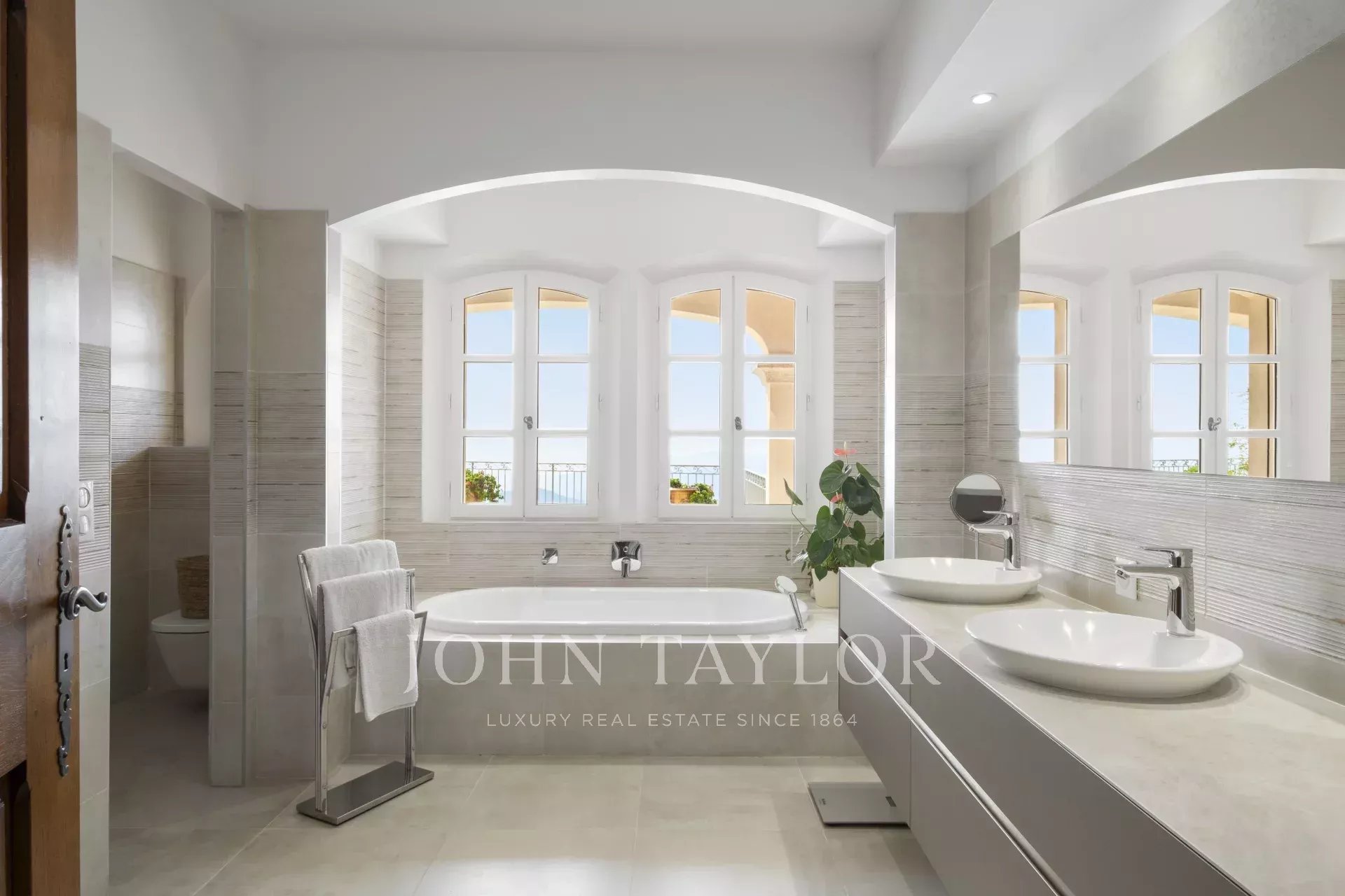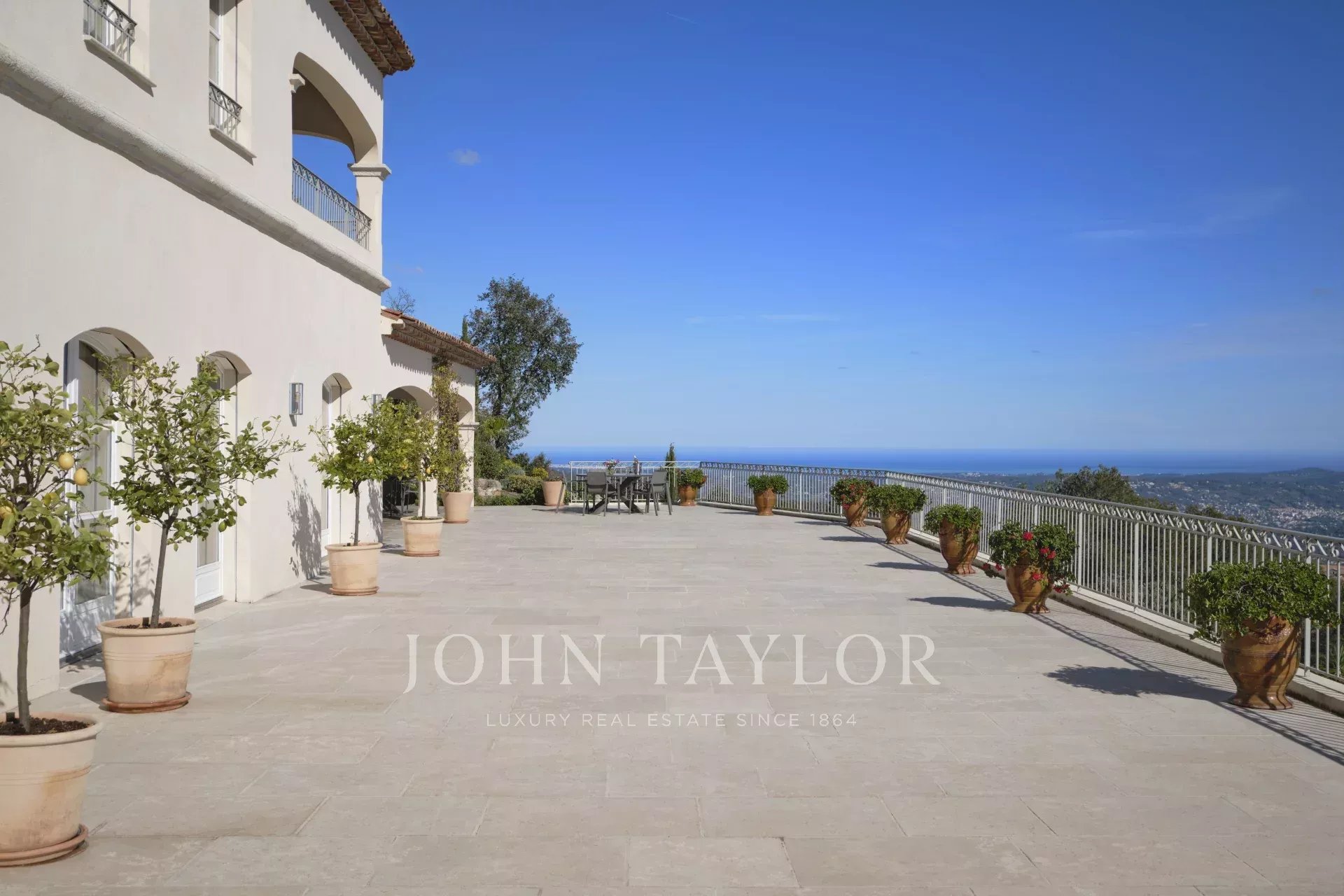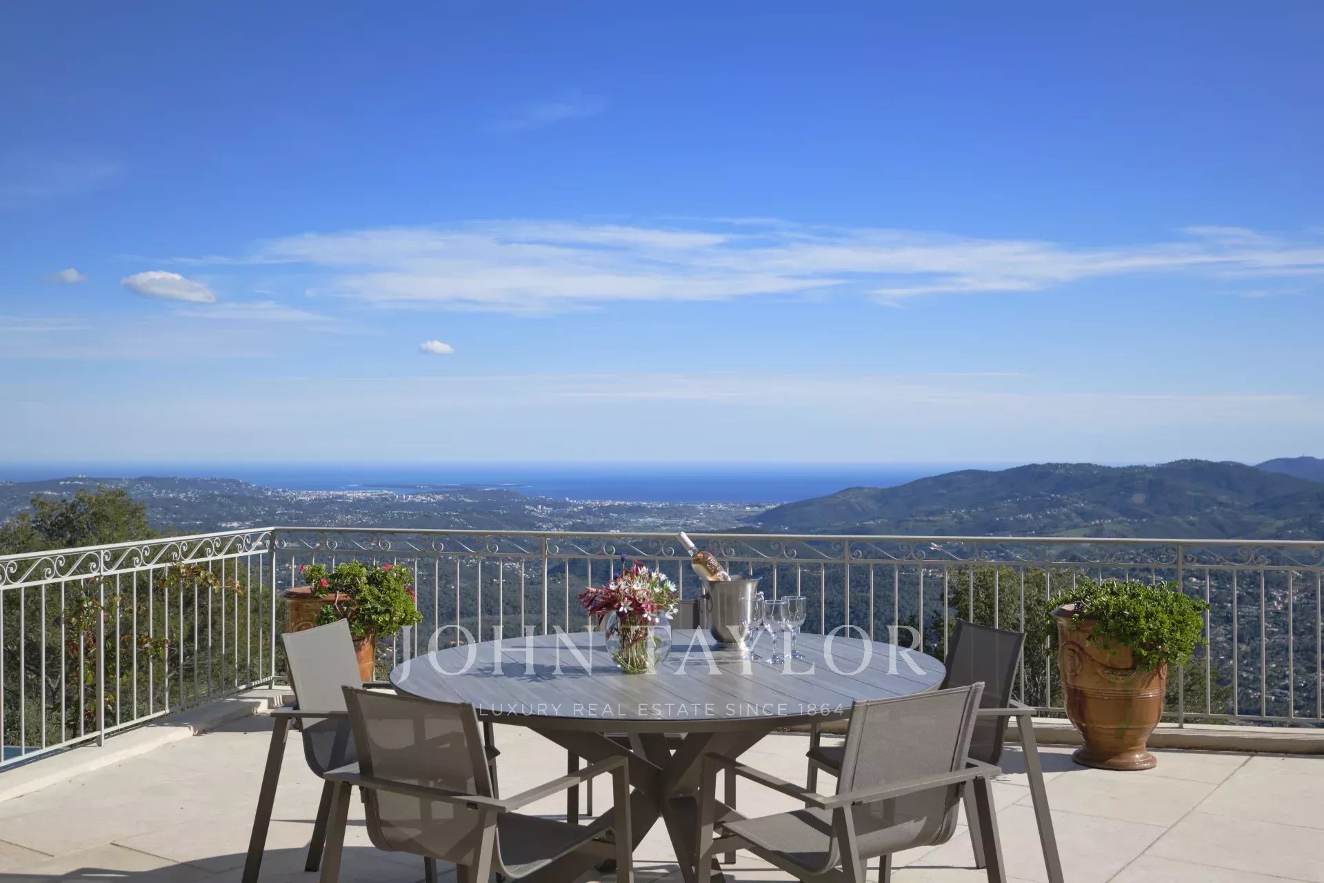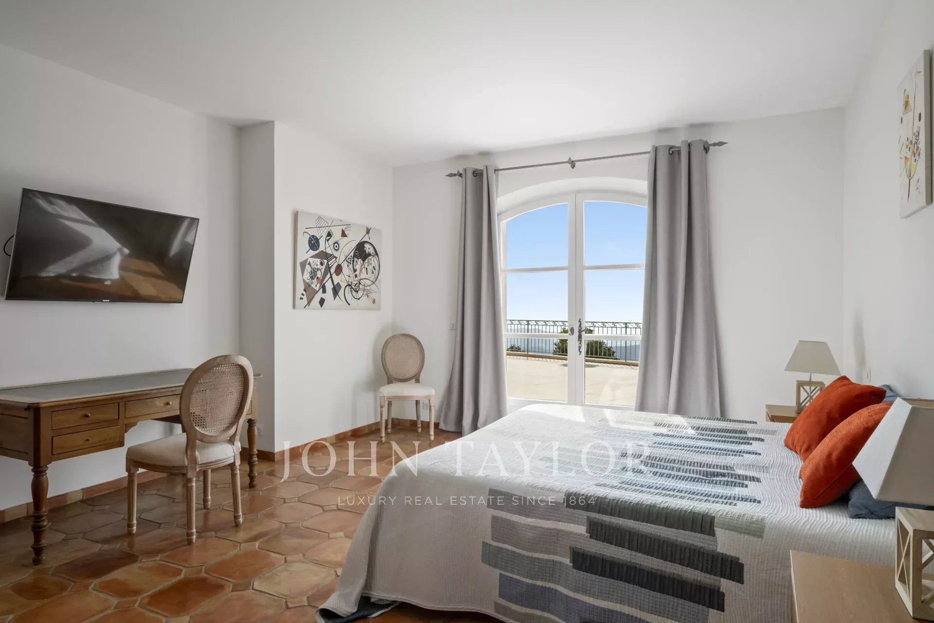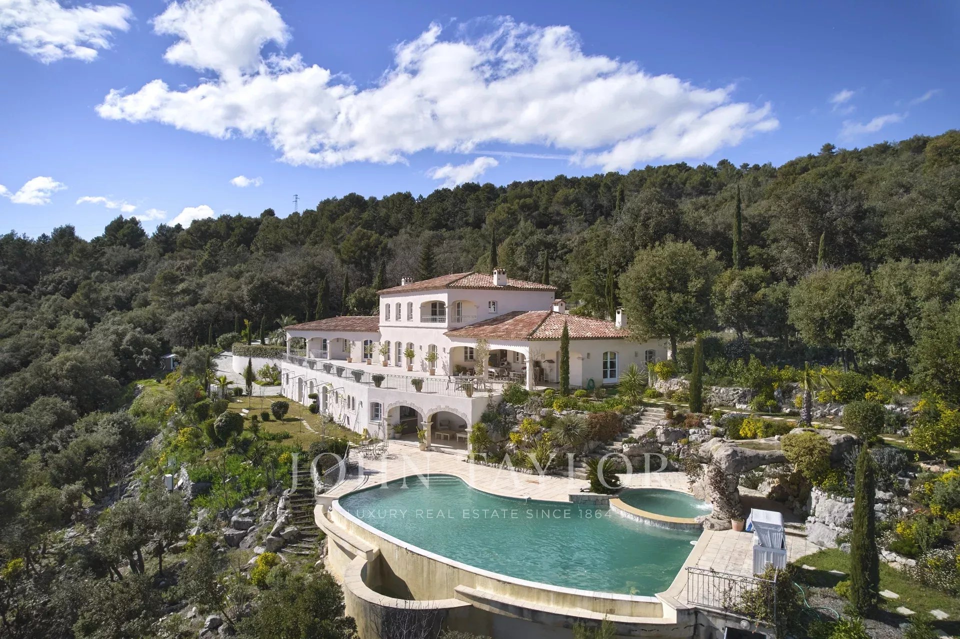 Eine großartige Eingangshalle mit doppelter Deckenhöhe führt in das weitläufige Wohn-/Esszimmer, mit elegantem Kamin und großen Panoramafenstern, die sich zu einer riesigen Terrasse öffnen. Die charmante provenzalische Küche mit großem Kamin bietet einen geselligen Raum für Familienmahlzeiten. Auf derselben Ebene finden Sie auch ein Arbeitszimmer, zwei Schlafzimmer, darunter eine Mastersuite mit hübschem Badezimmer, Ankleideraum und eigener privater Terrasse, sowie einen Hauswirtschaftsraum, Abstellraum und Garderobe.